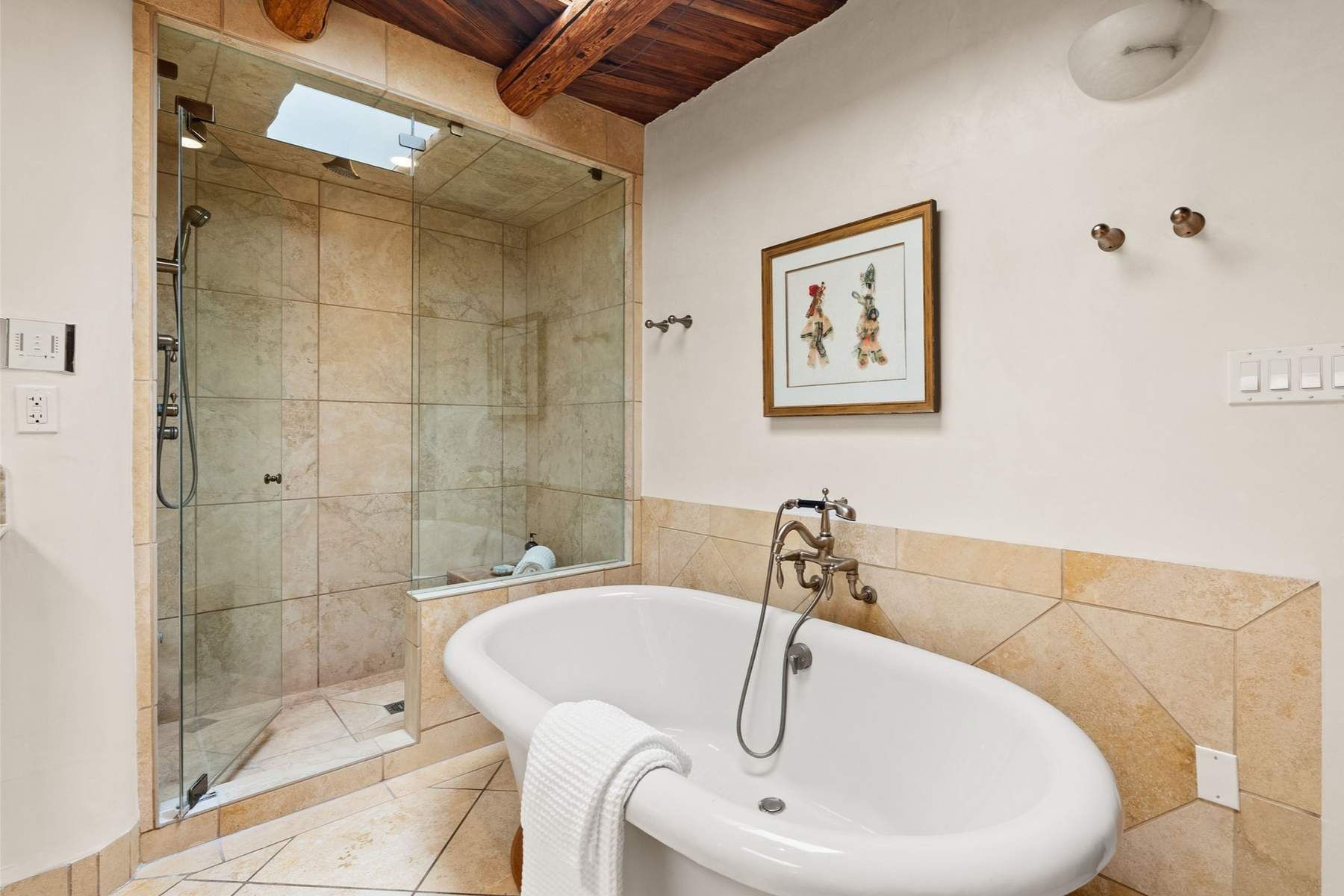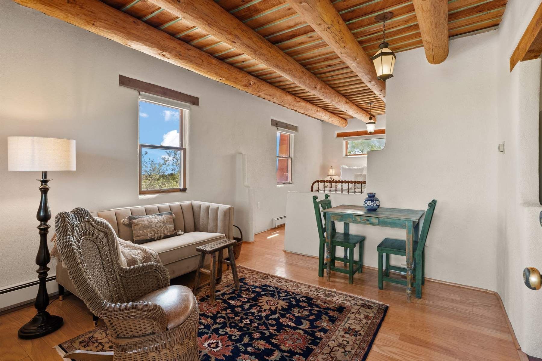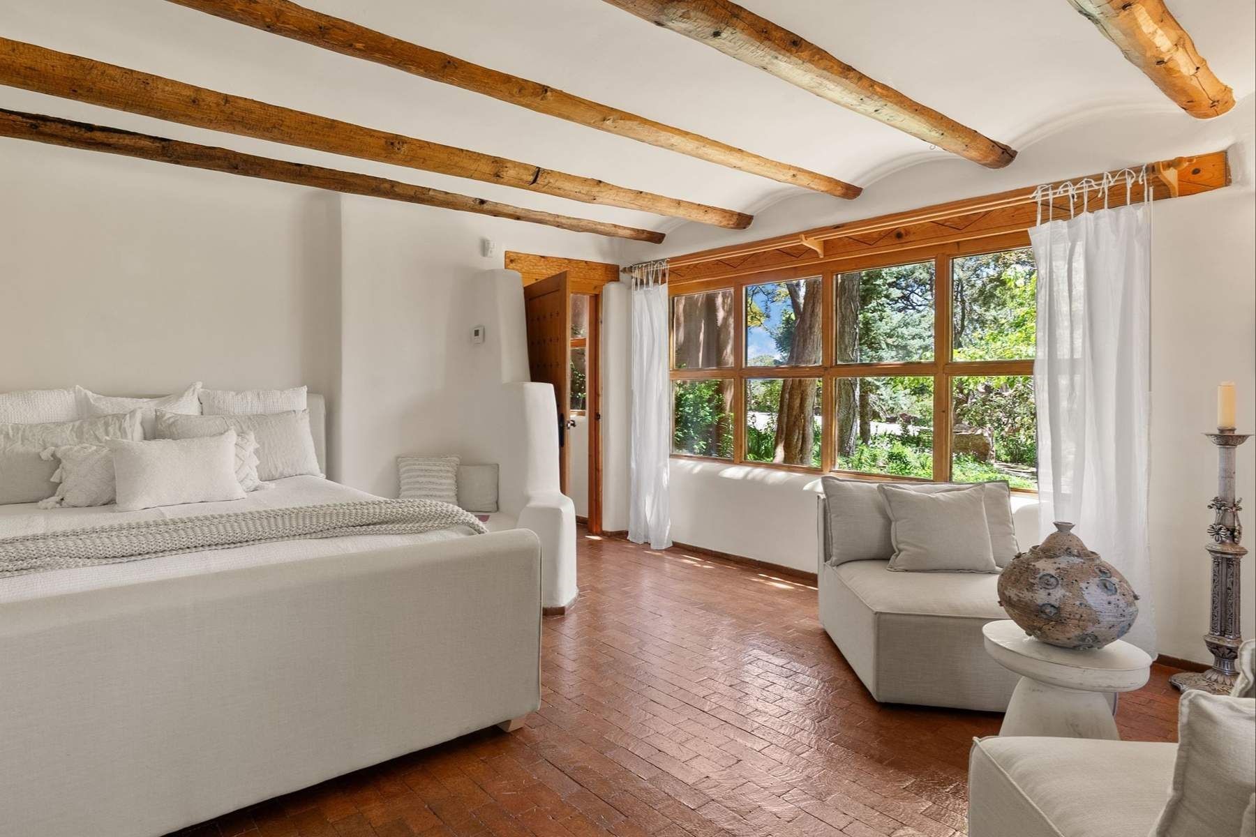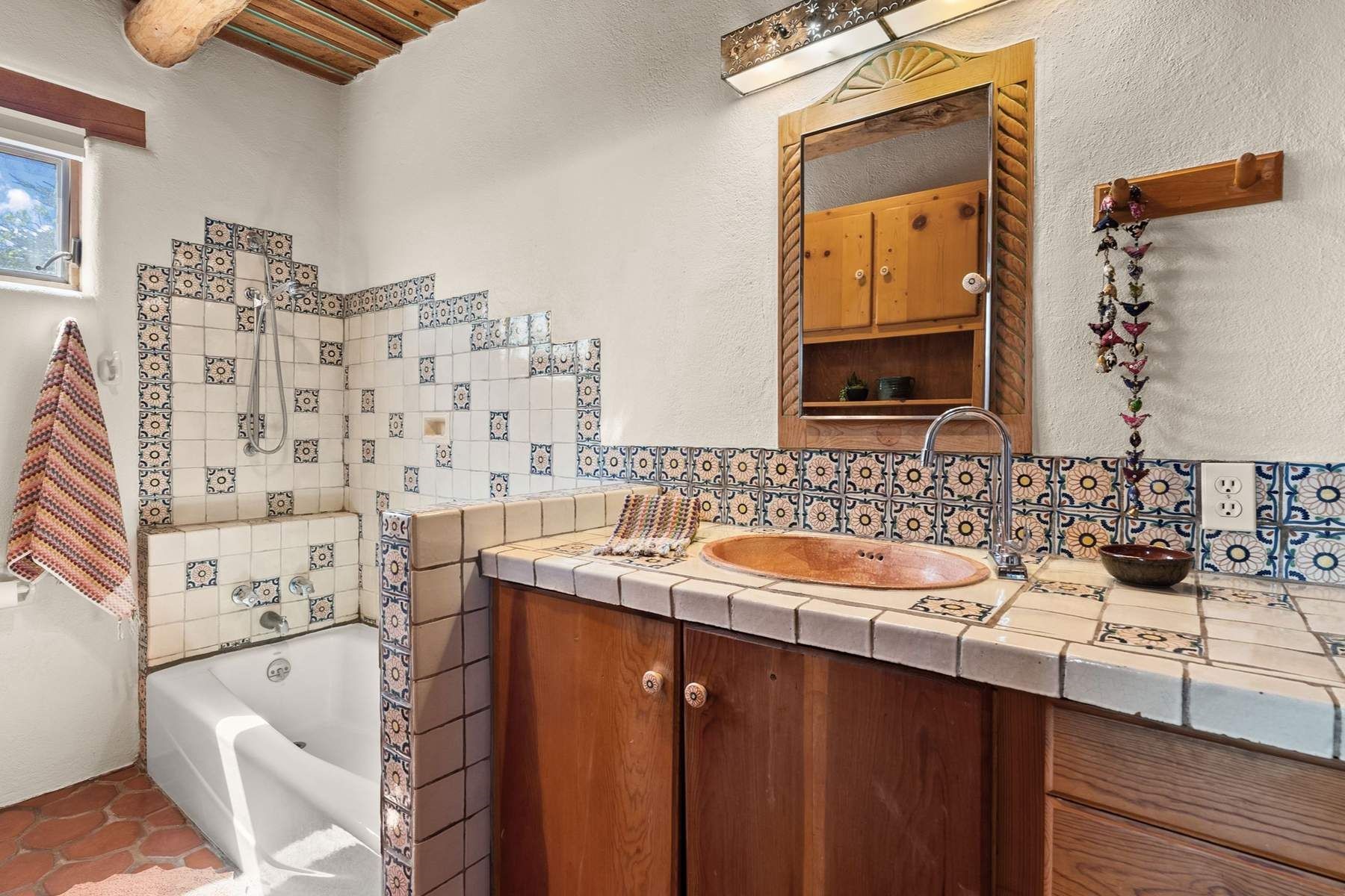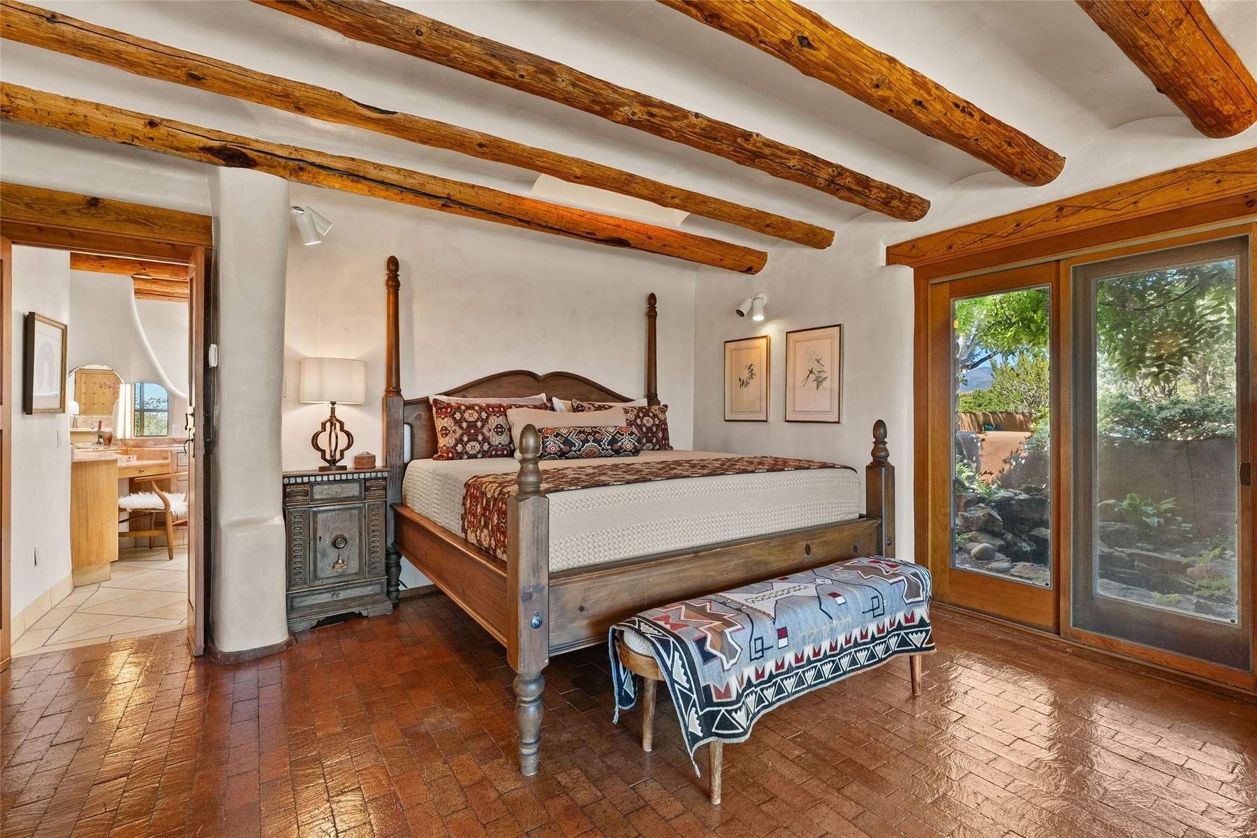 ADOBE ROSE *** Privately situated, this Santa Fe-style estate offers expansive views, layered outdoor spaces and authentic architectural detail throughout. A landscaped courtyard leads into interiors with curved adobe walls, Saltillo tile floors, carved doors and multiple kiva fireplaces.The circular living room with tiered beamed ceiling opens to a west-facing portal and the dining room connects directly to the courtyard. The kitchen flows to a covered portal with built-in grill, cabinetry, dual sinks and seating for entertaining.Upstairs, a bright office with built-ins and powder room opens to a rooftop deck with mountain views, kiva fireplace and additional seating areas. The primary suite includes a fireplace sitting area, private garden with heated wading pool and outdoor shower and a bath with soaking tub and steam shower.Two additional bedrooms, flexible bonus spaces and a separate casita with kitchen and bath provide comfortable accommodations. The grounds feature winding paths, gardens, koi pond and multiple patios. Two-car garage plus detached third garage with studio/workspace.
