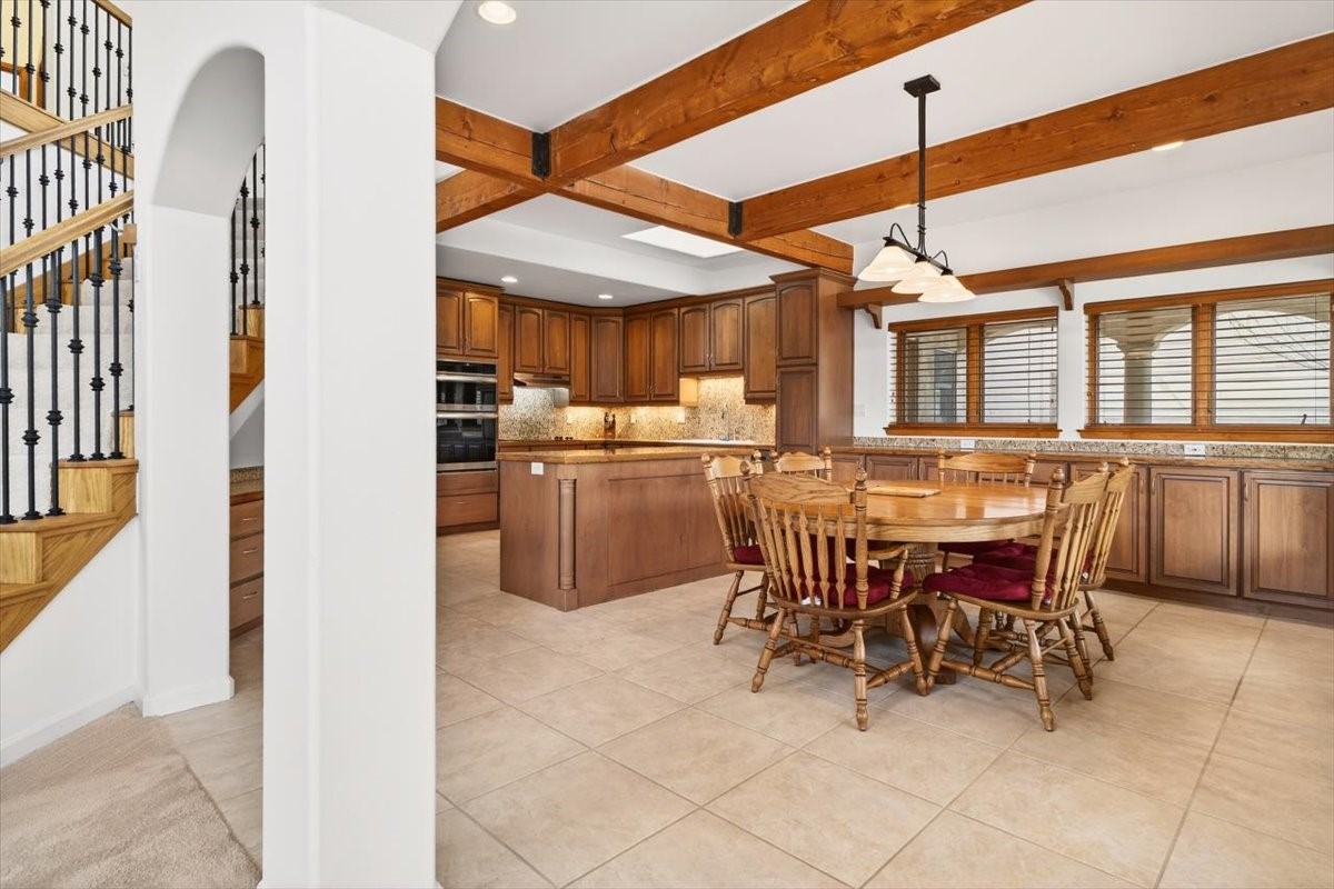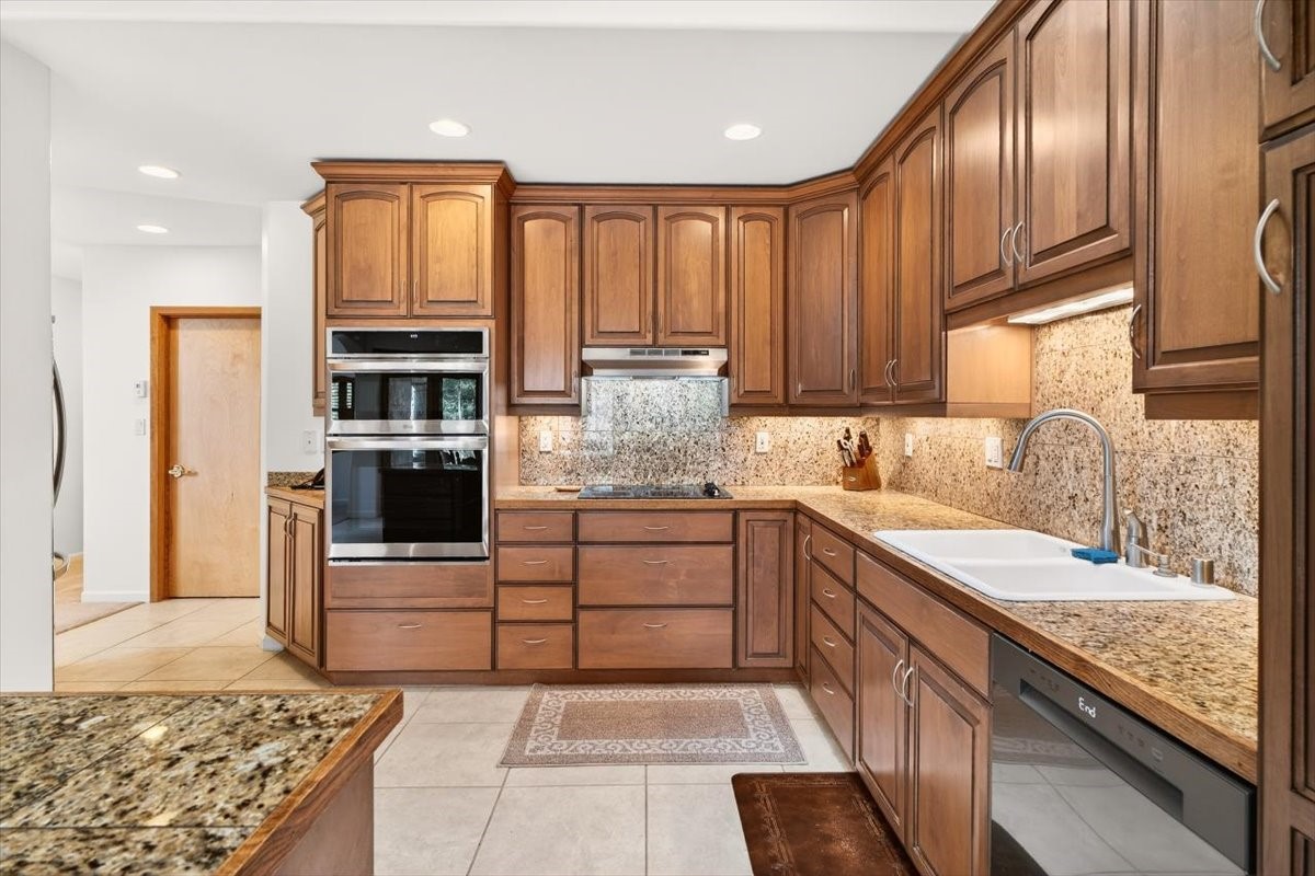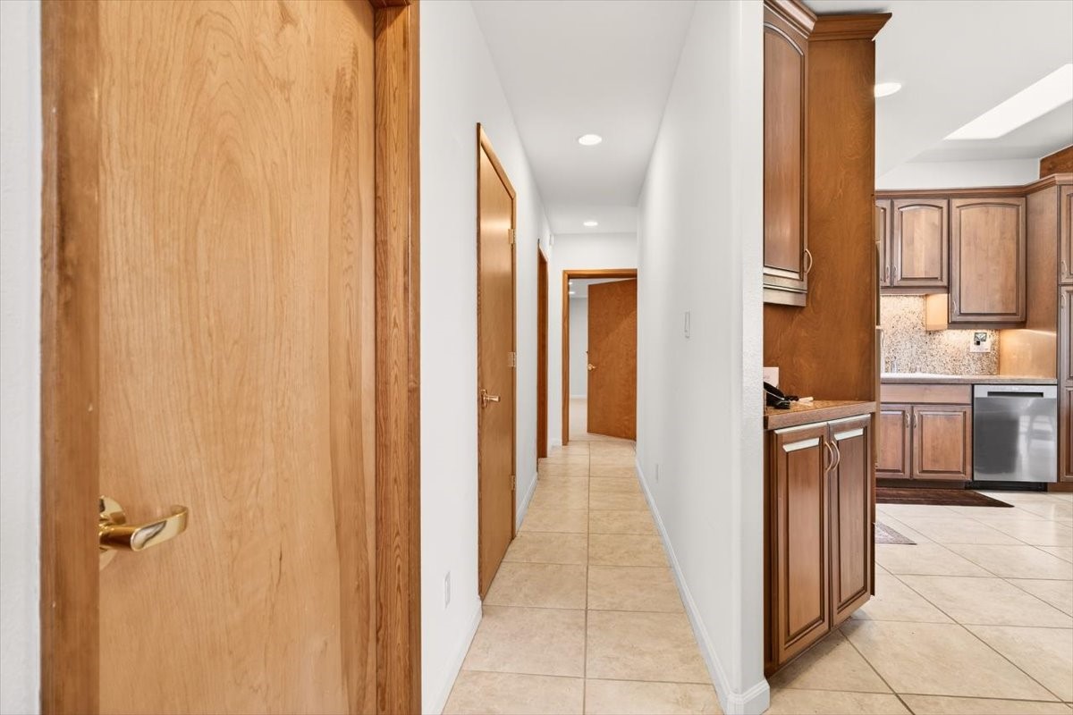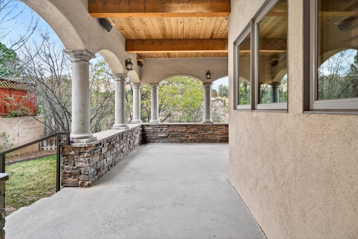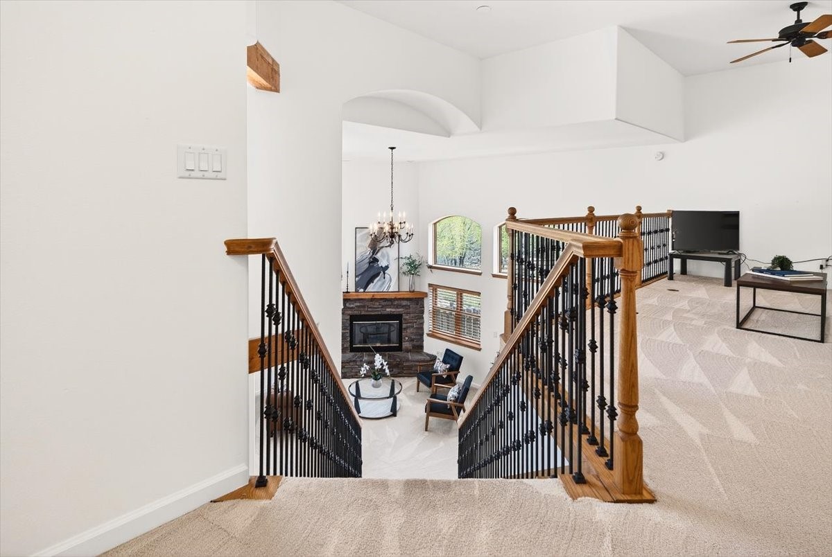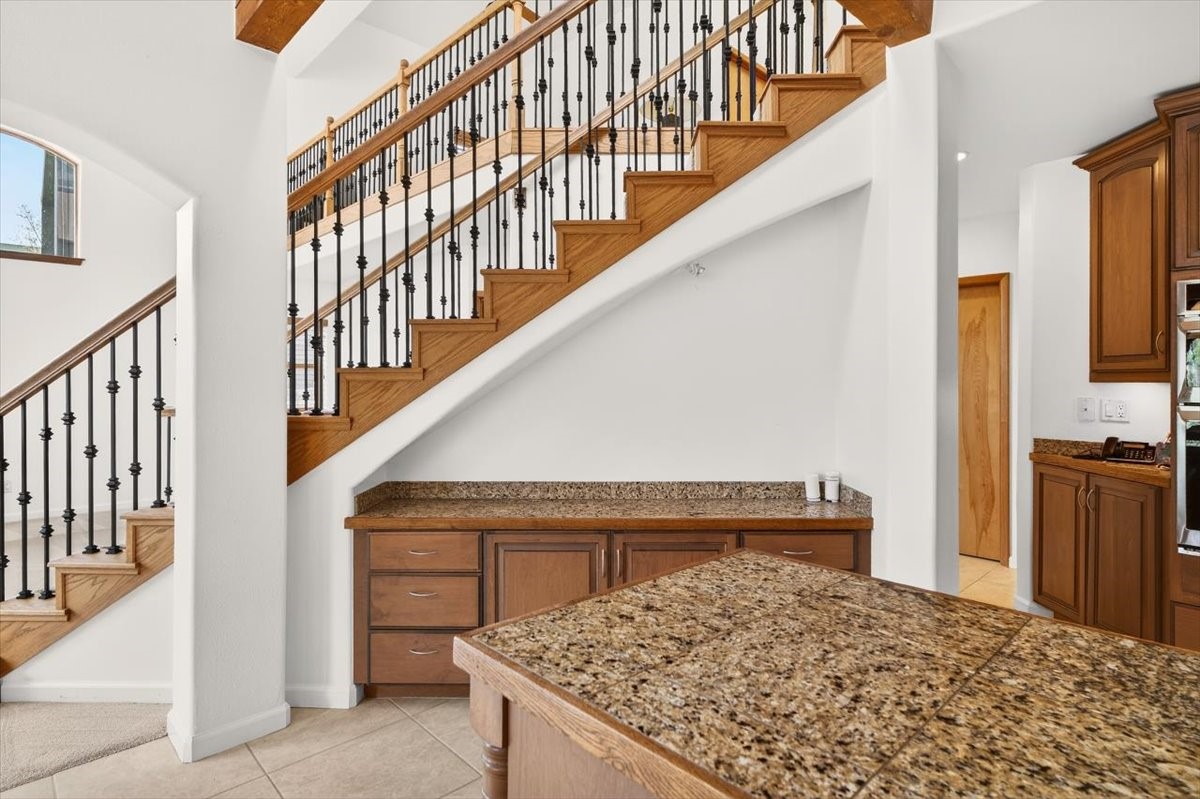 Crafted with enhanced safety standards and durability at the forefront, this 2004-built residence features exceptional construction, including 2x10 wall framing with R-32 insulation and a 1.5-inch fire-rated stucco exterior. The 2011 metal roof, designed to resemble classic clay tile, is fully fireproof and includes a transferable warranty, while double-pane skylights enhance both efficiency and natural light. A grand foyer welcomes you inside, where a striking stone fireplace and iron staircase anchor the living spaces and set a refined tone. Arched windows accentuate the home's distinctive character and fill the space with natural light. The upper level features two bedrooms, including a well-appointed primary suite with a spa-like bath, generous walk-in closet, and private sitting area. A den overlooks the living room below, adding dimension and openness to the design. The lower level serves as the heart of the home. Arched architectural details lead into the dining area and kitchen, where custom alder wood cabinetry, granite tile countertops, and a 2025 appliance suite create a functional and stylish workspace. An island with a pullout workstation offers added versatility. This level also includes two additional bedrooms and direct access to the backyard. Just off the kitchen, the patio is thoughtfully designed for year-round enjoyment, complete with integrated Bose speakers and a balance of shelter and openness ideal for entertaining. A 550-square-foot bonus room--originally designed as a dance studio--offers flexible use as a home theater, game room, or creative space. Additional features include in-floor radiant heating throughout both levels, central air conditioning, and solid-core ADA compliant doors. The oversized garage accommodates larger vehicles. Located near hiking trails, public transportation, and the local high school, this property combines thoughtful design, quality construction, and everyday livability. Schedule a private showing today.