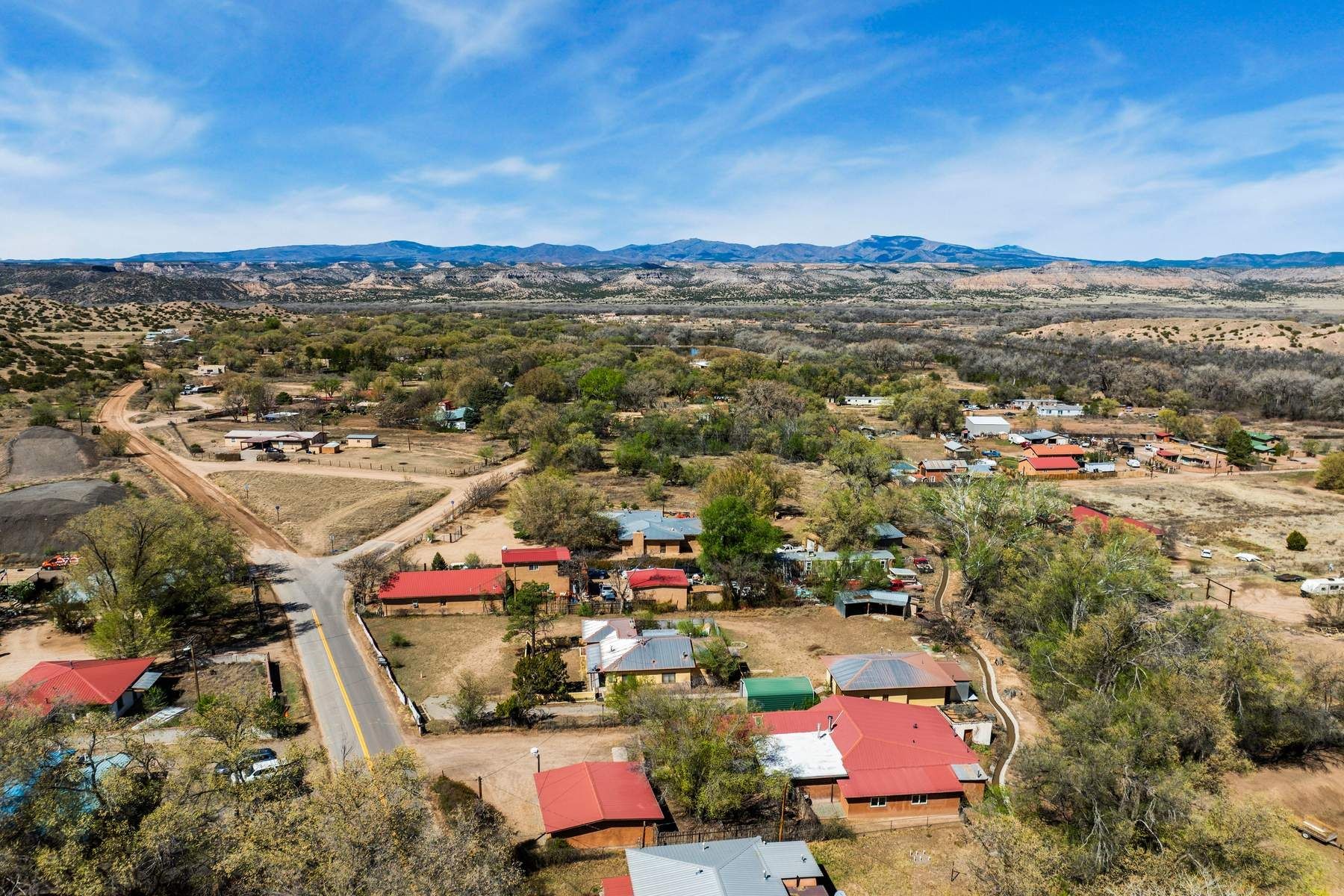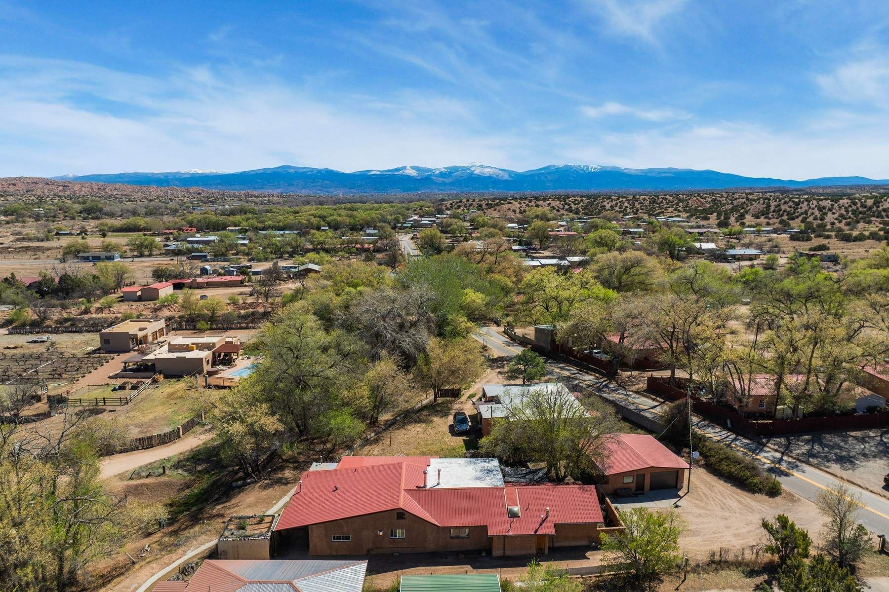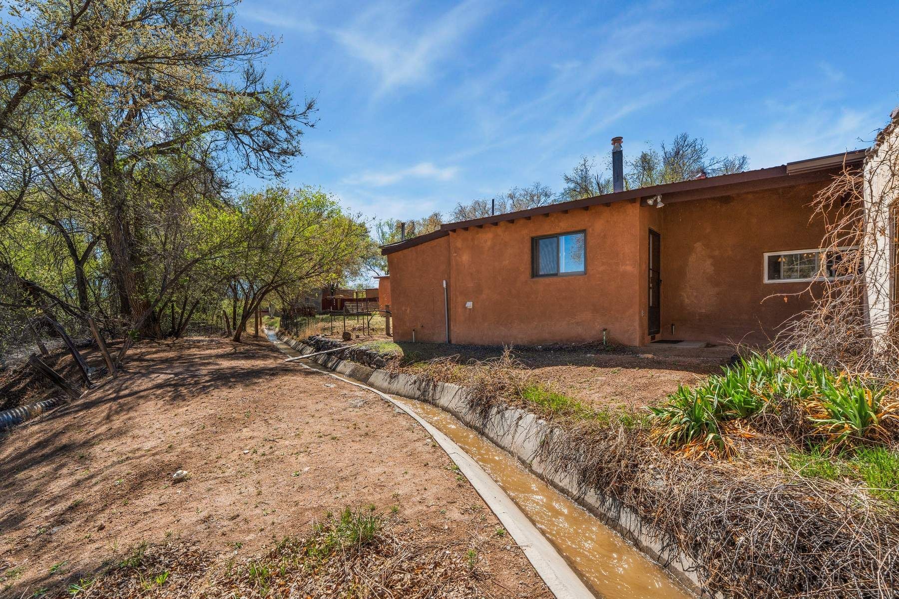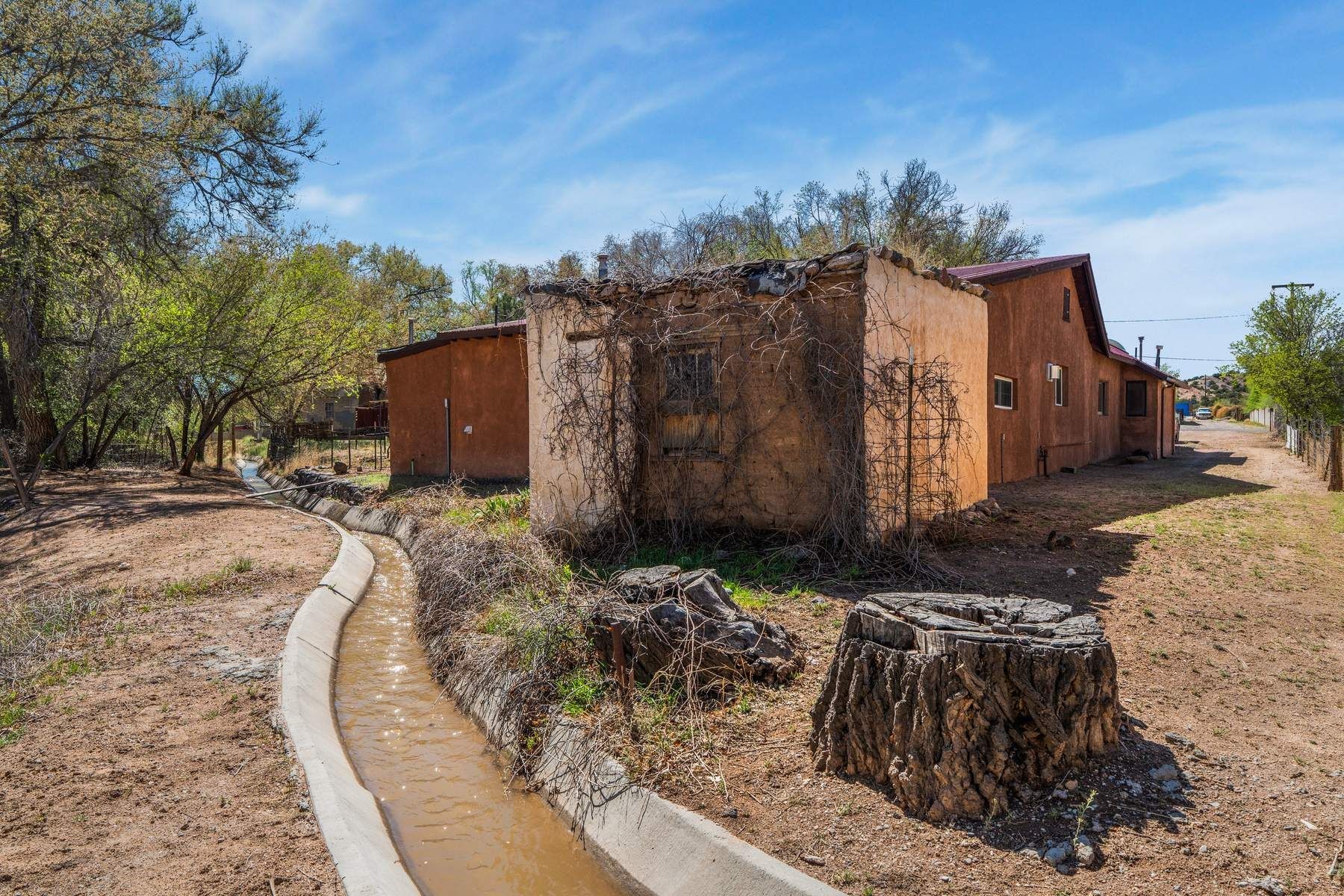 Welcome home to this distinctive single-level home with an acequia running through the property, located in the El Rancho area of Pojoaque. With adobe portions of the home dating back to 1892, this 3-bedroom, 2-bath home with office offers 2,680 square feet of living space on 1.63 acres, blending historic Northern New Mexico character with everyday comfort and functionality. Warm and inviting style details define the home, including wood and coved viga ceilings, brick, wood, and concrete floors (no carpet), bay windows and abundant natural light throughout. The living room is anchored by a fireplace and opens to adjacent dining and flexible living spaces that support both daily living and gathering. The eat-in kitchen is both charming and practical, featuring granite countertops, extensive cabinetry, built-in shelving, and a butler's pantry, with easy flow into the dining area. A separate office provides space for work, studio use, or additional flexibility. Three bedrooms and two bathrooms are thoughtfully arranged within the home, offering comfortable use and separation. Two gas stoves provide warmth and character during the colder months. Outside, the property reflects traditional Northern New Mexico land use, with an acequia running through the parcel, mature trees, and a variety of usable outdoor areas suited for gardening, projects, or outdoor living. The elongated 1.63-acre lot offers flexibility and depth without the maintenance demands of larger acreage. A detached one-car garage with workshop space adds functionality and storage. Located approximately 10 minutes from Pojoaque amenities, 20 minutes to Los Alamos, and 27 minutes to downtown Santa Fe, this lovingly maintained home for 30+ years by the current owner offers quiet rural living in a wonderful community and a welcome combination of historic adobe architecture, usable land, and convenient access.