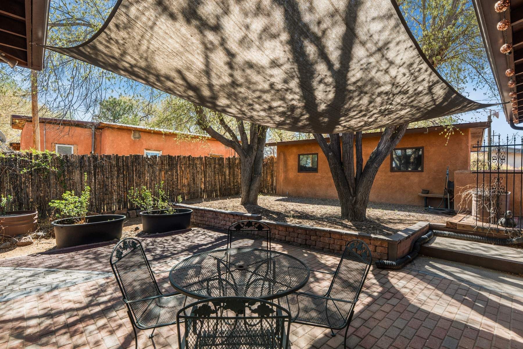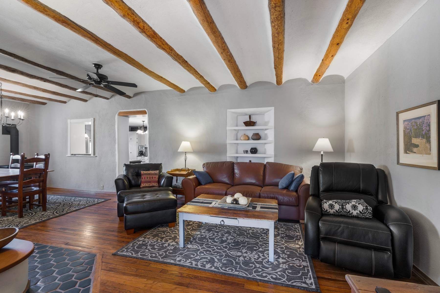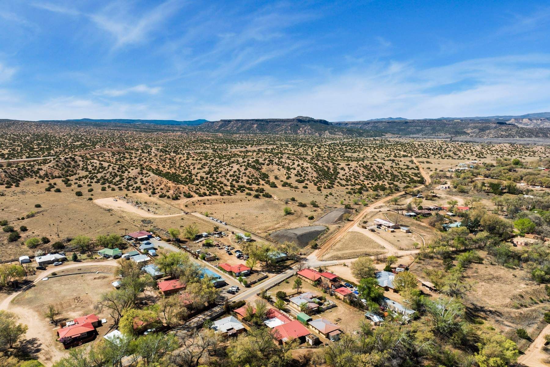 Welcome home to this distinctive single-level home with an acequia running through the property, located in the El Rancho area of Pojoaque. With adobe portions of the home dating back to 1892, this 3-bedroom, 2-bath home with office offers 2,680 square feet of living space on 1.63 acres, blending historic Northern New Mexico character with everyday comfort and functionality. Warm and inviting style details define the home, including wood and coved viga ceilings, brick, wood, and concrete floors (no carpet), bay windows and abundant natural light throughout. The living room is anchored by a fireplace and opens to adjacent dining and flexible living spaces that support both daily living and gathering. The eat-in kitchen is both charming and practical, featuring granite countertops, extensive cabinetry, built-in shelving, and a butler's pantry, with easy flow into the dining area. A separate office provides space for work, studio use, or additional flexibility. Three bedrooms and two bathrooms are thoughtfully arranged within the home, offering comfortable use and separation. Two gas stoves provide warmth and character during the colder months. Outside, the property reflects traditional Northern New Mexico land use, with an acequia running through the parcel, mature trees, and a variety of usable outdoor areas suited for gardening, projects, or outdoor living. The elongated 1.63-acre lot offers flexibility and depth without the maintenance demands of larger acreage. A detached one-car garage with workshop space adds functionality and storage. Located approximately 10 minutes from Pojoaque amenities, 20 minutes to Los Alamos, and 27 minutes to downtown Santa Fe, this lovingly maintained home for 30+ years by the current owner offers quiet rural living in a wonderful community and a welcome combination of historic adobe architecture, usable land, and convenient access.