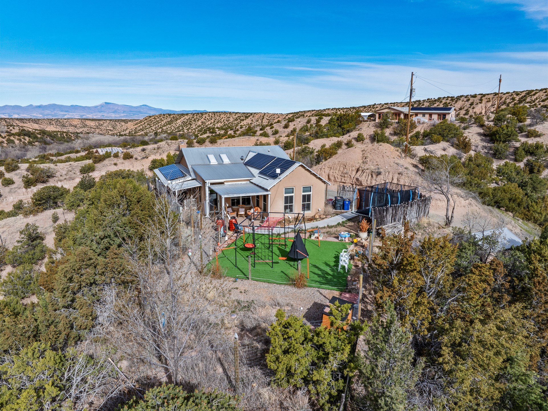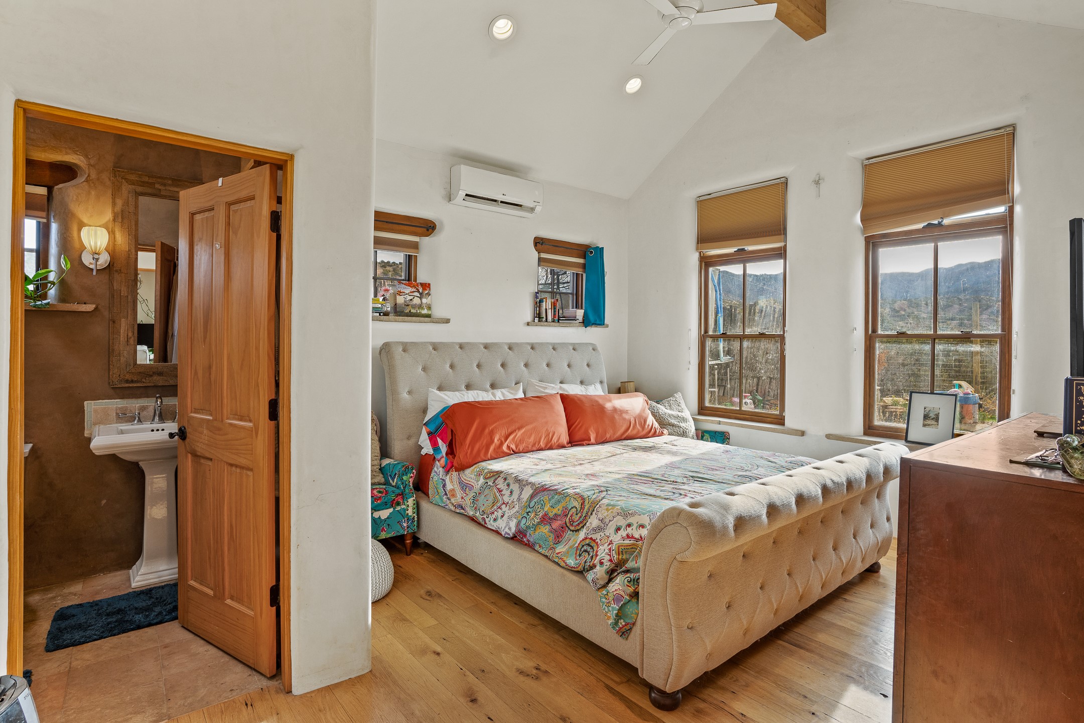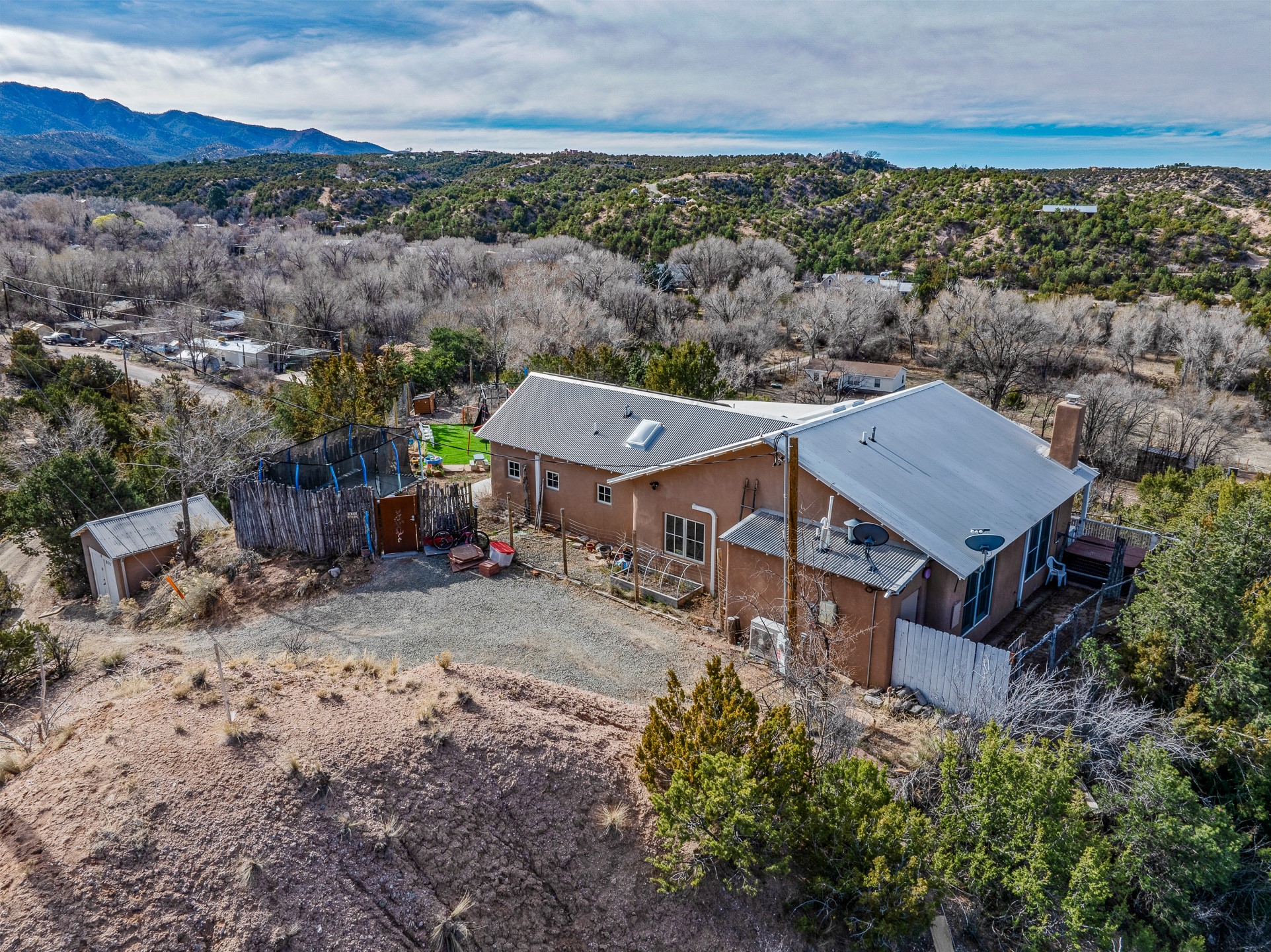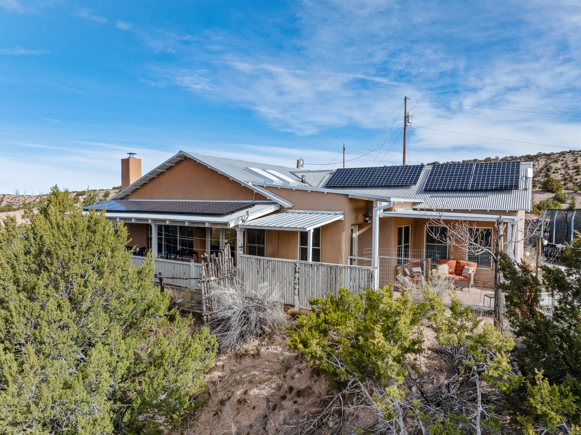 This sanctuary offers authentic Northern New Mexican lifestyle. The adobe main residence (1,500+ sq ft) features curved plaster walls, kiva fireplace, vaulted ceilings with vigas, and flagstone seals. This 3-bedroom, 2-bath, move-in-ready home showcases artisanal craftsmanship, priced to sell. The primary suite includes walk-in closet and spa-like bathroom with rock shower. Guest bath features a clawfoot tub. Recent upgrades include new appliances, tankless water heater, water filtration system, mini-splits, and solar. Close to Four Seasons and Tesuque Village Market, the property offers an office and loft. Adjoining lot available for sale, 6 Vista Del Cuervo.