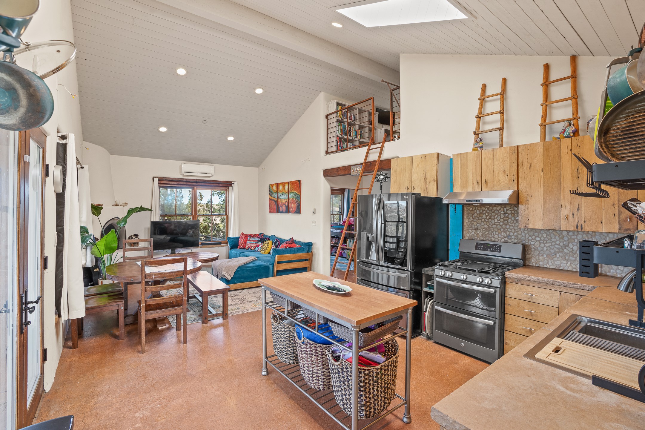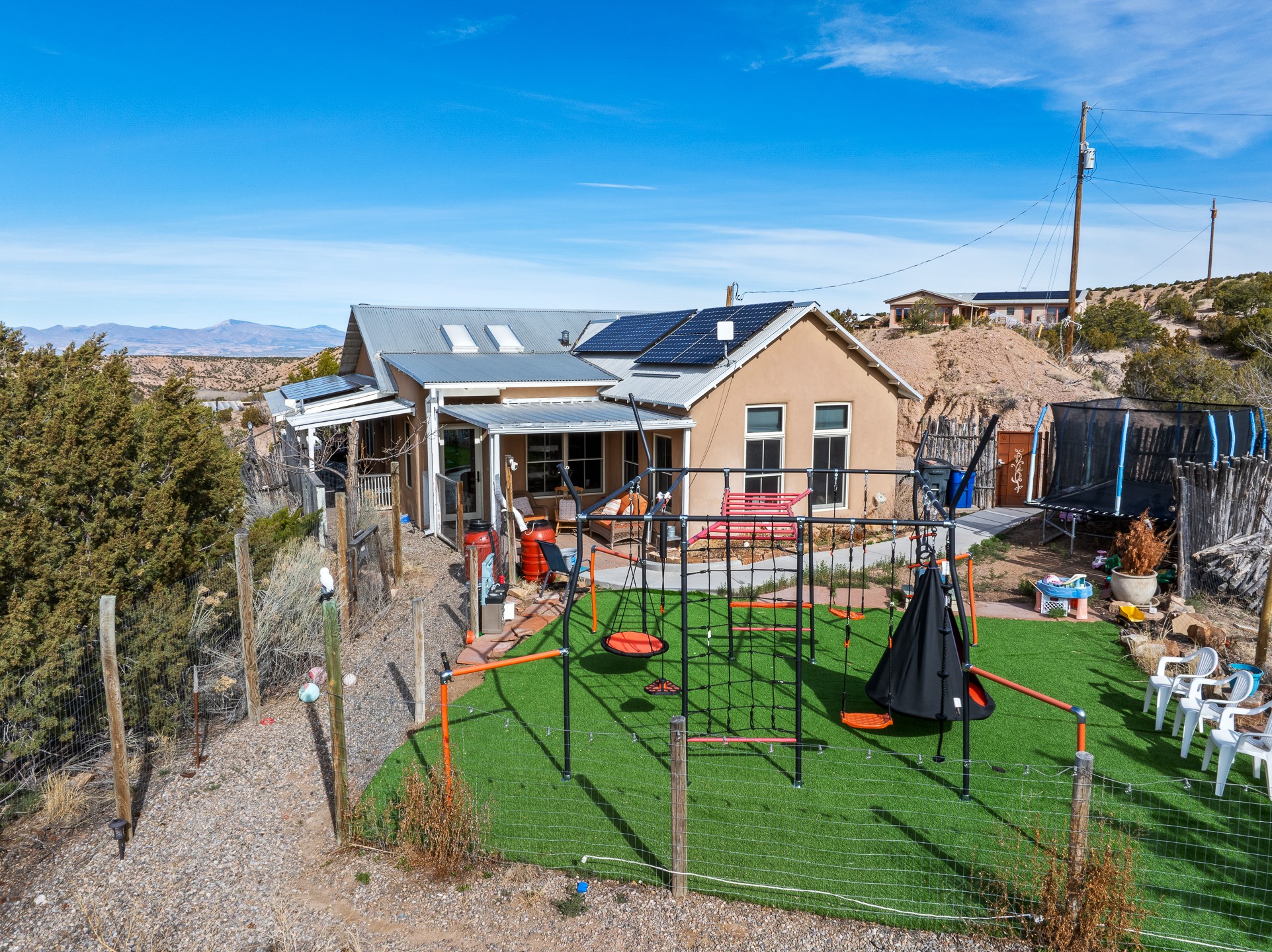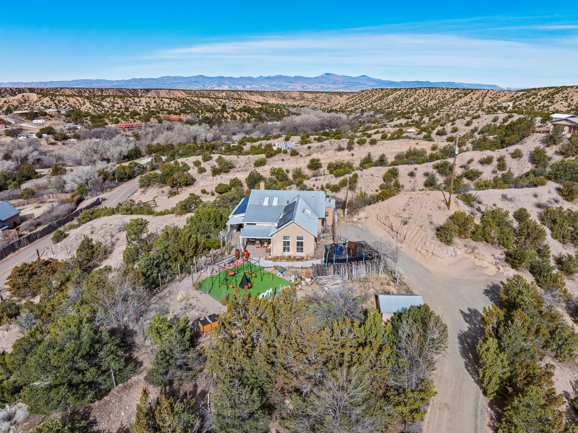 This sanctuary offers authentic Northern New Mexican lifestyle. The adobe main residence (1,500+ sq ft) features curved plaster walls, kiva fireplace, vaulted ceilings with vigas, and flagstone seals. This 3-bedroom, 2-bath, move-in-ready home showcases artisanal craftsmanship, priced to sell. The primary suite includes walk-in closet and spa-like bathroom with rock shower. Guest bath features a clawfoot tub. Recent upgrades include new appliances, tankless water heater, water filtration system, mini-splits, and solar. Close to Four Seasons and Tesuque Village Market, the property offers an office and loft. Adjoining lot available for sale, 6 Vista Del Cuervo.