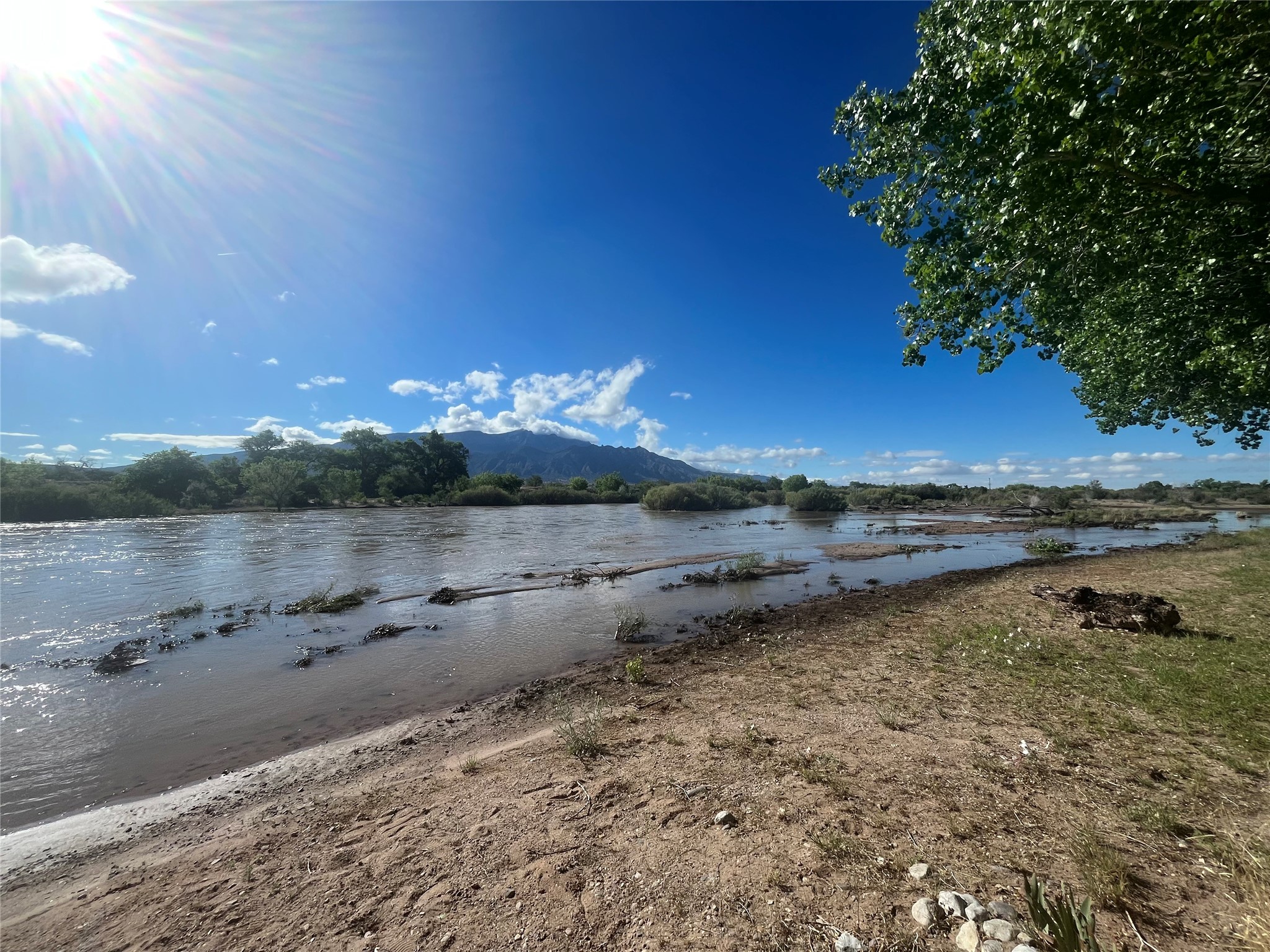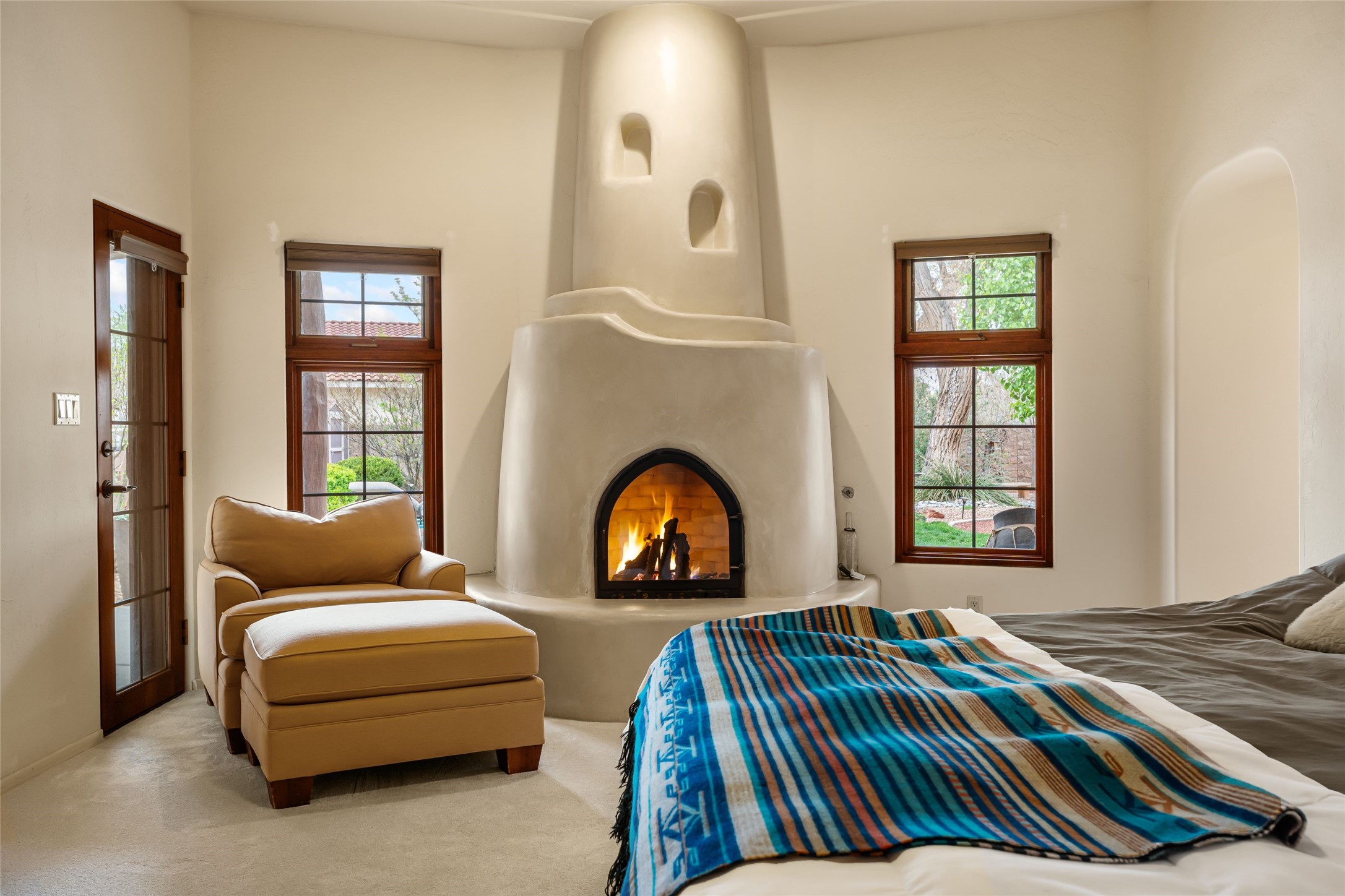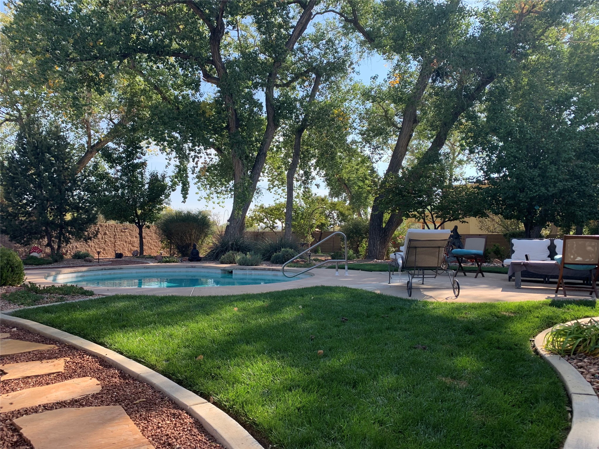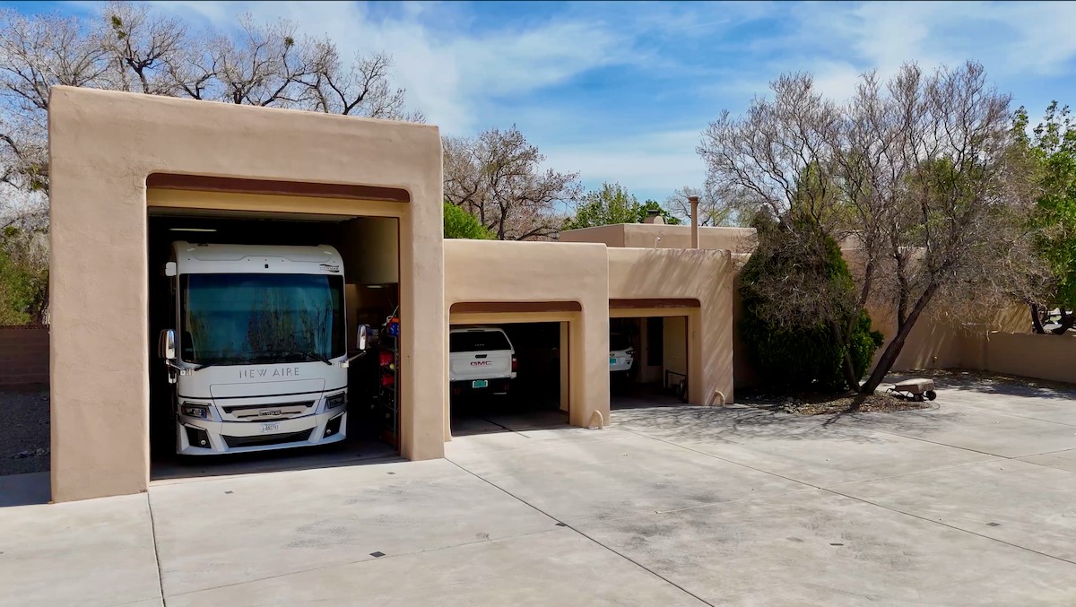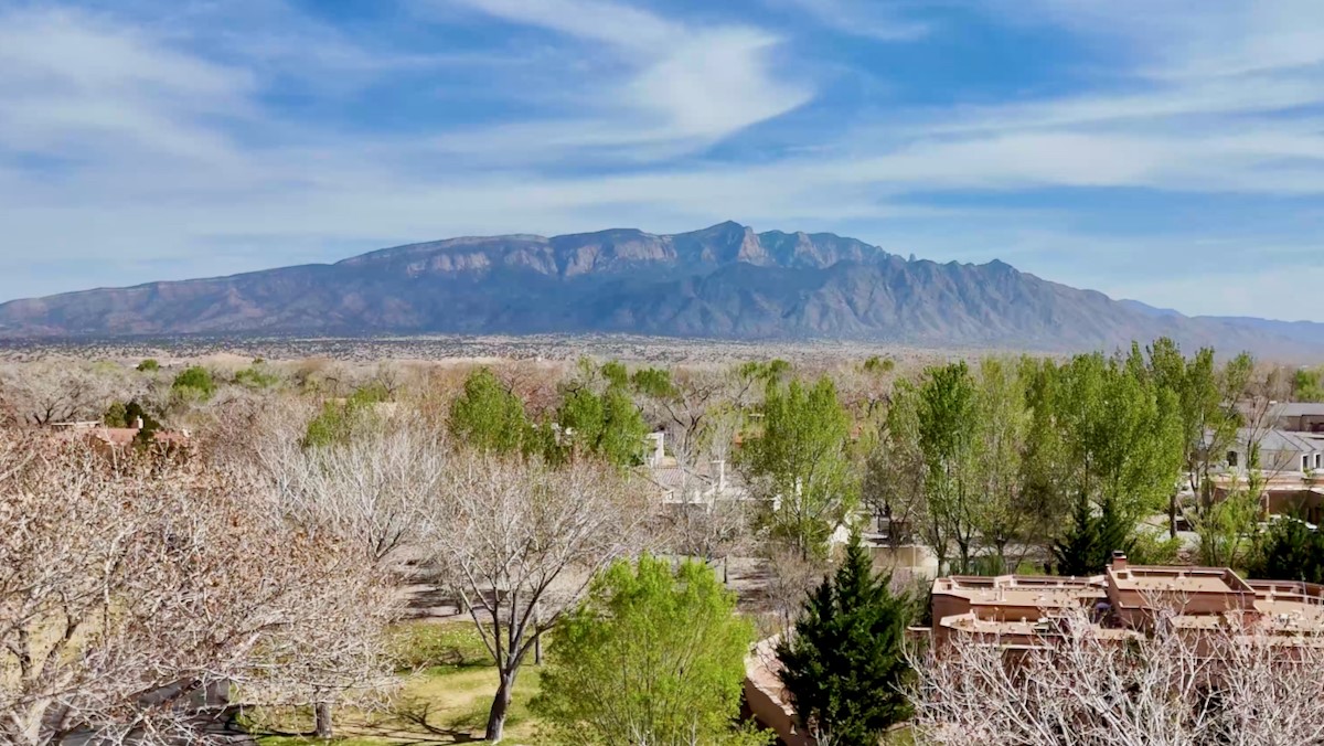 Unparalleled beauty and luxurious style exude not only from the picturesque backdrop of the Sandia Mountains, but also from this stunning custom home built in 2001 located in the gated Bosque Encantado community, a hidden gem near Bernalillo. The home sits on a little over 1 acre with a private irrigation well in place to accommodate the sumptuous landscaping. A heated pool is a focal point of the back yard with plenty of shade from mature trees and gardens, perfect for spring and summer outdoor entertaining. A covered patio, hot tub and outdoor kitchen complete the outdoor space. Inside, the large and open feel of the living and dining areas is dramatically defined by high ceilings with vigas, latillas and accented by lovely kiva fireplaces in the living room and kitchen. The well-appointed chef's kitchen has high-end stainless steel appliances, warm lighting and granite countertops in place. The primary suite is separated from the two secondary bedrooms to ensure privacy. The primary en-suite has a spa-like feel with a large wood-burning fireplace in the bedroom, a soaking tub, spiral shower and walk-in closet with custom cabinets nearby. There is a work out area, in addition to two separate offices, one with a Murphy bed adding versatility for overnight guests. The property itself also has a two-car garage with an additional oversized RV bay with nearby hookup for sewer, water and electricity (30 amp inside and outside). The home has been impeccably maintained with newer mechanicals in place. The location is convenient for those looking for access to nearby shopping, but with exceptional trail access to the nearby Rio Grande Bosque.