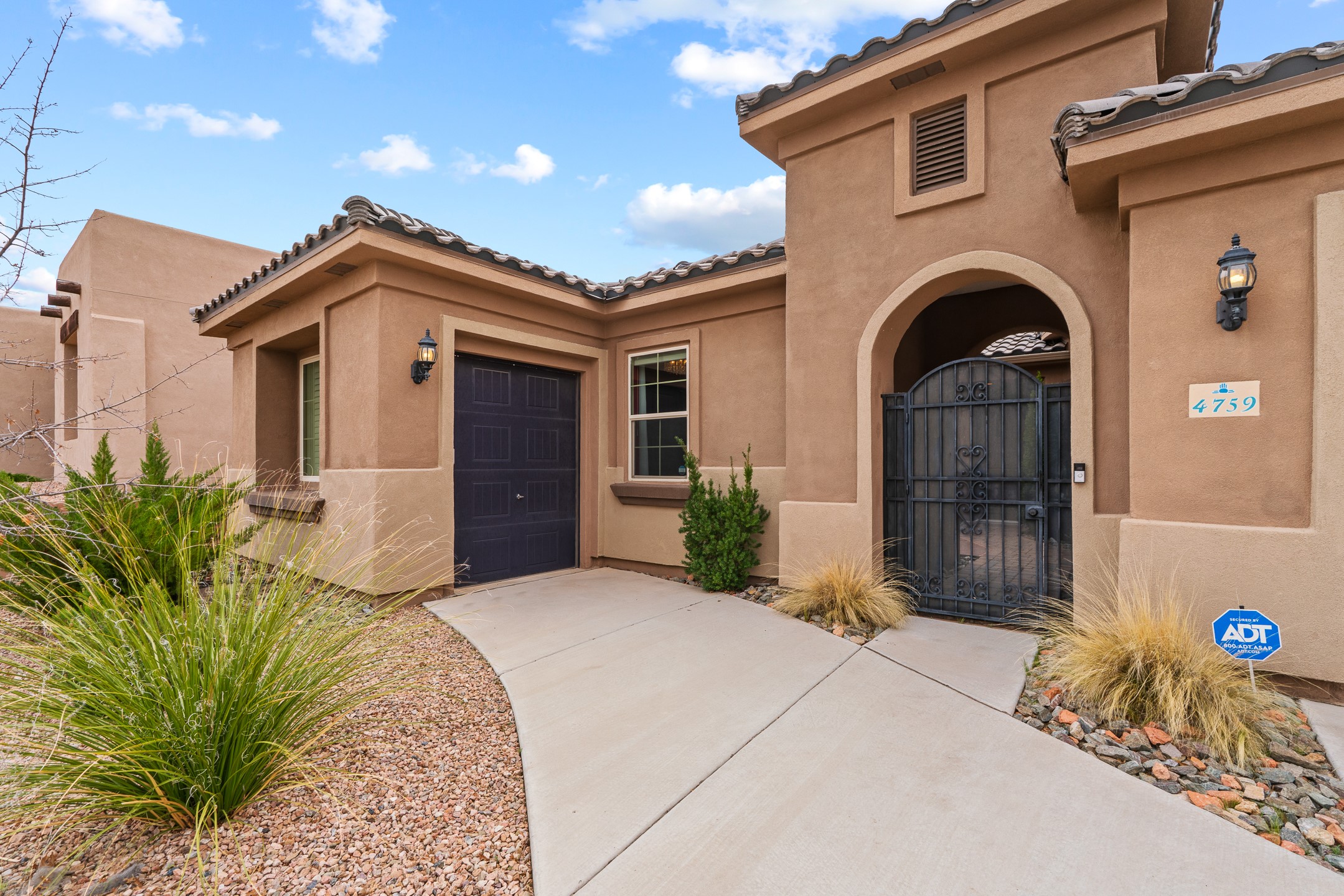 Nestled in the desirable Las Soleras subdivision, 4759 Lluvia Encantada offers refined single-level living with thoughtful upgrades, inviting indoor-outdoor spaces, and a highly convenient Santa Fe location. Enter through a gated Spanish-style courtyard into a bright, open floor plan designed for both everyday comfort and easy entertaining. Interior details include arched doorways, five-inch baseboards, upgraded lighting, natural gas fireplace, luxury carpeting with premium padding, and custom storage throughout, including beautifully designed bedroom, coat, and linen closets.The kitchen is both functional and elegant, featuring upgraded quartz countertops, stainless steel appliances, crown-molded cabinetry, under-cabinet lighting, a generous island, walk-in custom pantry, and butler's pantry for added organization. A bowed window dining area brings in natural light and creates an inviting setting for casual meals or morning coffee.The spacious living and dining areas transition seamlessly to a private backyard designed for relaxation and gathering. Enjoy a built-in Lion grill, custom outdoor fireplace, hot tub, water features, mature landscaping, and partial Jemez views, all creating a peaceful and well-appointed outdoor retreat.Additional features include zero-step patio access, walk-in shower, raised counters and toilets, a raised dishwasher, and a two-car garage plus an adjacent smaller garage ideal for a workshop, hobby space, or additional storage. Located just moments from Presbyterian Santa Fe Medical Center, shopping, dining, I-25, and NM-599, this home combines comfort, quality, and convenience in one of Santa Fe's most accessible neighborhoods.