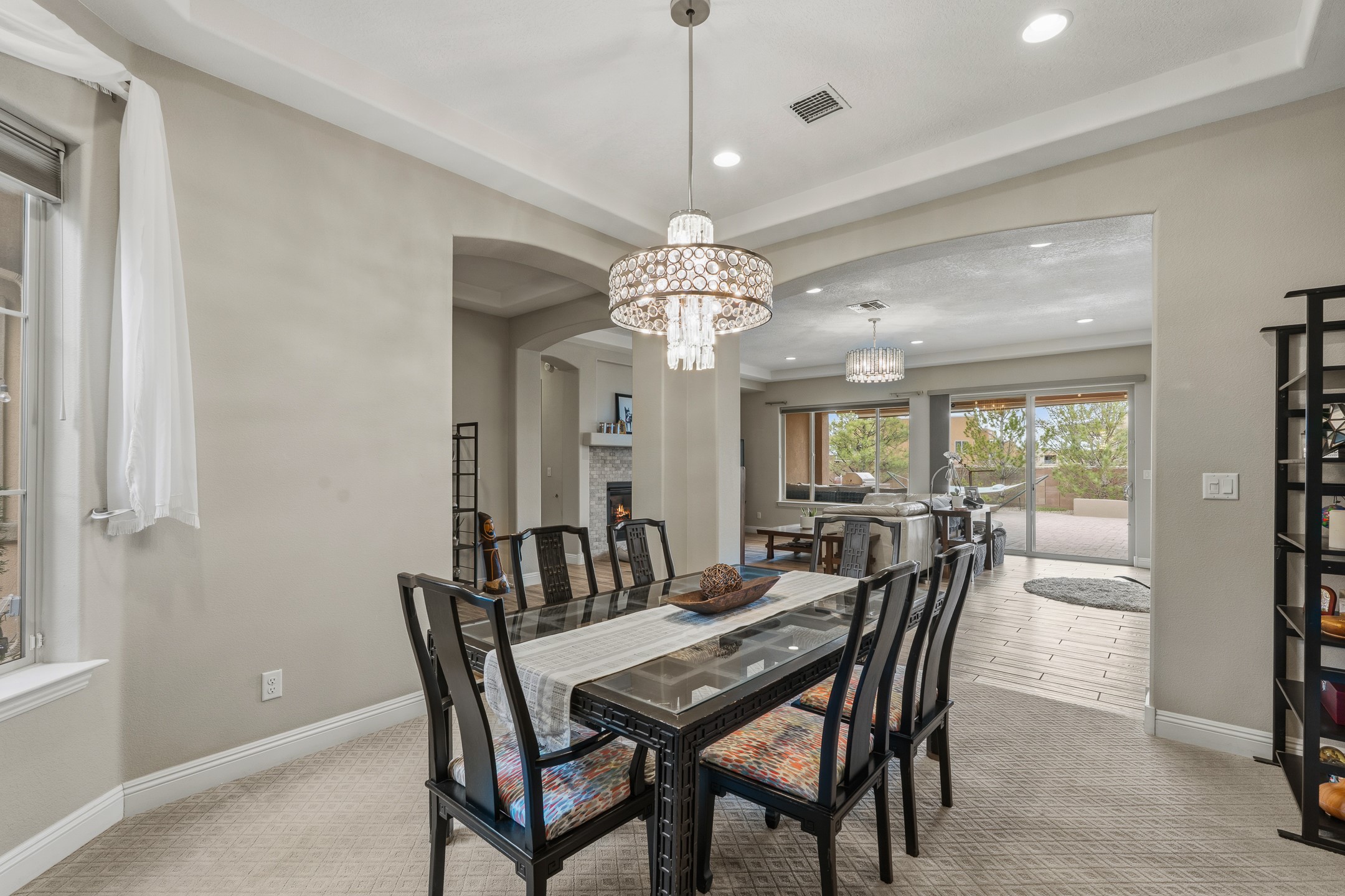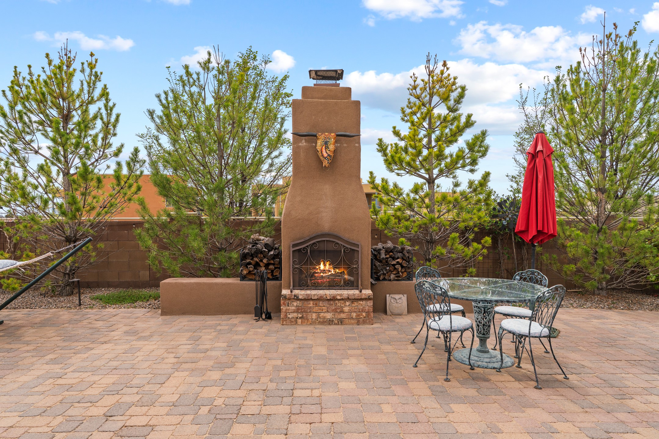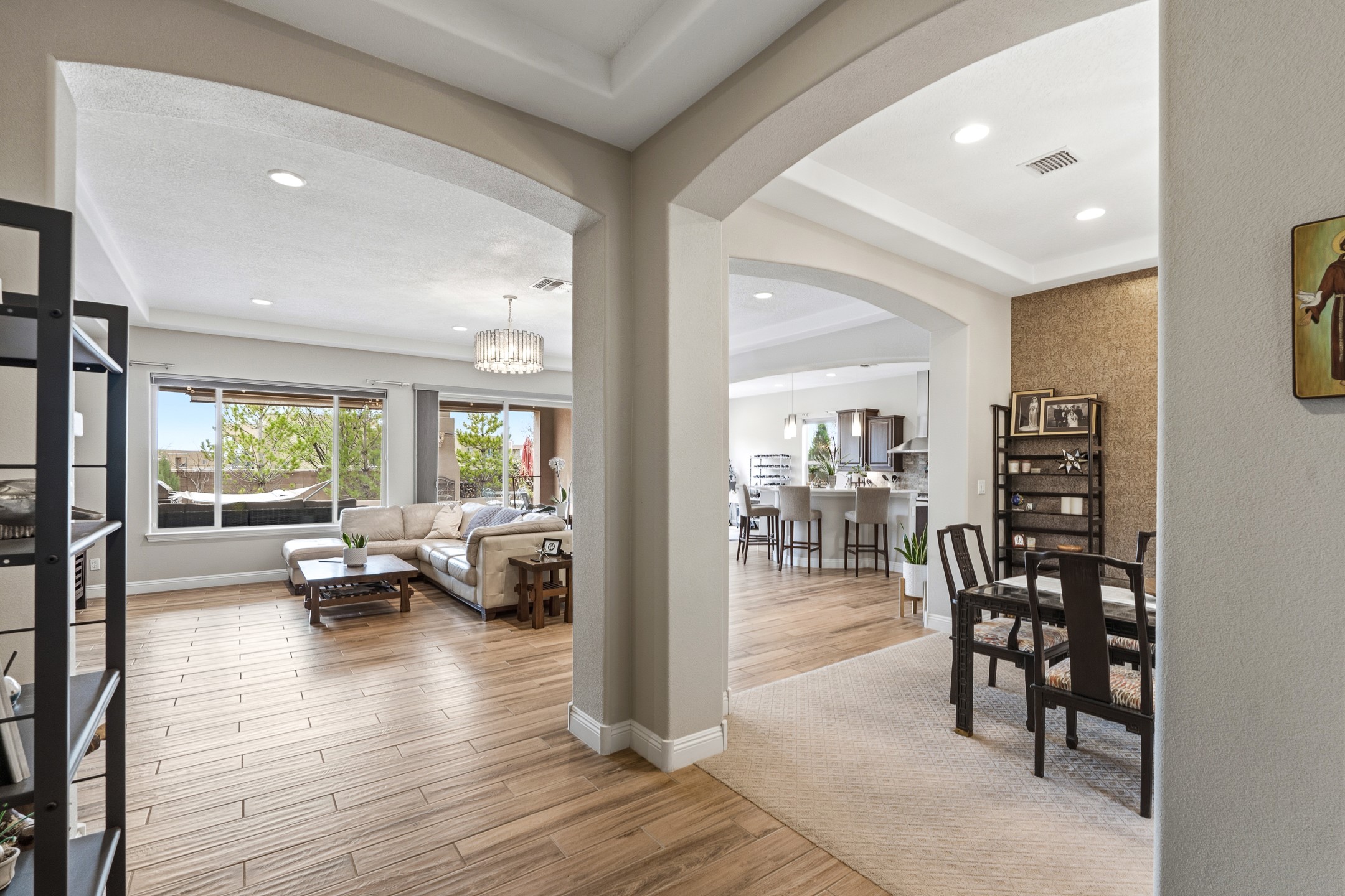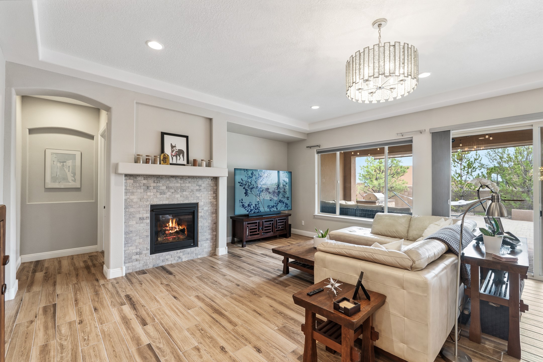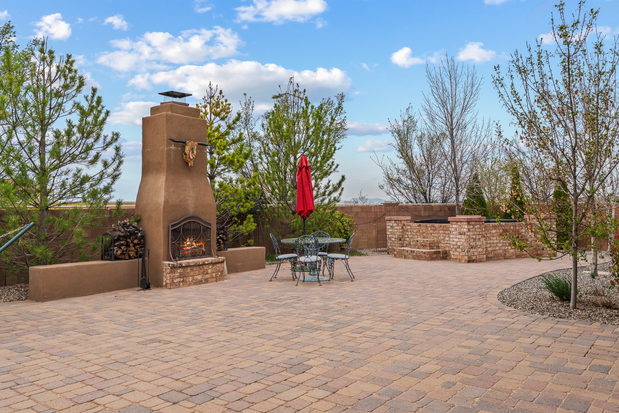 Nestled in the desirable Las Soleras subdivision, 4759 Lluvia Encantada offers refined single-level living with thoughtful upgrades, inviting indoor-outdoor spaces, and a highly convenient Santa Fe location. Enter through a gated Spanish-style courtyard into a bright, open floor plan designed for both everyday comfort and easy entertaining. Interior details include arched doorways, five-inch baseboards, upgraded lighting, natural gas fireplace, luxury carpeting with premium padding, and custom storage throughout, including beautifully designed bedroom, coat, and linen closets.The kitchen is both functional and elegant, featuring upgraded quartz countertops, stainless steel appliances, crown-molded cabinetry, under-cabinet lighting, a generous island, walk-in custom pantry, and butler's pantry for added organization. A bowed window dining area brings in natural light and creates an inviting setting for casual meals or morning coffee.The spacious living and dining areas transition seamlessly to a private backyard designed for relaxation and gathering. Enjoy a built-in Lion grill, custom outdoor fireplace, hot tub, water features, mature landscaping, and partial Jemez views, all creating a peaceful and well-appointed outdoor retreat.Additional features include zero-step patio access, walk-in shower, raised counters and toilets, a raised dishwasher, and a two-car garage plus an adjacent smaller garage ideal for a workshop, hobby space, or additional storage. Located just moments from Presbyterian Santa Fe Medical Center, shopping, dining, I-25, and NM-599, this home combines comfort, quality, and convenience in one of Santa Fe's most accessible neighborhoods.