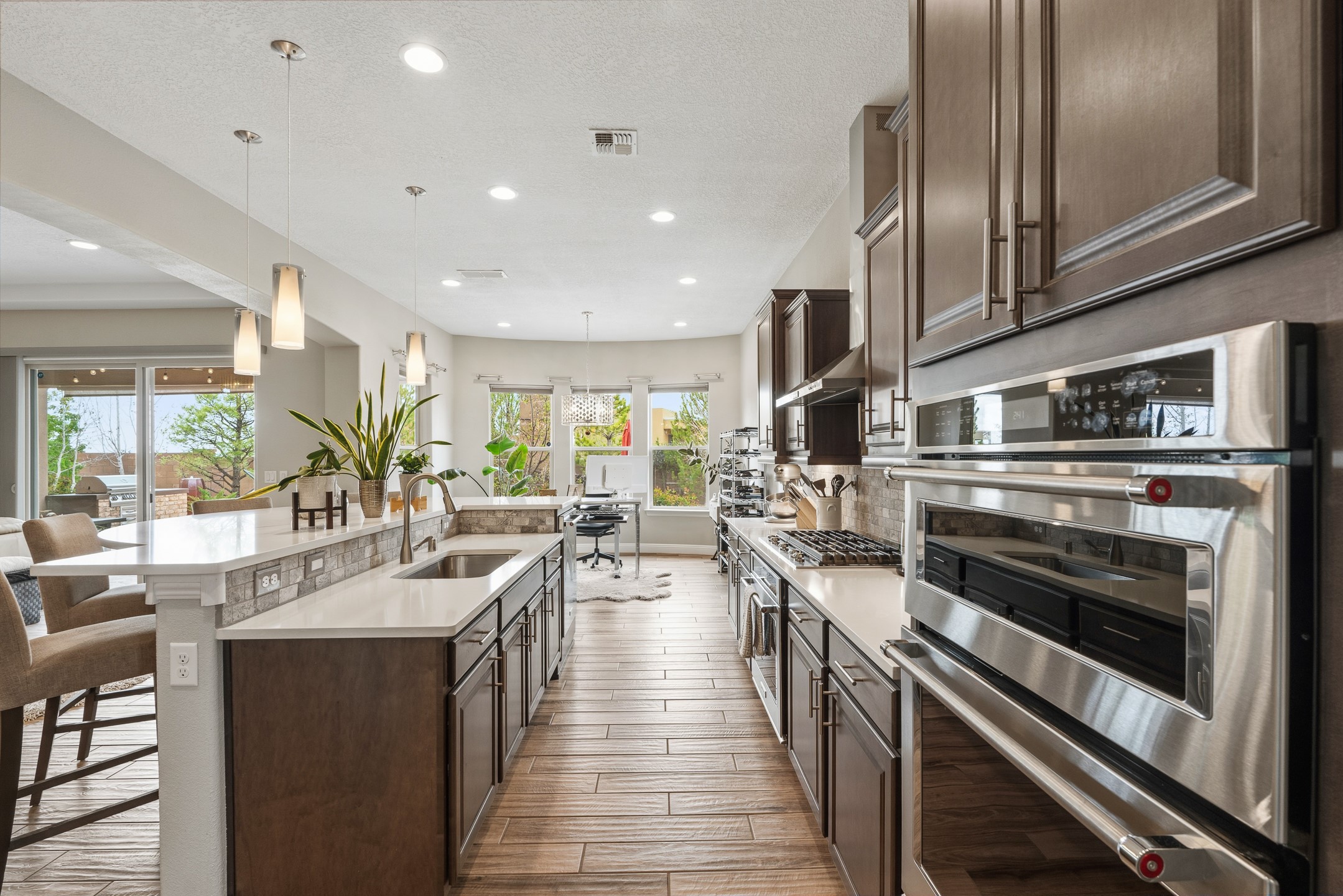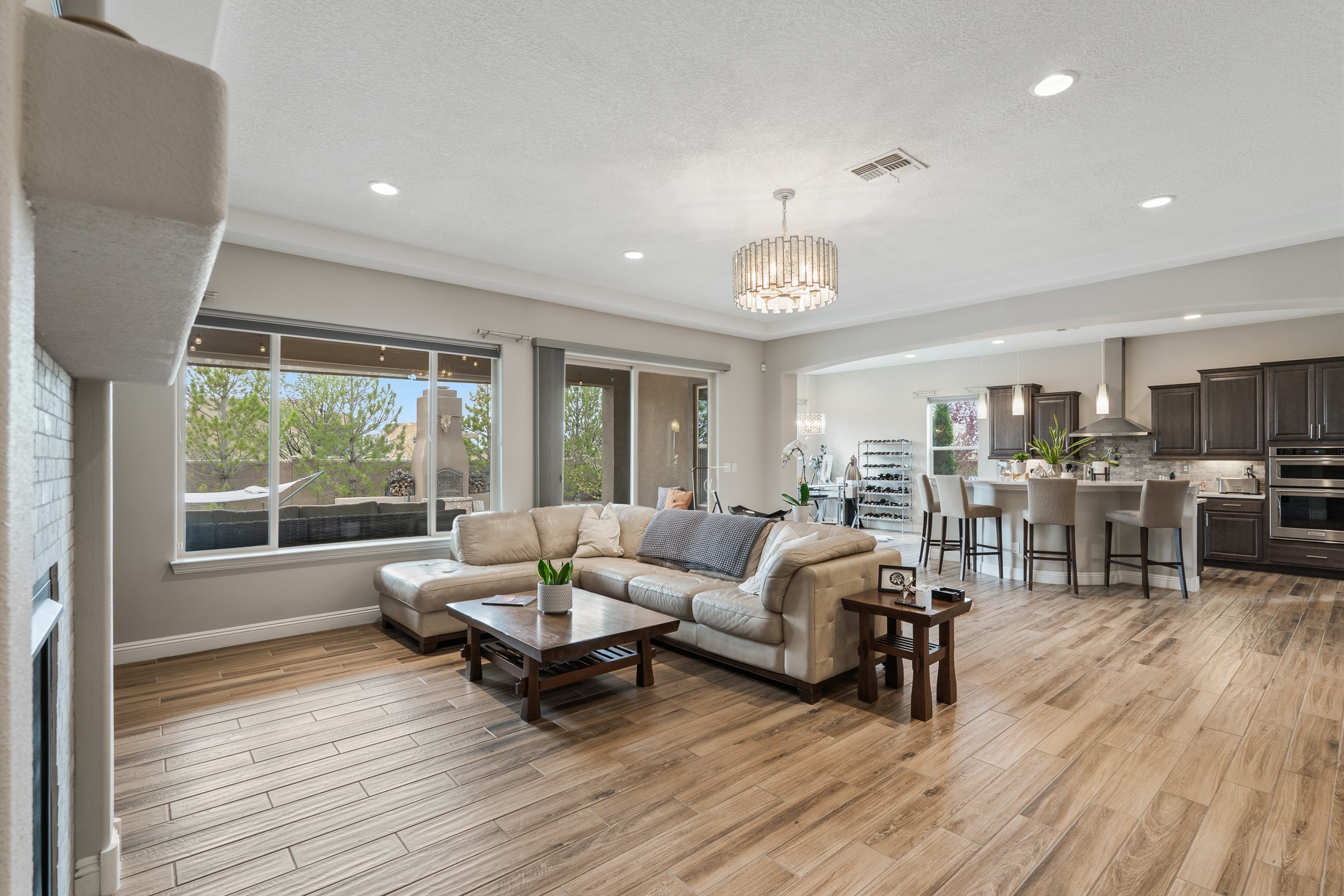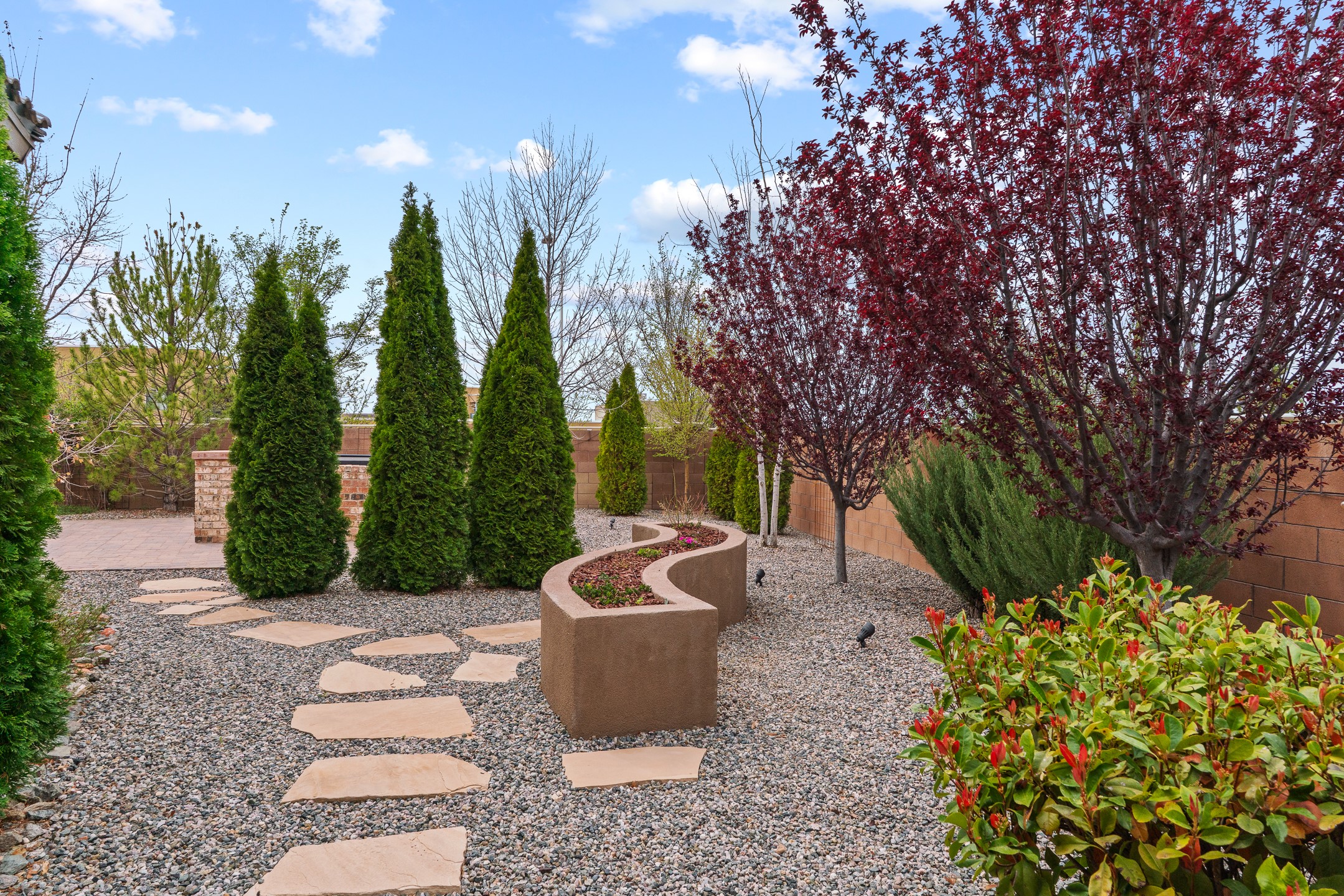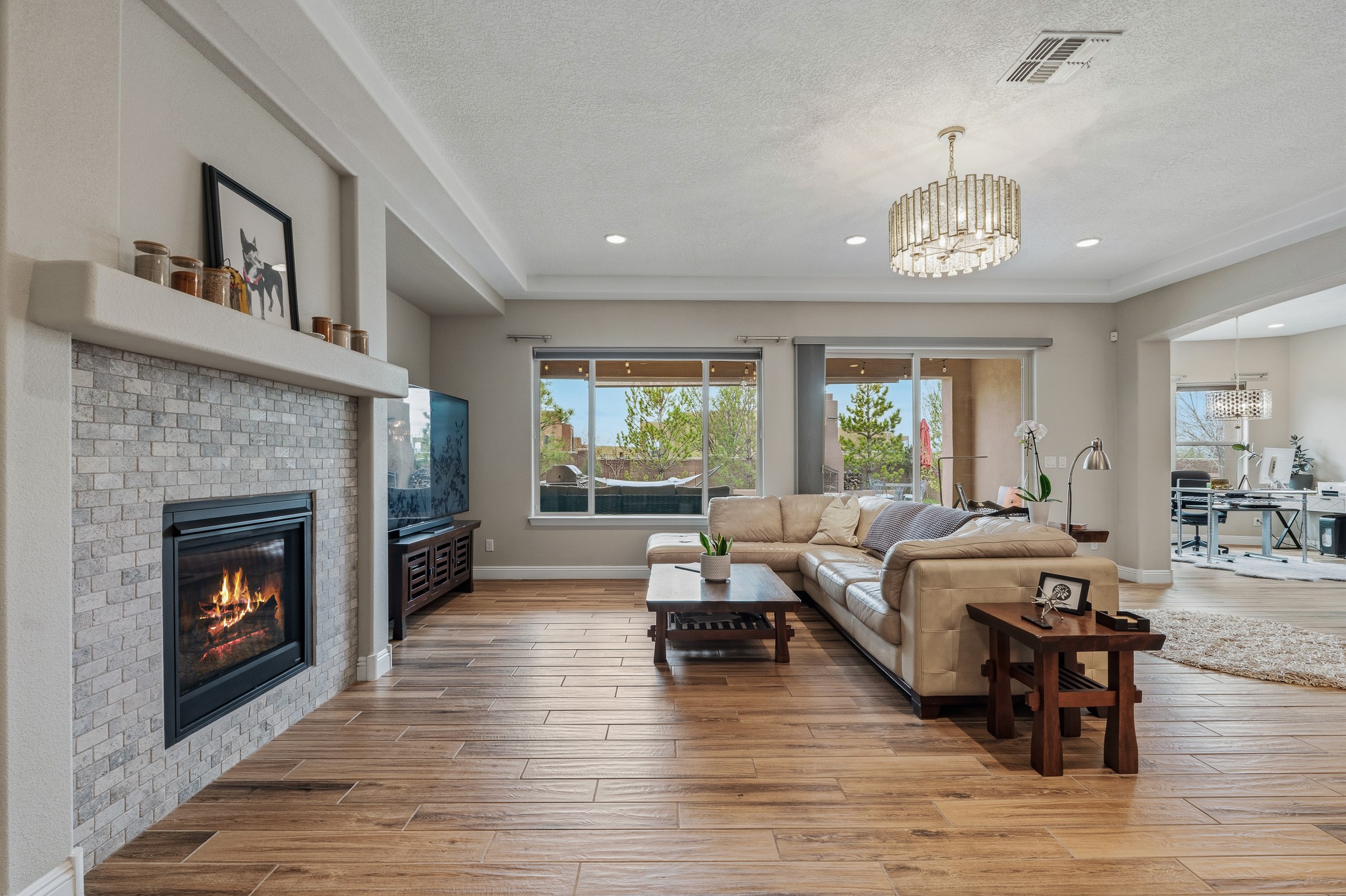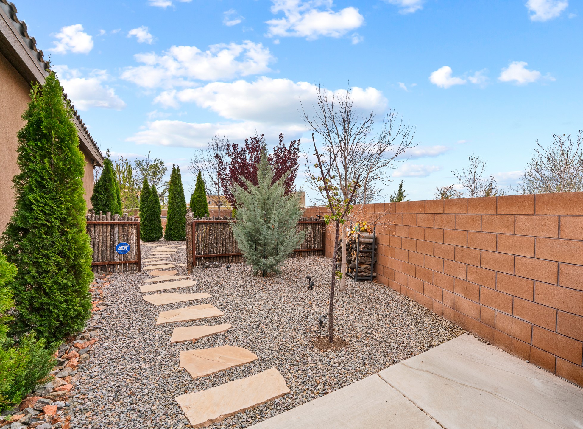 Nestled in the desirable Las Soleras subdivision, 4759 Lluvia Encantada offers refined single-level living with thoughtful upgrades, inviting indoor-outdoor spaces, and a highly convenient Santa Fe location. Enter through a gated Spanish-style courtyard into a bright, open floor plan designed for both everyday comfort and easy entertaining. Interior details include arched doorways, five-inch baseboards, upgraded lighting, natural gas fireplace, luxury carpeting with premium padding, and custom storage throughout, including beautifully designed bedroom, coat, and linen closets.The kitchen is both functional and elegant, featuring upgraded quartz countertops, stainless steel appliances, crown-molded cabinetry, under-cabinet lighting, a generous island, walk-in custom pantry, and butler's pantry for added organization. A bowed window dining area brings in natural light and creates an inviting setting for casual meals or morning coffee.The spacious living and dining areas transition seamlessly to a private backyard designed for relaxation and gathering. Enjoy a built-in Lion grill, custom outdoor fireplace, hot tub, water features, mature landscaping, and partial Jemez views, all creating a peaceful and well-appointed outdoor retreat.Additional features include zero-step patio access, walk-in shower, raised counters and toilets, a raised dishwasher, and a two-car garage plus an adjacent smaller garage ideal for a workshop, hobby space, or additional storage. Located just moments from Presbyterian Santa Fe Medical Center, shopping, dining, I-25, and NM-599, this home combines comfort, quality, and convenience in one of Santa Fe's most accessible neighborhoods.