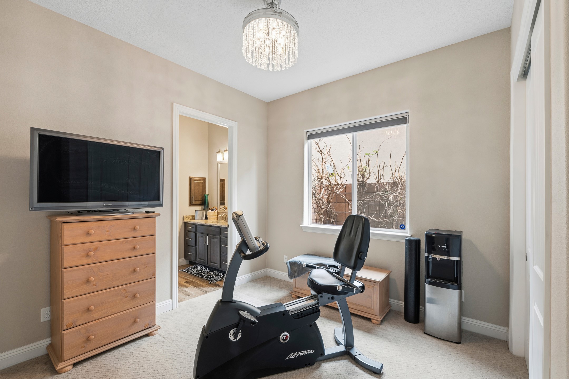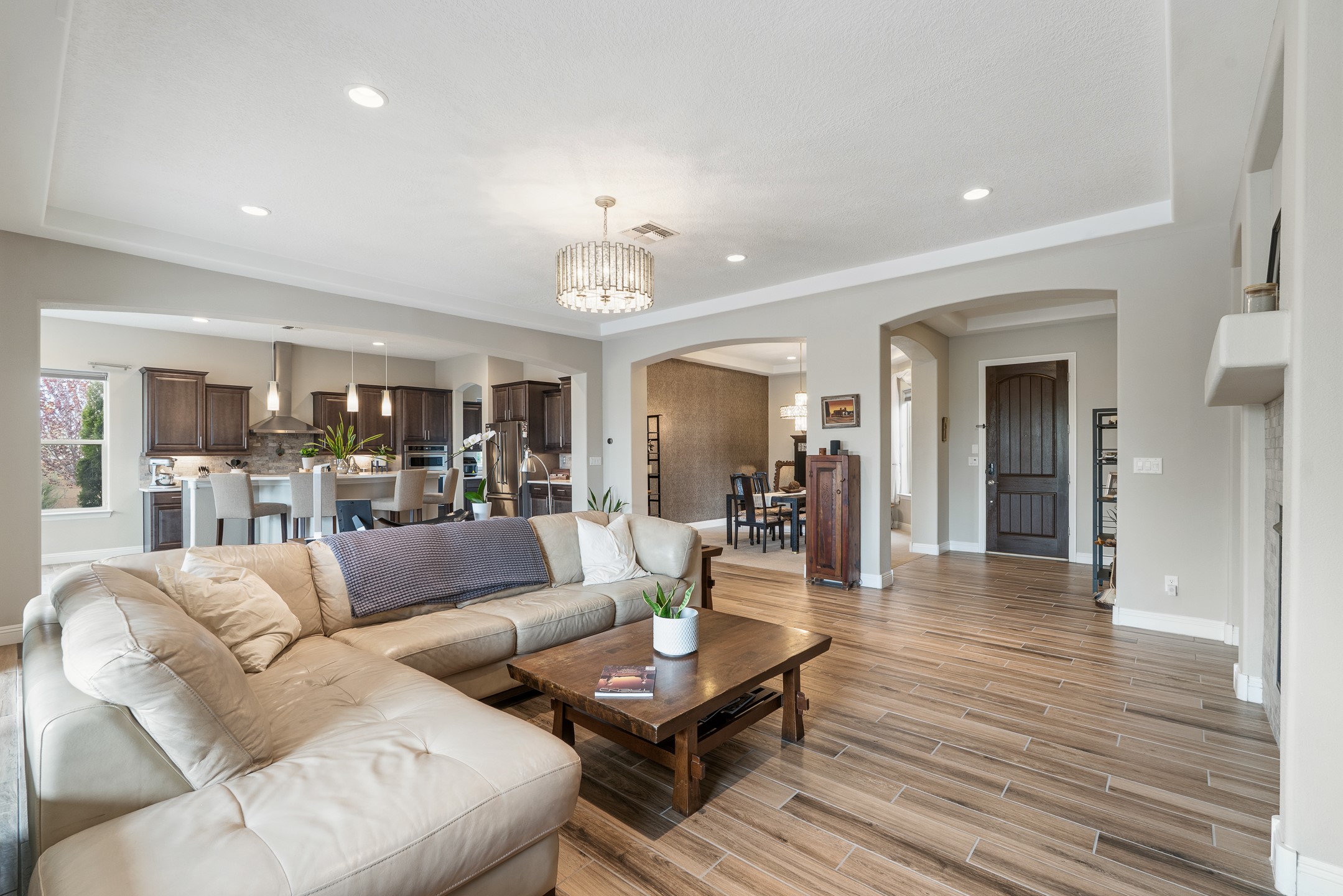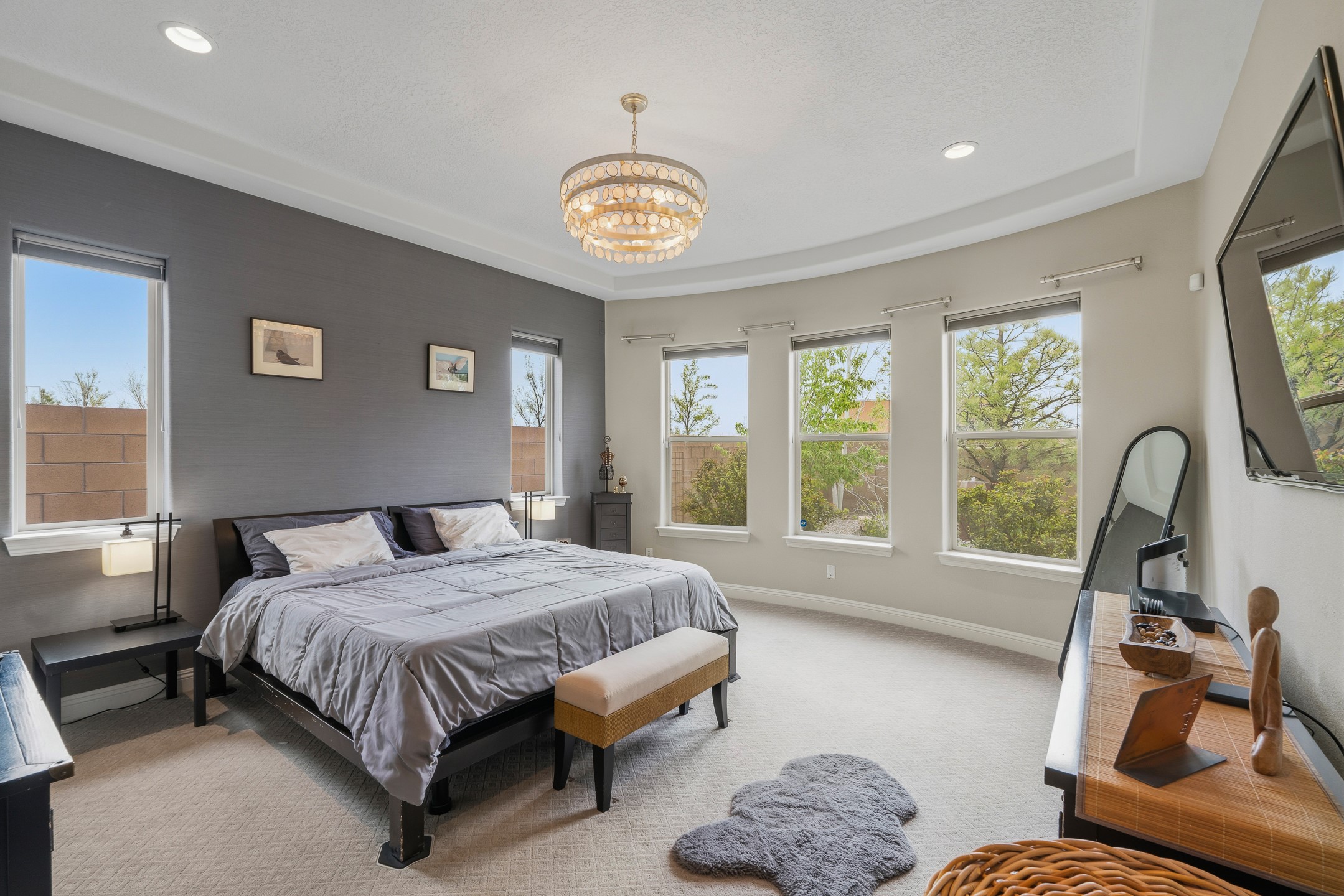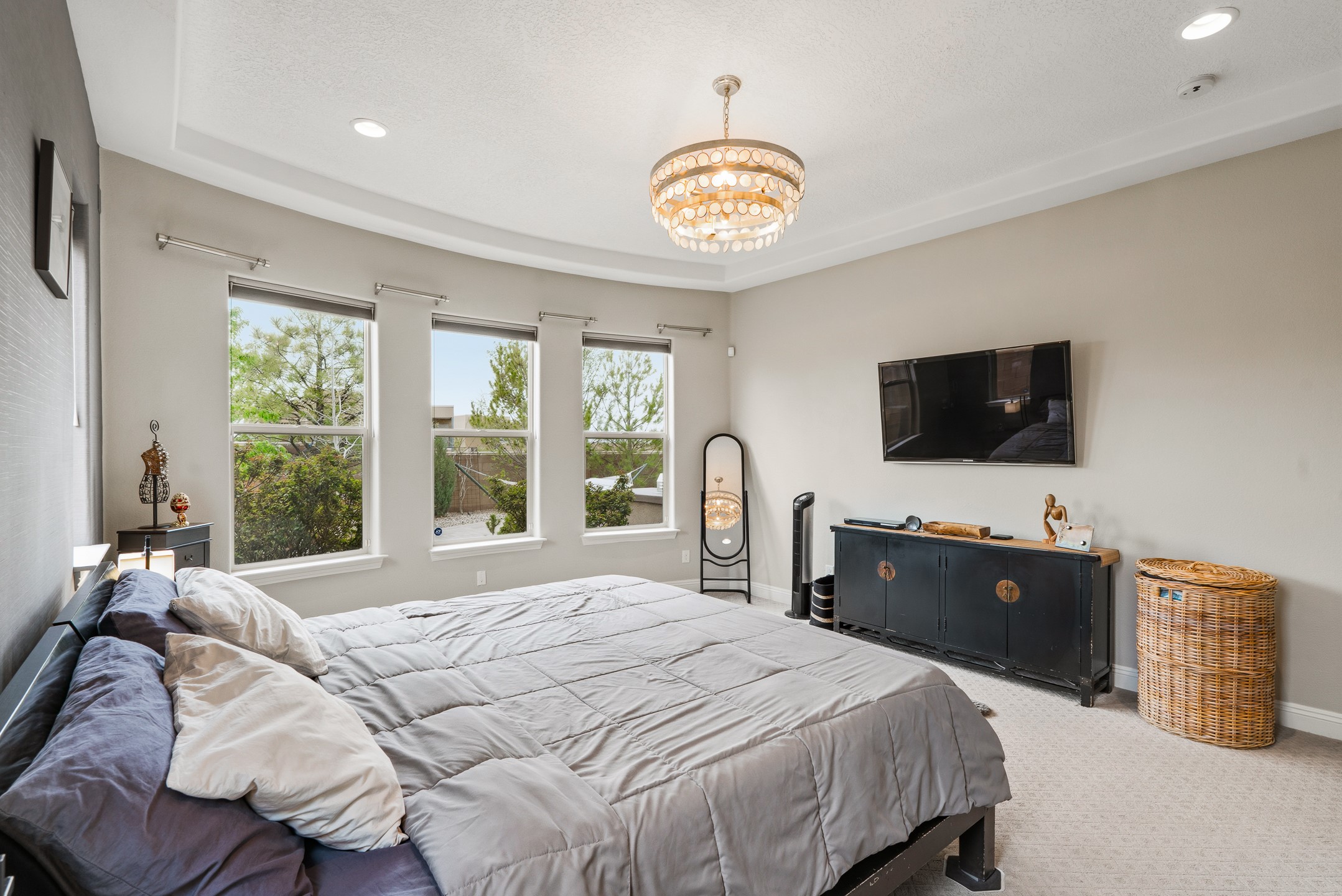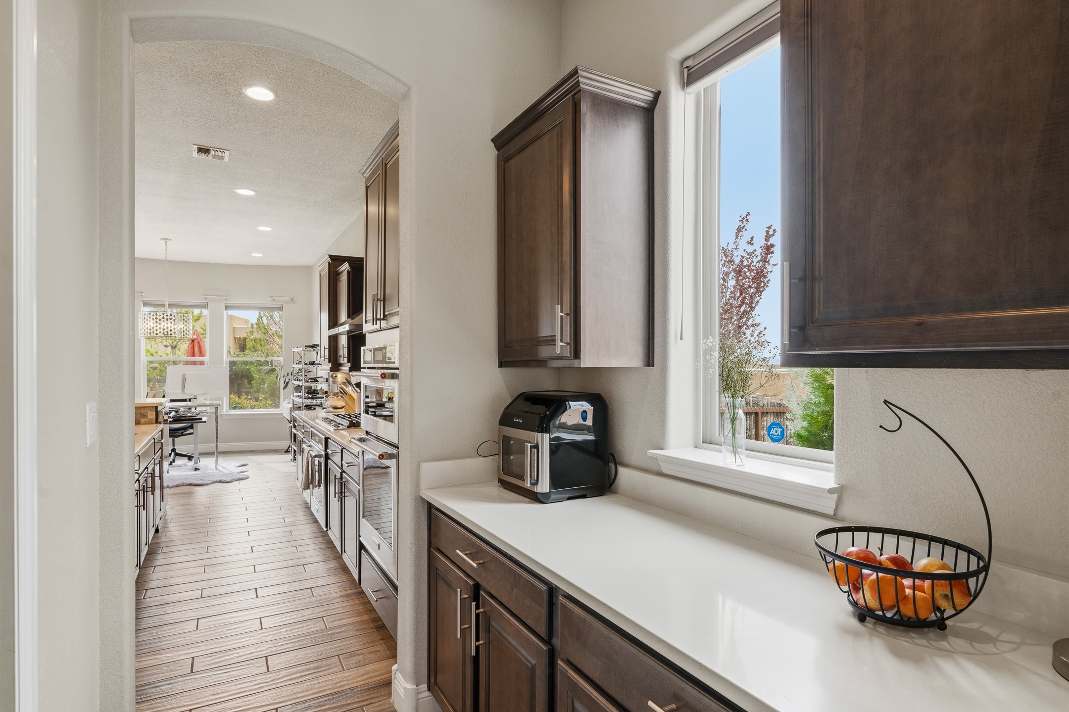 Nestled in the desirable Las Soleras subdivision, 4759 Lluvia Encantada offers refined single-level living with thoughtful upgrades, inviting indoor-outdoor spaces, and a highly convenient Santa Fe location. Enter through a gated Spanish-style courtyard into a bright, open floor plan designed for both everyday comfort and easy entertaining. Interior details include arched doorways, five-inch baseboards, upgraded lighting, natural gas fireplace, luxury carpeting with premium padding, and custom storage throughout, including beautifully designed bedroom, coat, and linen closets.The kitchen is both functional and elegant, featuring upgraded quartz countertops, stainless steel appliances, crown-molded cabinetry, under-cabinet lighting, a generous island, walk-in custom pantry, and butler's pantry for added organization. A bowed window dining area brings in natural light and creates an inviting setting for casual meals or morning coffee.The spacious living and dining areas transition seamlessly to a private backyard designed for relaxation and gathering. Enjoy a built-in Lion grill, custom outdoor fireplace, hot tub, water features, mature landscaping, and partial Jemez views, all creating a peaceful and well-appointed outdoor retreat.Additional features include zero-step patio access, walk-in shower, raised counters and toilets, a raised dishwasher, and a two-car garage plus an adjacent smaller garage ideal for a workshop, hobby space, or additional storage. Located just moments from Presbyterian Santa Fe Medical Center, shopping, dining, I-25, and NM-599, this home combines comfort, quality, and convenience in one of Santa Fe's most accessible neighborhoods.