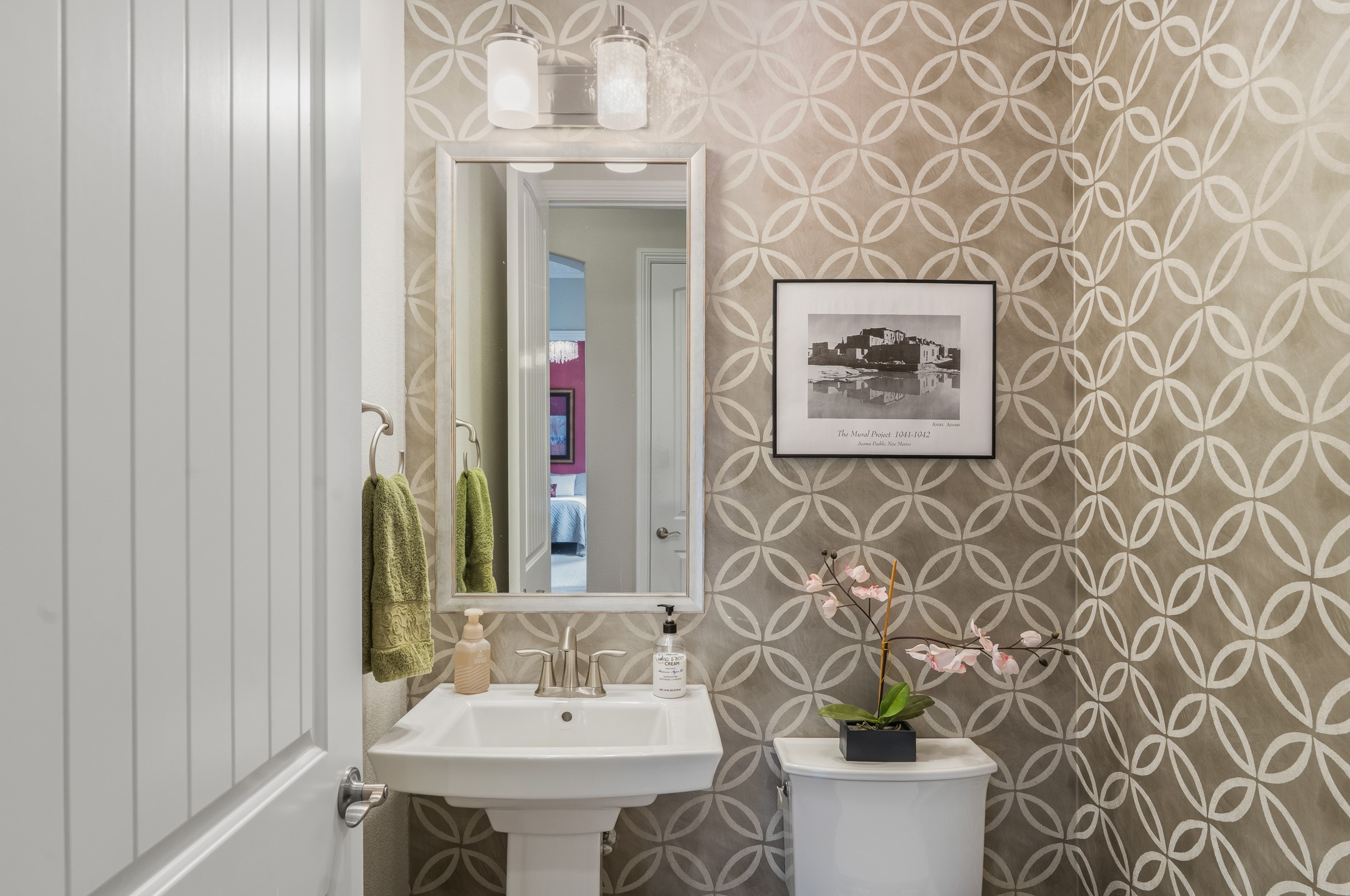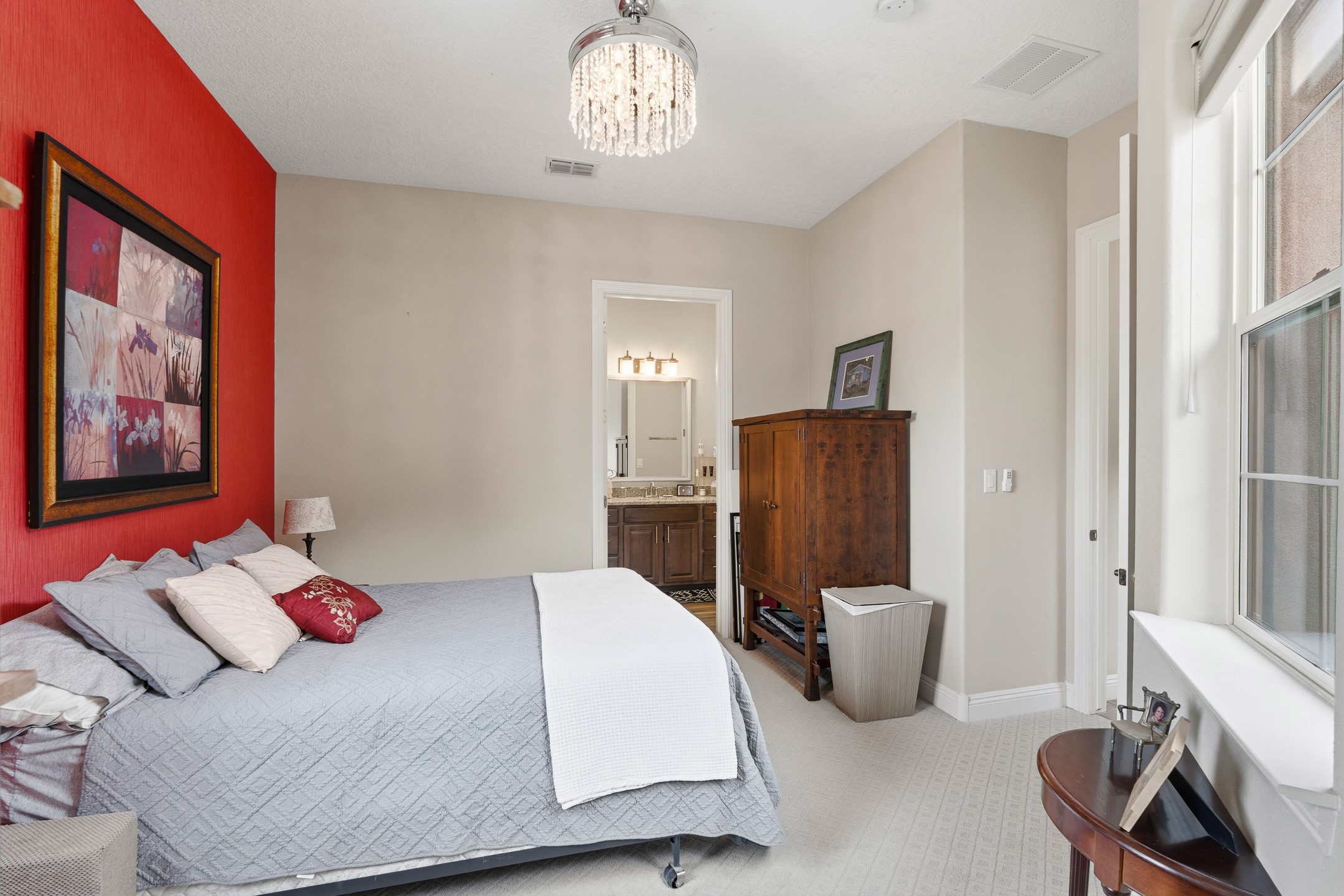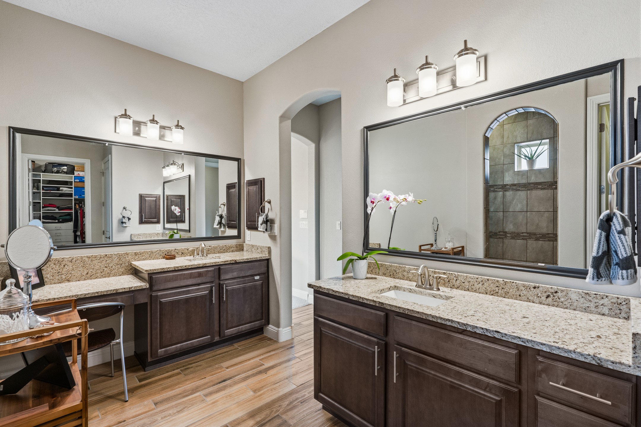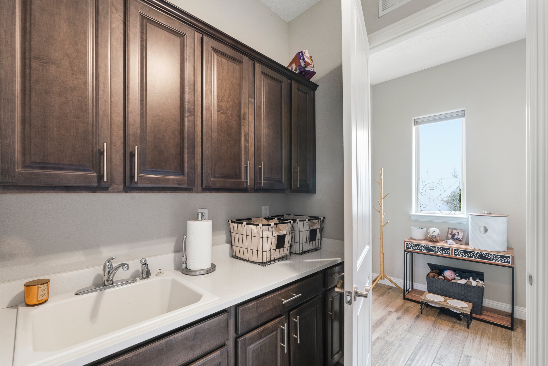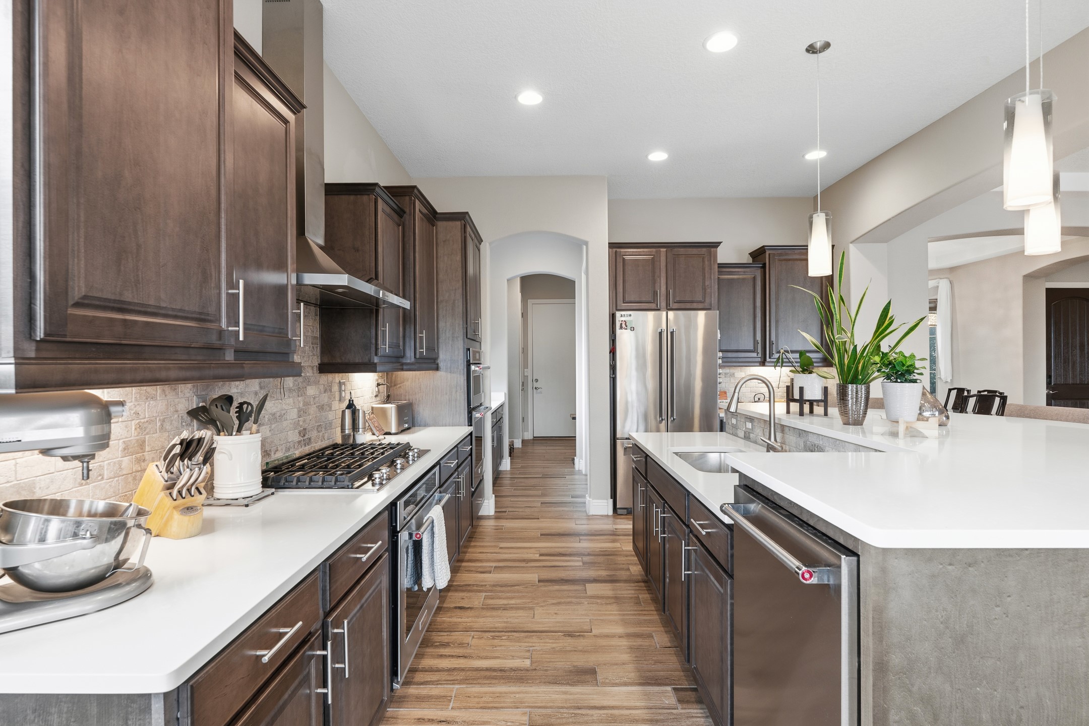 Nestled in the desirable Las Soleras subdivision, 4759 Lluvia Encantada offers refined single-level living with thoughtful upgrades, inviting indoor-outdoor spaces, and a highly convenient Santa Fe location. Enter through a gated Spanish-style courtyard into a bright, open floor plan designed for both everyday comfort and easy entertaining. Interior details include arched doorways, five-inch baseboards, upgraded lighting, natural gas fireplace, luxury carpeting with premium padding, and custom storage throughout, including beautifully designed bedroom, coat, and linen closets.The kitchen is both functional and elegant, featuring upgraded quartz countertops, stainless steel appliances, crown-molded cabinetry, under-cabinet lighting, a generous island, walk-in custom pantry, and butler's pantry for added organization. A bowed window dining area brings in natural light and creates an inviting setting for casual meals or morning coffee.The spacious living and dining areas transition seamlessly to a private backyard designed for relaxation and gathering. Enjoy a built-in Lion grill, custom outdoor fireplace, hot tub, water features, mature landscaping, and partial Jemez views, all creating a peaceful and well-appointed outdoor retreat.Additional features include zero-step patio access, walk-in shower, raised counters and toilets, a raised dishwasher, and a two-car garage plus an adjacent smaller garage ideal for a workshop, hobby space, or additional storage. Located just moments from Presbyterian Santa Fe Medical Center, shopping, dining, I-25, and NM-599, this home combines comfort, quality, and convenience in one of Santa Fe's most accessible neighborhoods.