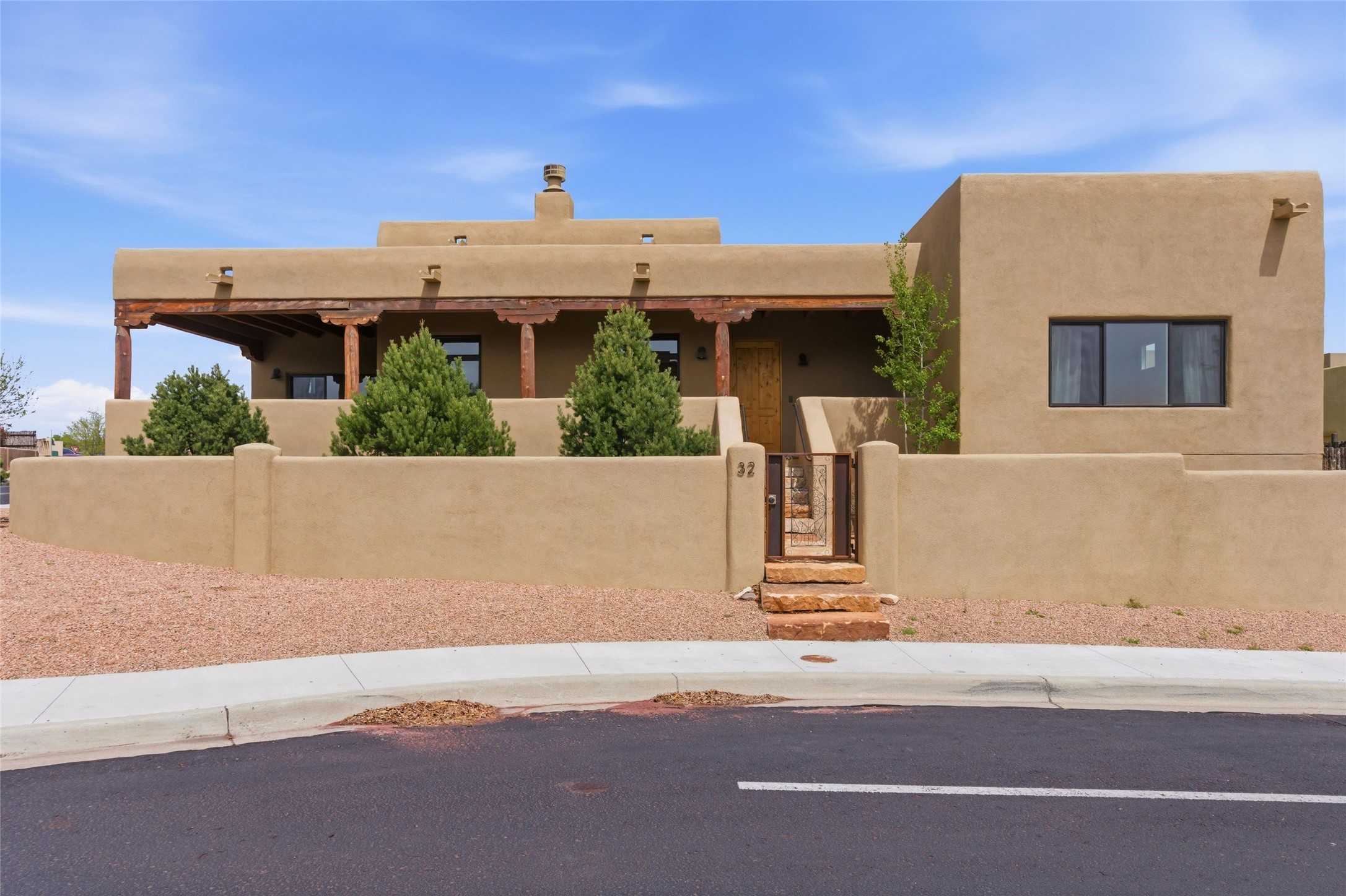 Sophistication meets Santa Fe charm at 32 Calle Lemita, an elegant residence in the coveted Aldea de Santa Fe community. This 3-bed, 3-bath home offers refined living on a 0.16-acre lot with stunning natural light and partial sunset views. The open, airy floor plan highlights soaring ceilings, rich finishes, and seamless flow between living, dining, and kitchen--perfect for stylish entertaining. The expansive living room offers a stacked stone fireplace, high ceilings and traditional Vigas. Plaster walls throughout the main living area. The chef's kitchen boasts premium cabinetry with soft close drawers, generous counter space with quartz countertops, designer tile backsplash and high-end stainless steel appliances. Massive pantry/storage room off the kitchen. The luxurious primary suite offers a spa-inspired bath, one of the most custom walk-in closets you will ever view, plus separate shower and jacuzzi tub. Two additional oversized bedrooms provide versatility for guests or a home office. Laundry room with sink and built-in cabinetry. Whole house radiant cooling/heating system. Adjacent to the heated/cooled 4 car garage is a flex room, perfect for a home gym or studio space. Outdoor living shines with a private enclosed courtyard and elevated patio designed to capture Santa Fe's dramatic sunsets. Lots of wonderful upgrades, such as LED recessed lights, floor to ceiling tile in multiple bathrooms, carved stone sinks and much more. Located approximately 20 minutes from the historic Santa Fe plaza, Aldea de Santa Fe offers exclusive amenities including walking trails, pickleball/tennis/basketball, community gathering spaces, and easy access to fine dining, galleries, and world-class cultural events. This property is ideal as a sophisticated full-time residence or lock-and-leave retreat for discerning buyers seeking style, privacy, and connection to Santa Fe's vibrant lifestyle.