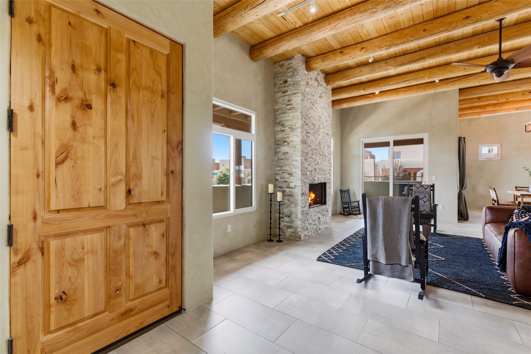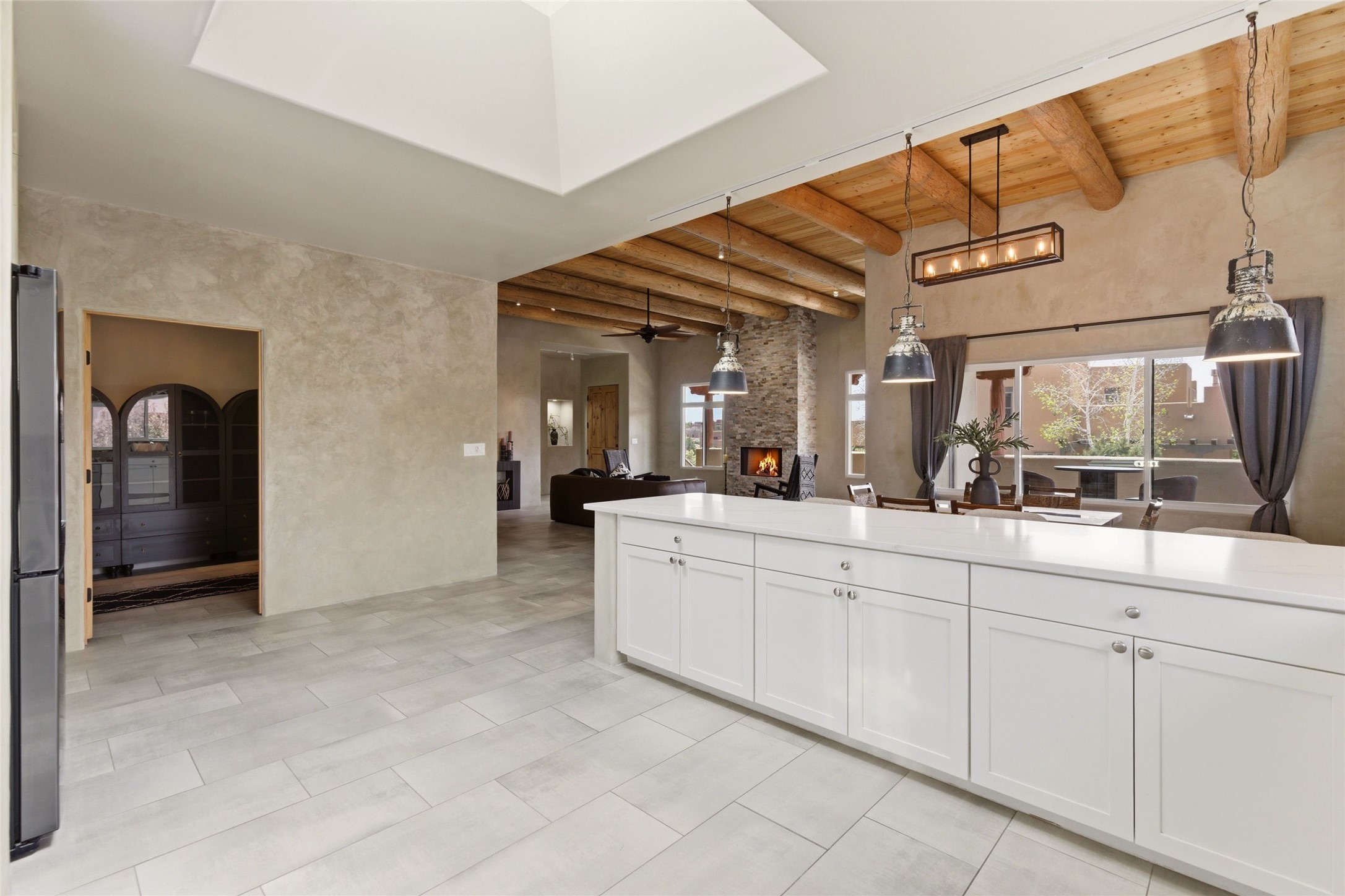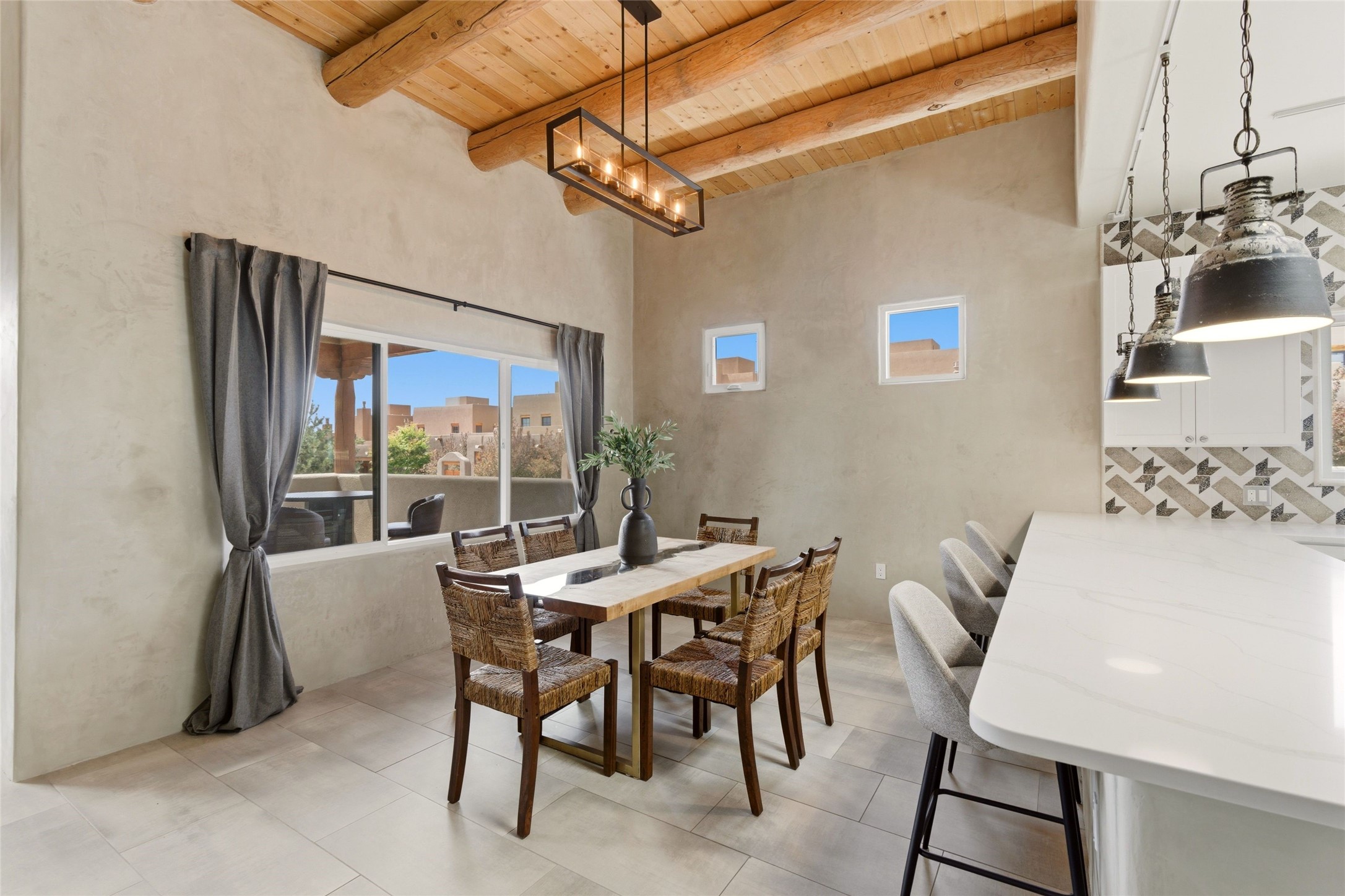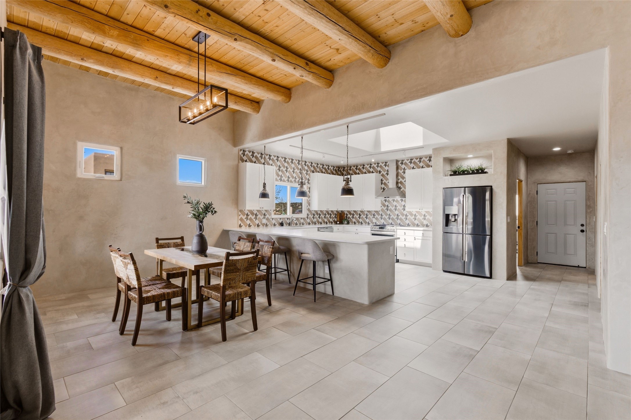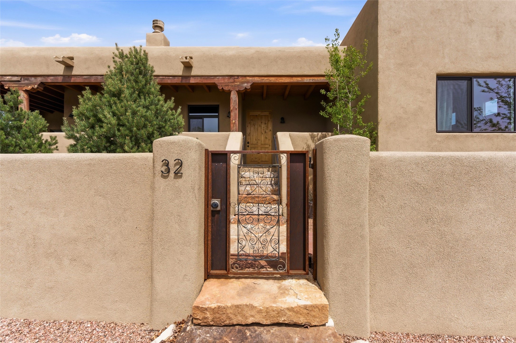 Sophistication meets Santa Fe charm at 32 Calle Lemita, an elegant residence in the coveted Aldea de Santa Fe community. This 3-bed, 3-bath home offers refined living on a 0.16-acre lot with stunning natural light and partial sunset views. The open, airy floor plan highlights soaring ceilings, rich finishes, and seamless flow between living, dining, and kitchen--perfect for stylish entertaining. The expansive living room offers a stacked stone fireplace, high ceilings and traditional Vigas. Plaster walls throughout the main living area. The chef's kitchen boasts premium cabinetry with soft close drawers, generous counter space with quartz countertops, designer tile backsplash and high-end stainless steel appliances. Massive pantry/storage room off the kitchen. The luxurious primary suite offers a spa-inspired bath, one of the most custom walk-in closets you will ever view, plus separate shower and jacuzzi tub. Two additional oversized bedrooms provide versatility for guests or a home office. Laundry room with sink and built-in cabinetry. Whole house radiant cooling/heating system. Adjacent to the heated/cooled 4 car garage is a flex room, perfect for a home gym or studio space. Outdoor living shines with a private enclosed courtyard and elevated patio designed to capture Santa Fe's dramatic sunsets. Lots of wonderful upgrades, such as LED recessed lights, floor to ceiling tile in multiple bathrooms, carved stone sinks and much more. Located approximately 20 minutes from the historic Santa Fe plaza, Aldea de Santa Fe offers exclusive amenities including walking trails, pickleball/tennis/basketball, community gathering spaces, and easy access to fine dining, galleries, and world-class cultural events. This property is ideal as a sophisticated full-time residence or lock-and-leave retreat for discerning buyers seeking style, privacy, and connection to Santa Fe's vibrant lifestyle.