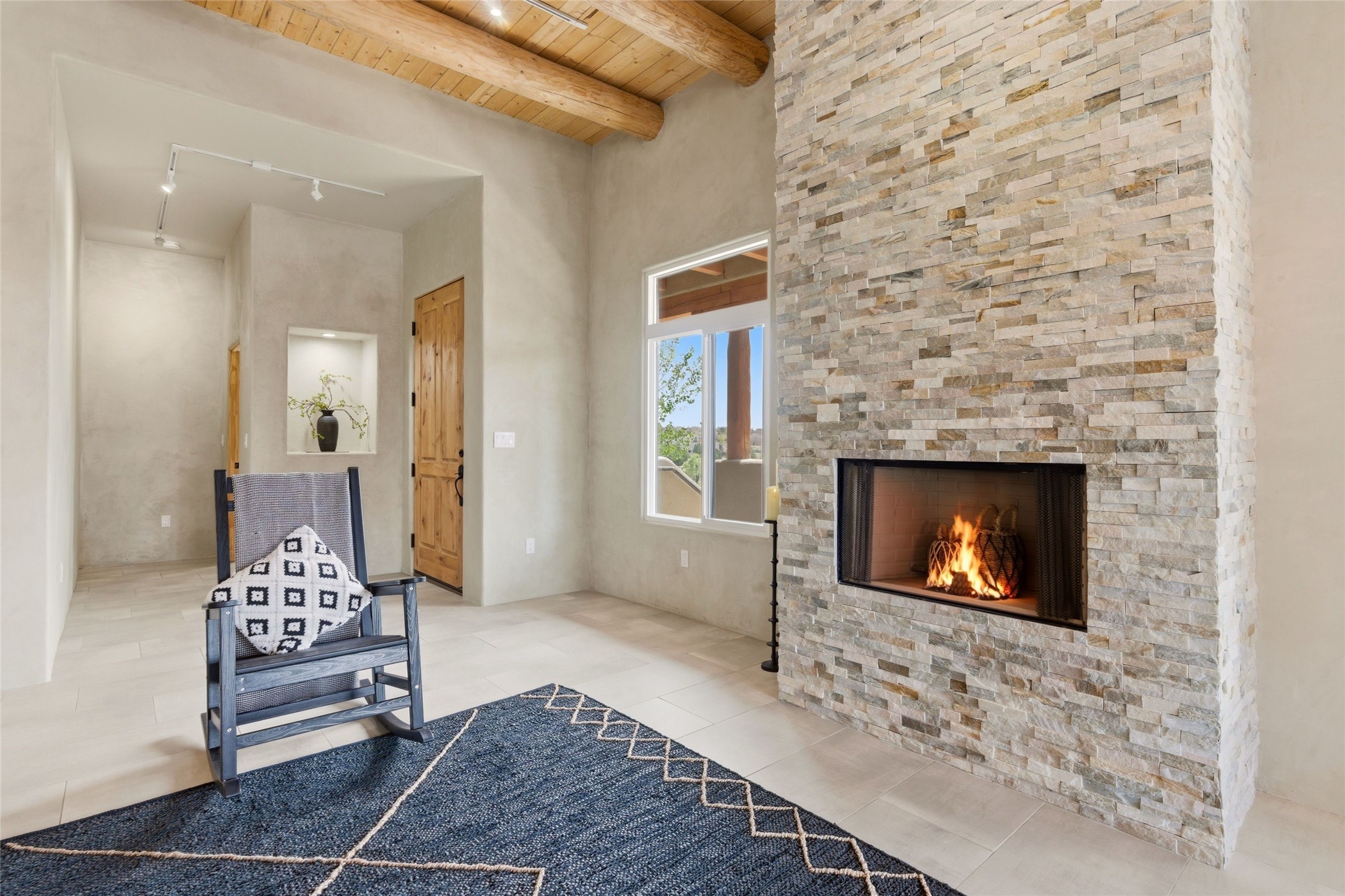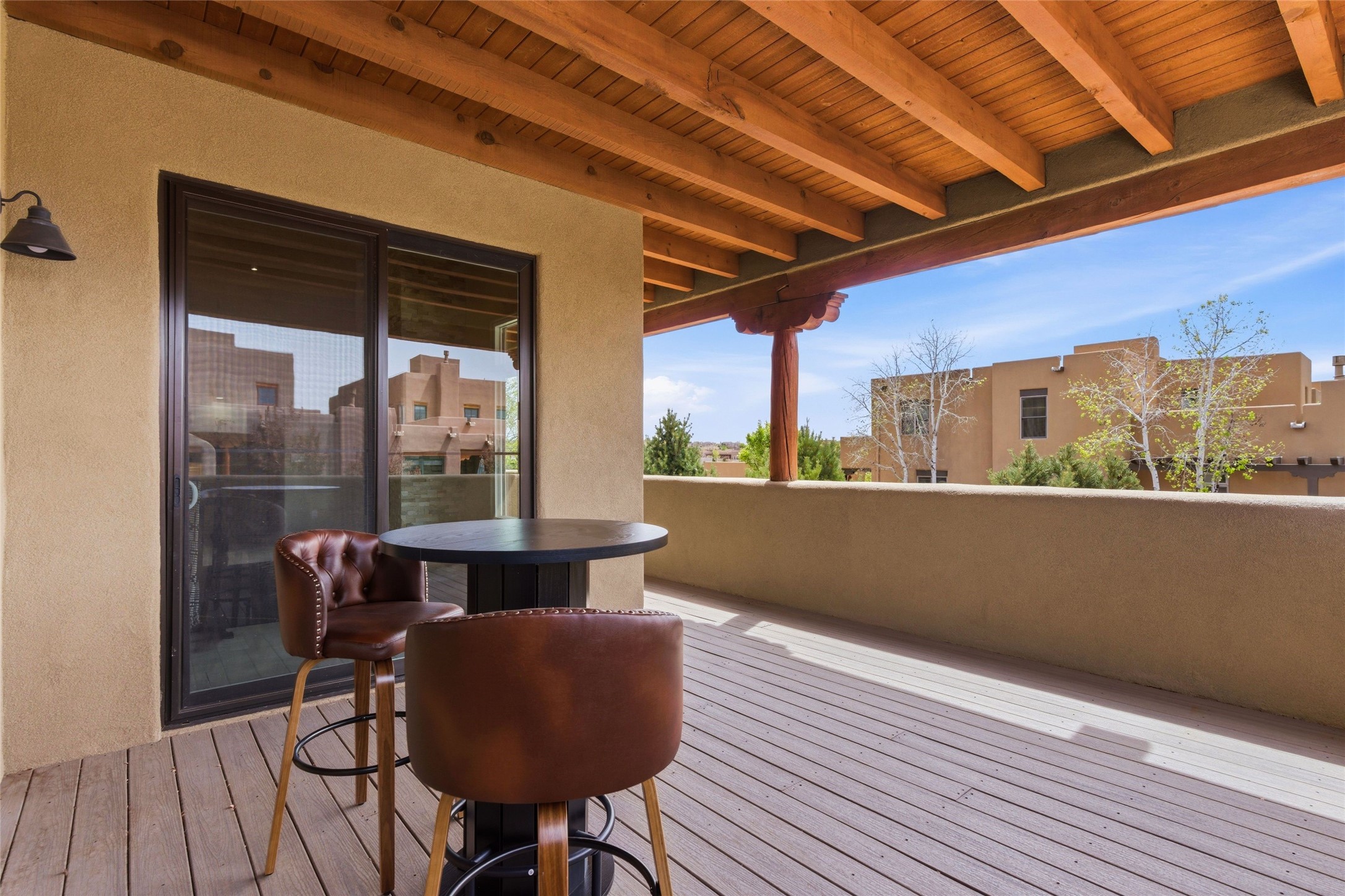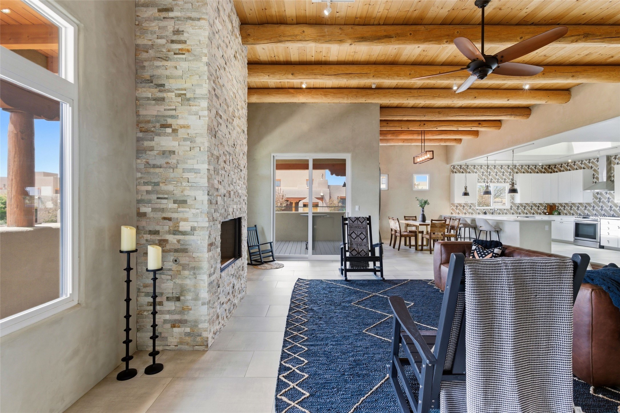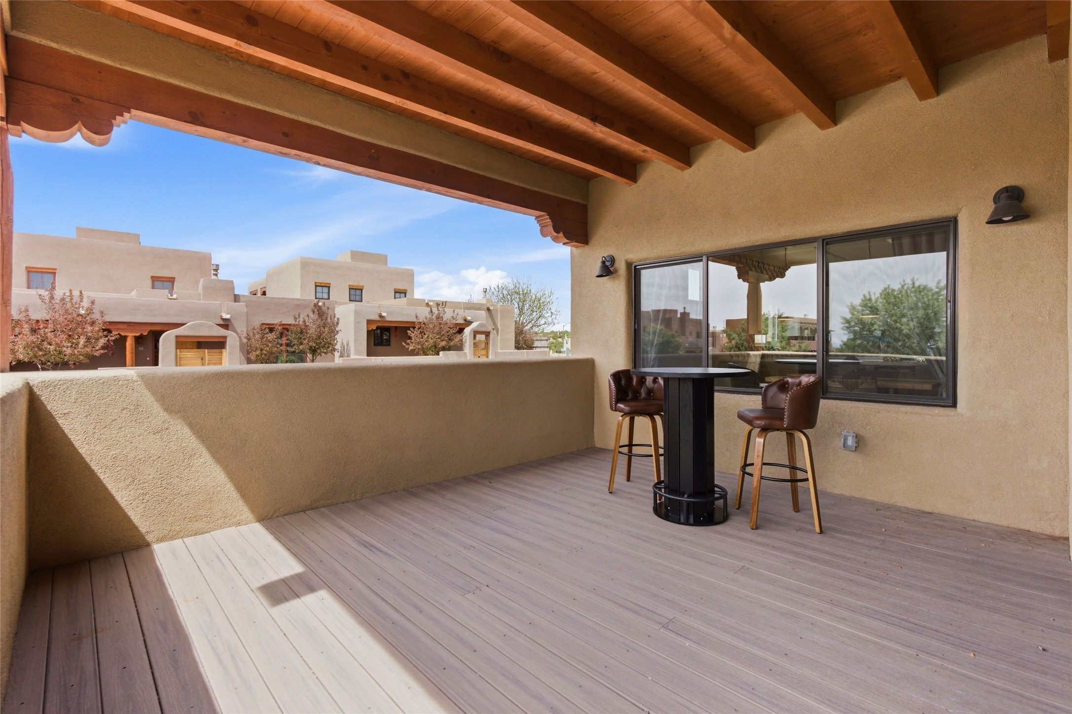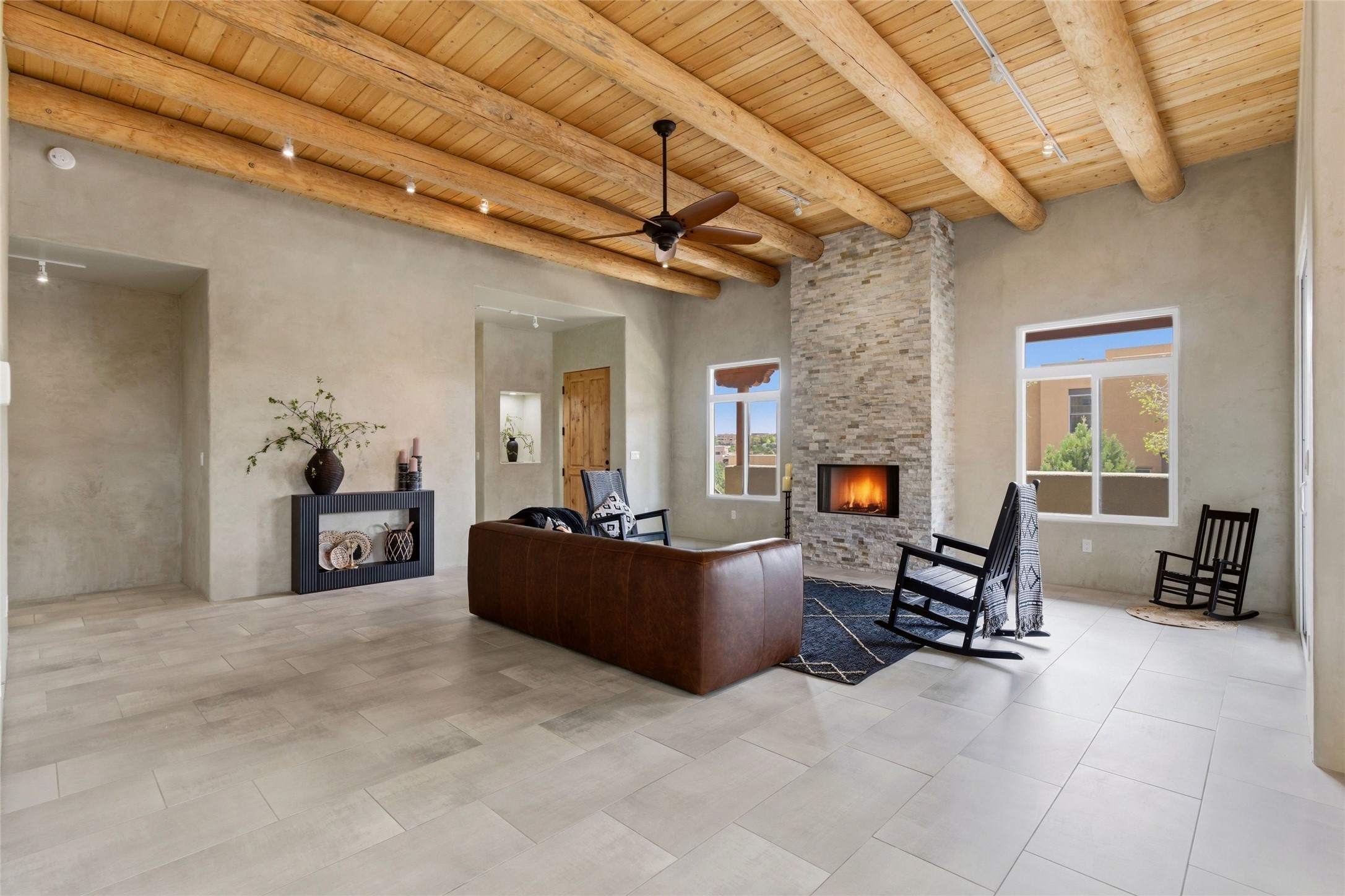 Sophistication meets Santa Fe charm at 32 Calle Lemita, an elegant residence in the coveted Aldea de Santa Fe community. This 3-bed, 3-bath home offers refined living on a 0.16-acre lot with stunning natural light and partial sunset views. The open, airy floor plan highlights soaring ceilings, rich finishes, and seamless flow between living, dining, and kitchen--perfect for stylish entertaining. The expansive living room offers a stacked stone fireplace, high ceilings and traditional Vigas. Plaster walls throughout the main living area. The chef's kitchen boasts premium cabinetry with soft close drawers, generous counter space with quartz countertops, designer tile backsplash and high-end stainless steel appliances. Massive pantry/storage room off the kitchen. The luxurious primary suite offers a spa-inspired bath, one of the most custom walk-in closets you will ever view, plus separate shower and jacuzzi tub. Two additional oversized bedrooms provide versatility for guests or a home office. Laundry room with sink and built-in cabinetry. Whole house radiant cooling/heating system. Adjacent to the heated/cooled 4 car garage is a flex room, perfect for a home gym or studio space. Outdoor living shines with a private enclosed courtyard and elevated patio designed to capture Santa Fe's dramatic sunsets. Lots of wonderful upgrades, such as LED recessed lights, floor to ceiling tile in multiple bathrooms, carved stone sinks and much more. Located approximately 20 minutes from the historic Santa Fe plaza, Aldea de Santa Fe offers exclusive amenities including walking trails, pickleball/tennis/basketball, community gathering spaces, and easy access to fine dining, galleries, and world-class cultural events. This property is ideal as a sophisticated full-time residence or lock-and-leave retreat for discerning buyers seeking style, privacy, and connection to Santa Fe's vibrant lifestyle.