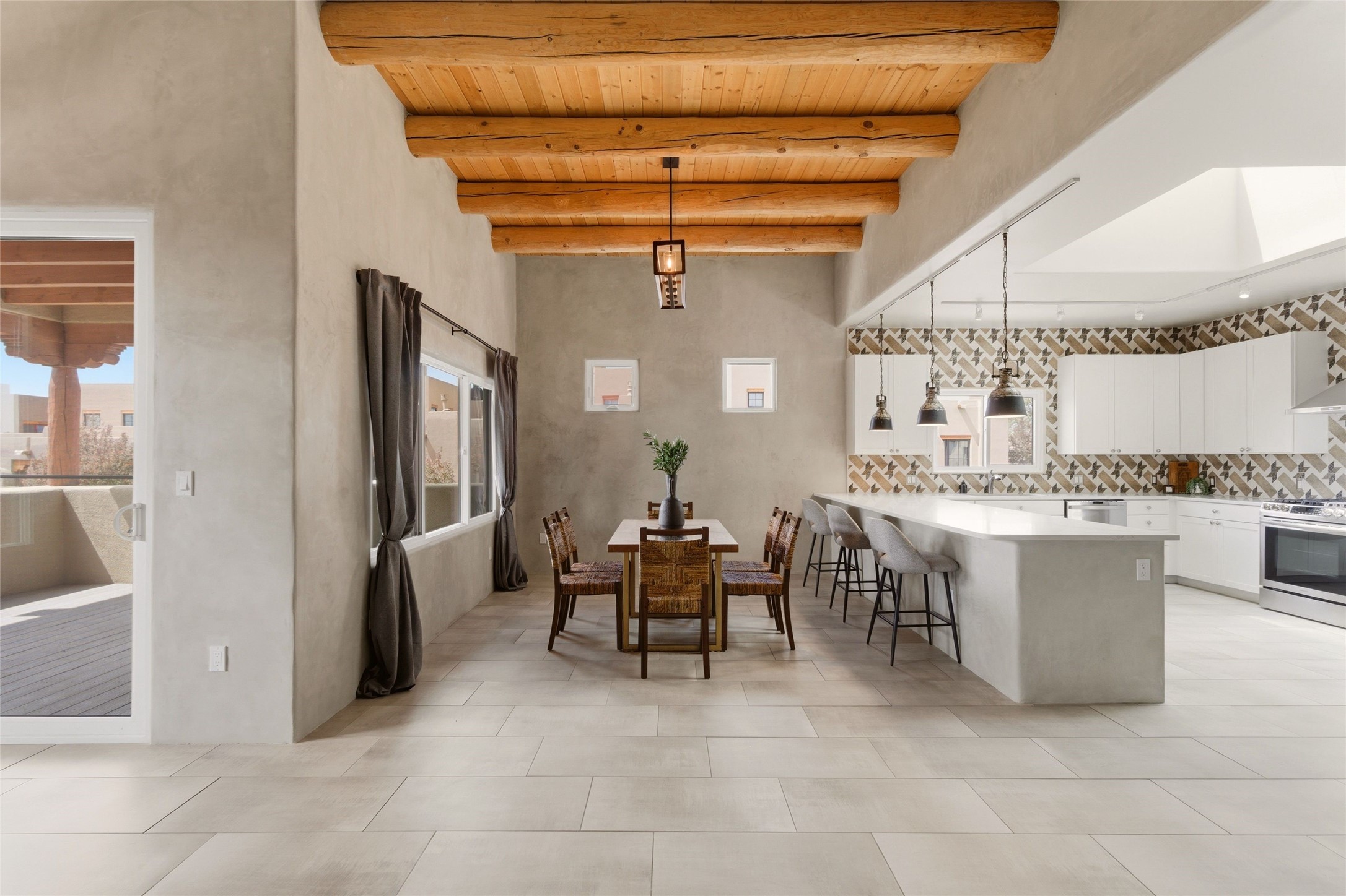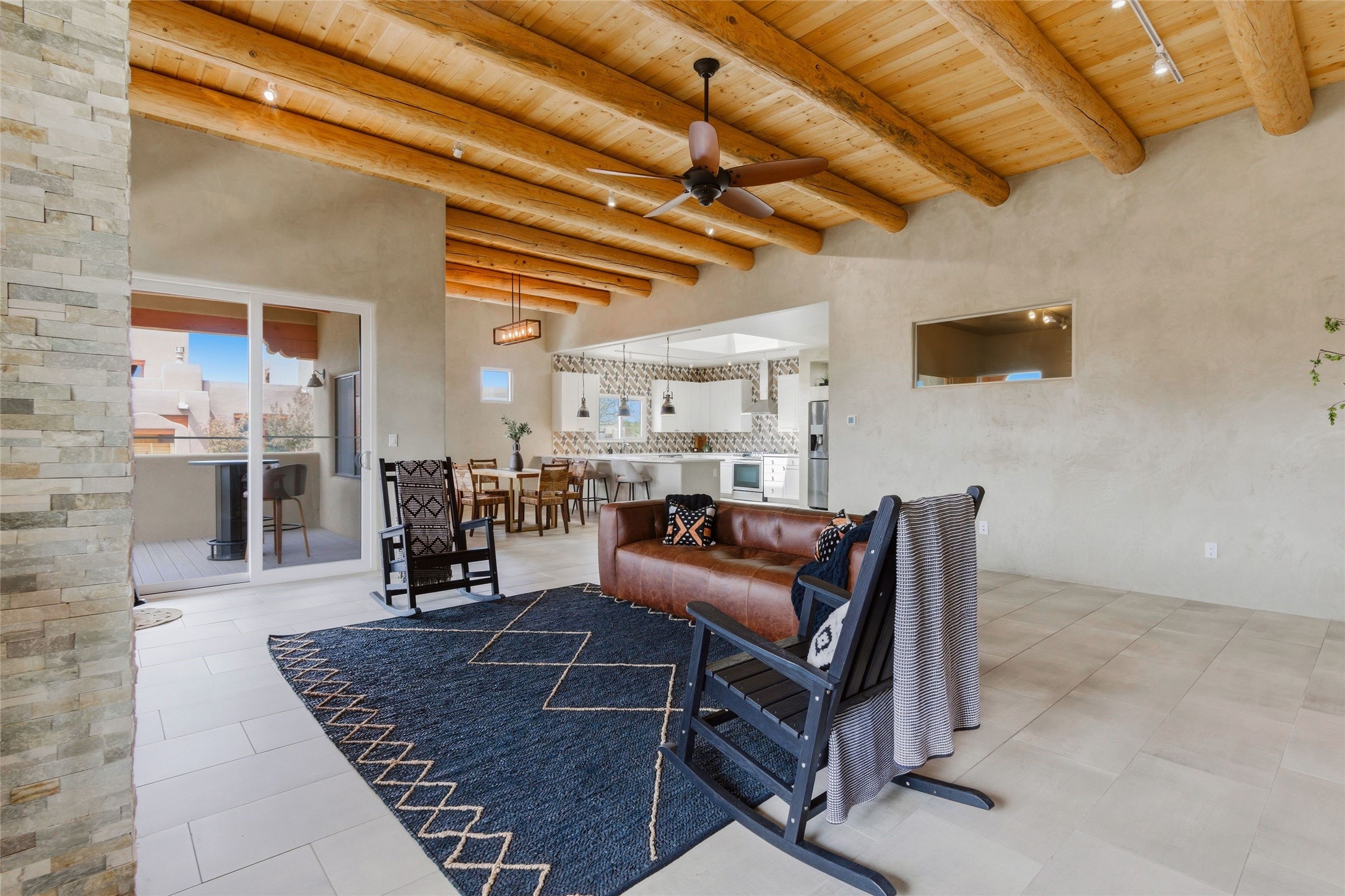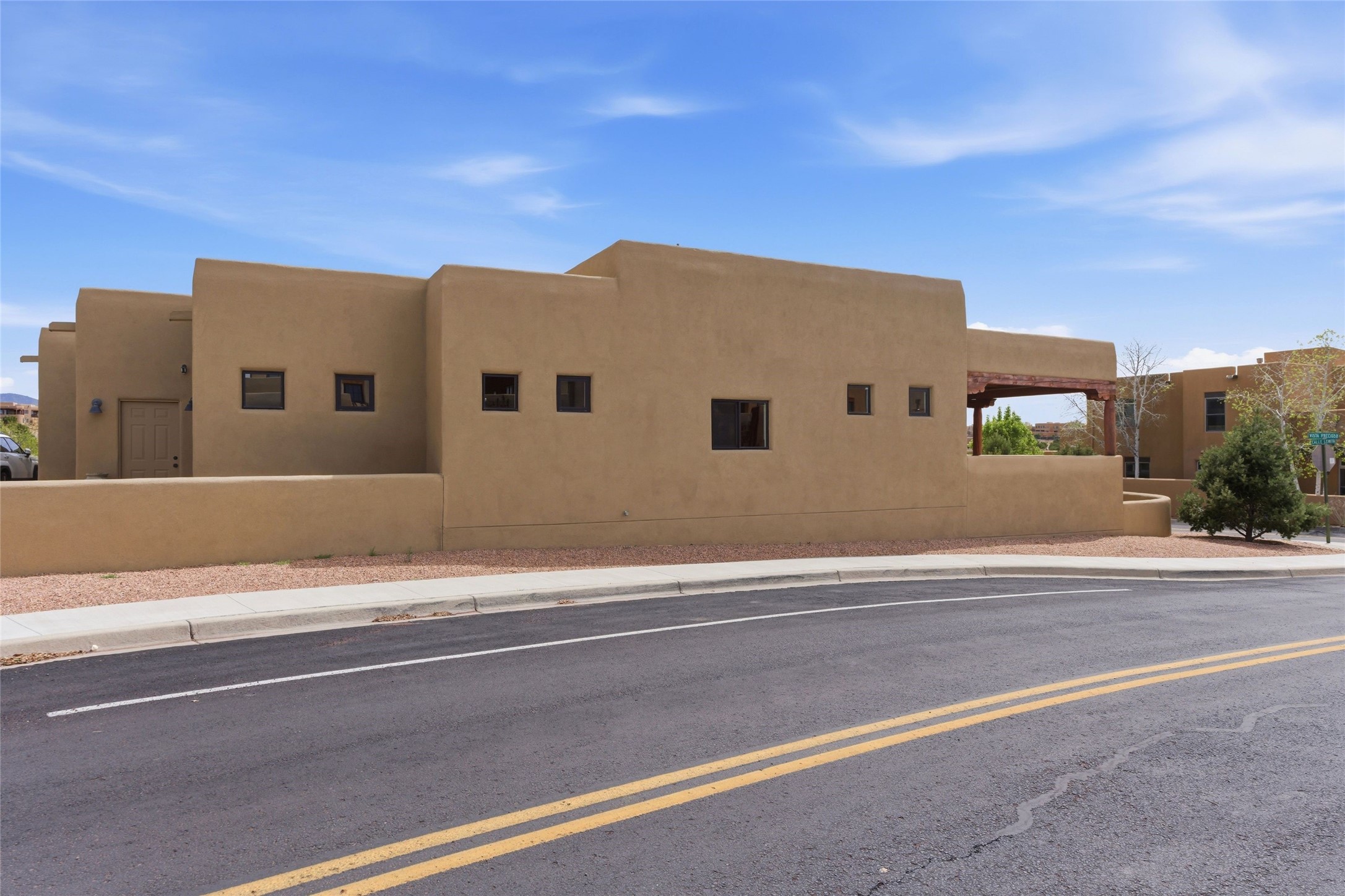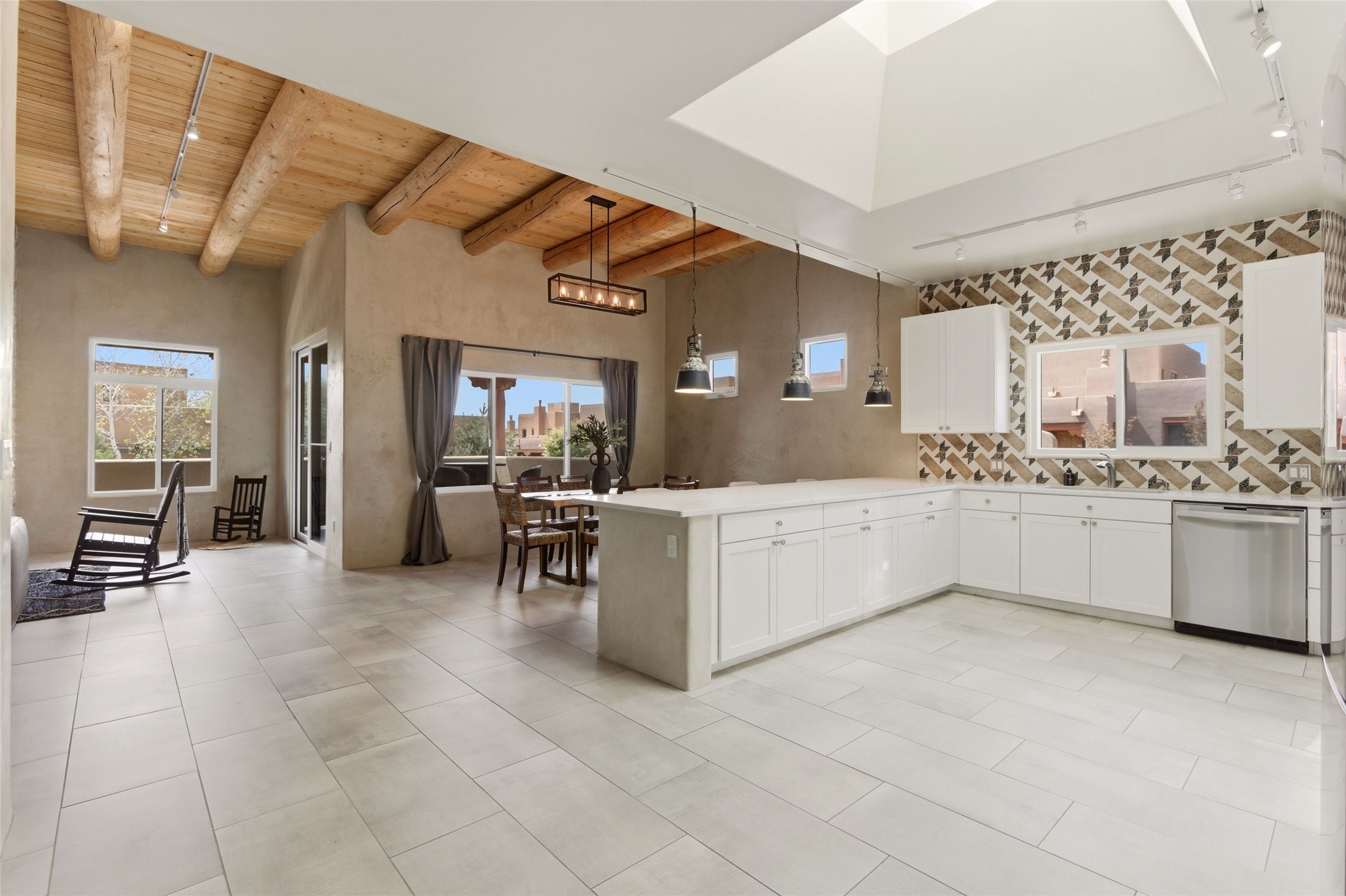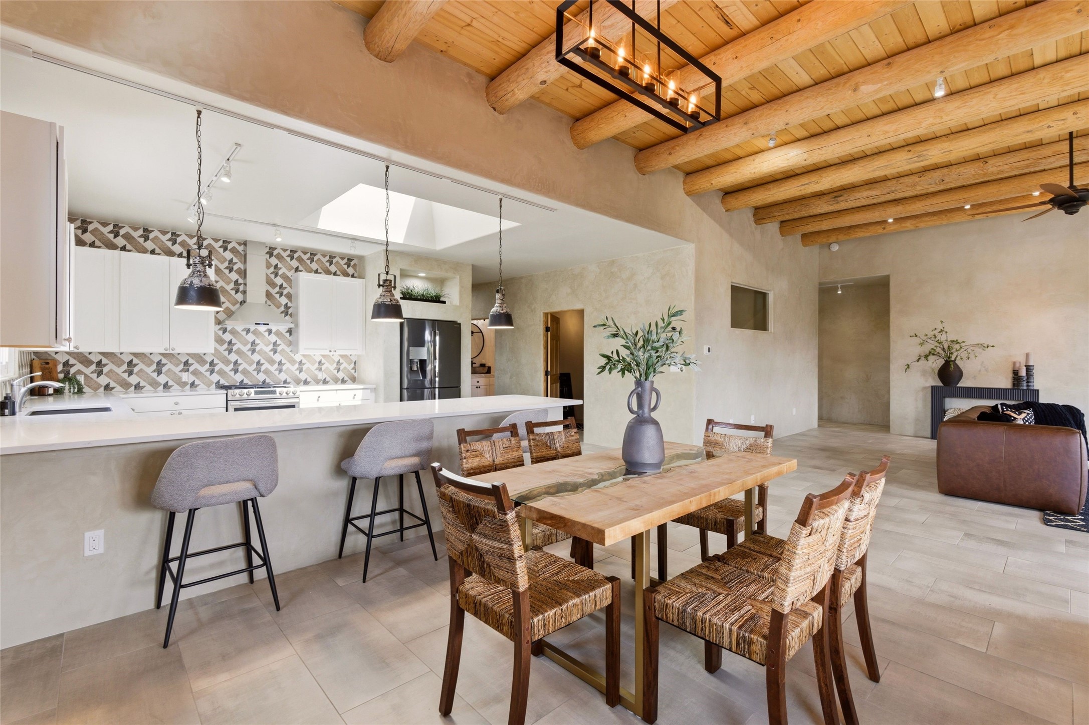 Sophistication meets Santa Fe charm at 32 Calle Lemita, an elegant residence in the coveted Aldea de Santa Fe community. This 3-bed, 3-bath home offers refined living on a 0.16-acre lot with stunning natural light and partial sunset views. The open, airy floor plan highlights soaring ceilings, rich finishes, and seamless flow between living, dining, and kitchen--perfect for stylish entertaining. The expansive living room offers a stacked stone fireplace, high ceilings and traditional Vigas. Plaster walls throughout the main living area. The chef's kitchen boasts premium cabinetry with soft close drawers, generous counter space with quartz countertops, designer tile backsplash and high-end stainless steel appliances. Massive pantry/storage room off the kitchen. The luxurious primary suite offers a spa-inspired bath, one of the most custom walk-in closets you will ever view, plus separate shower and jacuzzi tub. Two additional oversized bedrooms provide versatility for guests or a home office. Laundry room with sink and built-in cabinetry. Whole house radiant cooling/heating system. Adjacent to the heated/cooled 4 car garage is a flex room, perfect for a home gym or studio space. Outdoor living shines with a private enclosed courtyard and elevated patio designed to capture Santa Fe's dramatic sunsets. Lots of wonderful upgrades, such as LED recessed lights, floor to ceiling tile in multiple bathrooms, carved stone sinks and much more. Located approximately 20 minutes from the historic Santa Fe plaza, Aldea de Santa Fe offers exclusive amenities including walking trails, pickleball/tennis/basketball, community gathering spaces, and easy access to fine dining, galleries, and world-class cultural events. This property is ideal as a sophisticated full-time residence or lock-and-leave retreat for discerning buyers seeking style, privacy, and connection to Santa Fe's vibrant lifestyle.