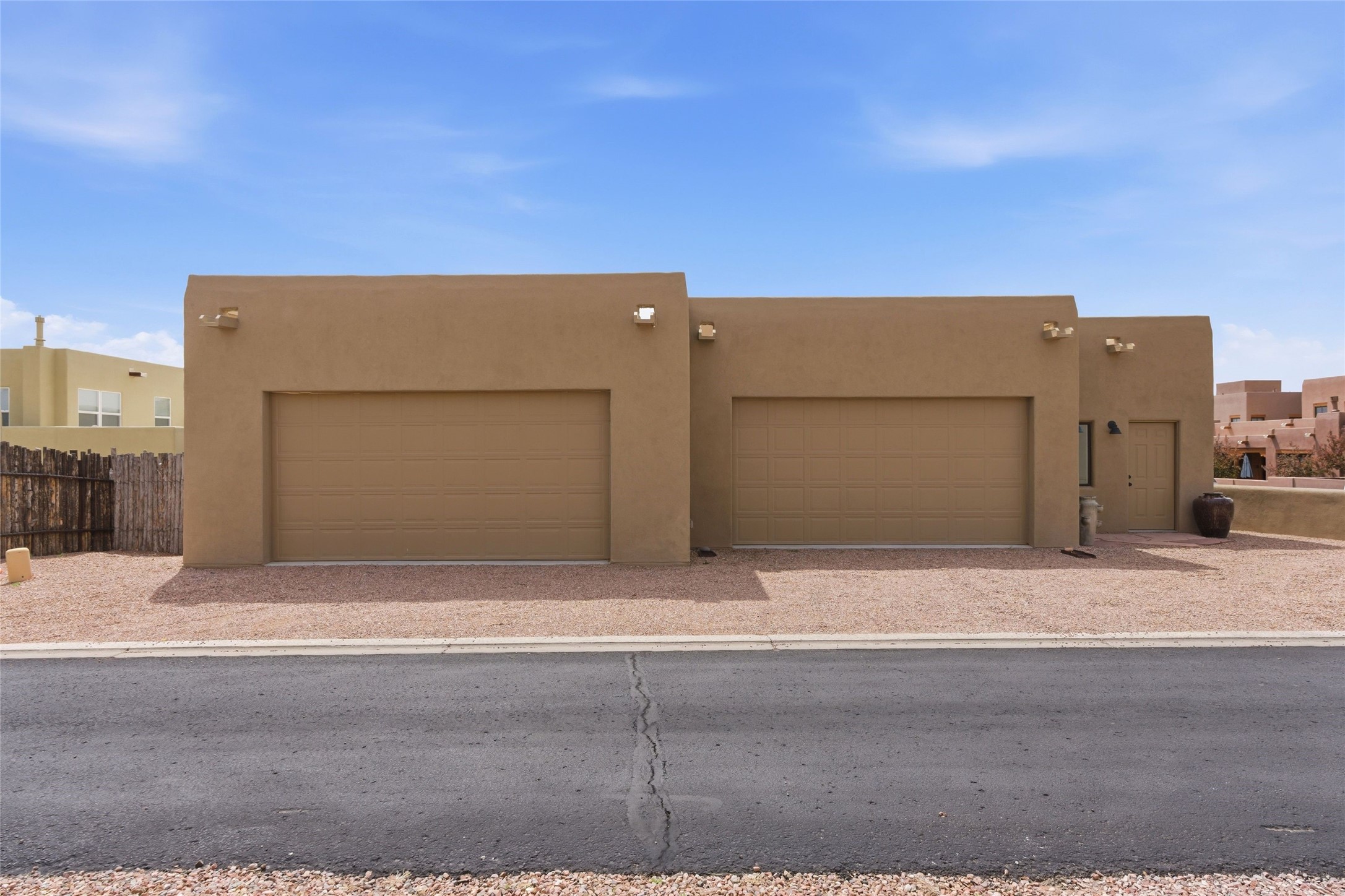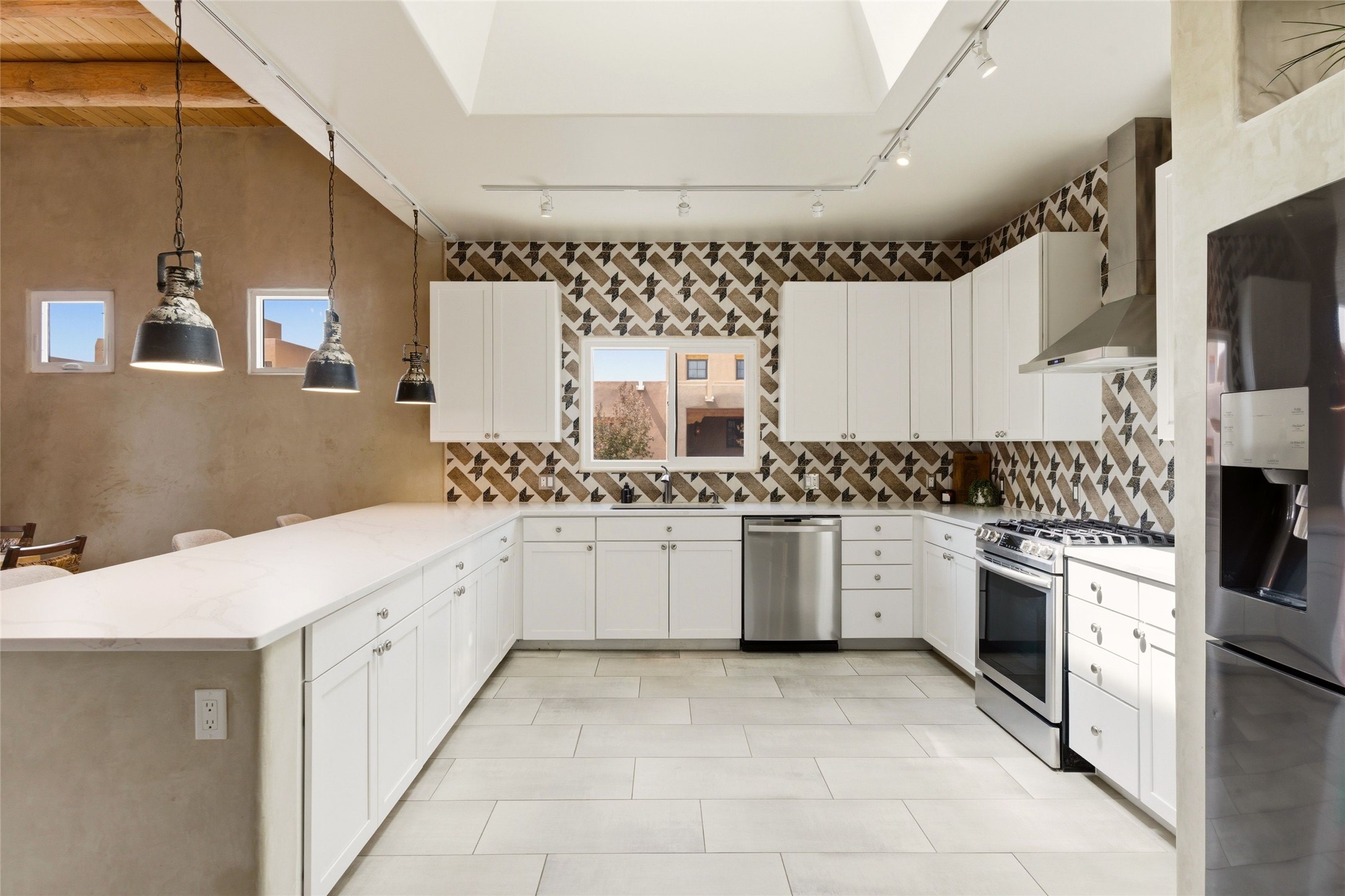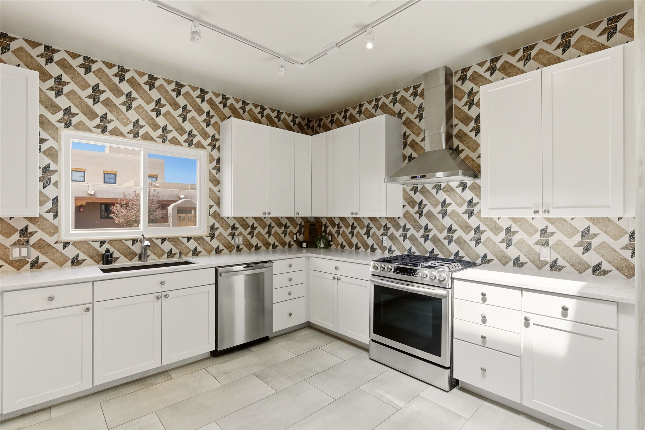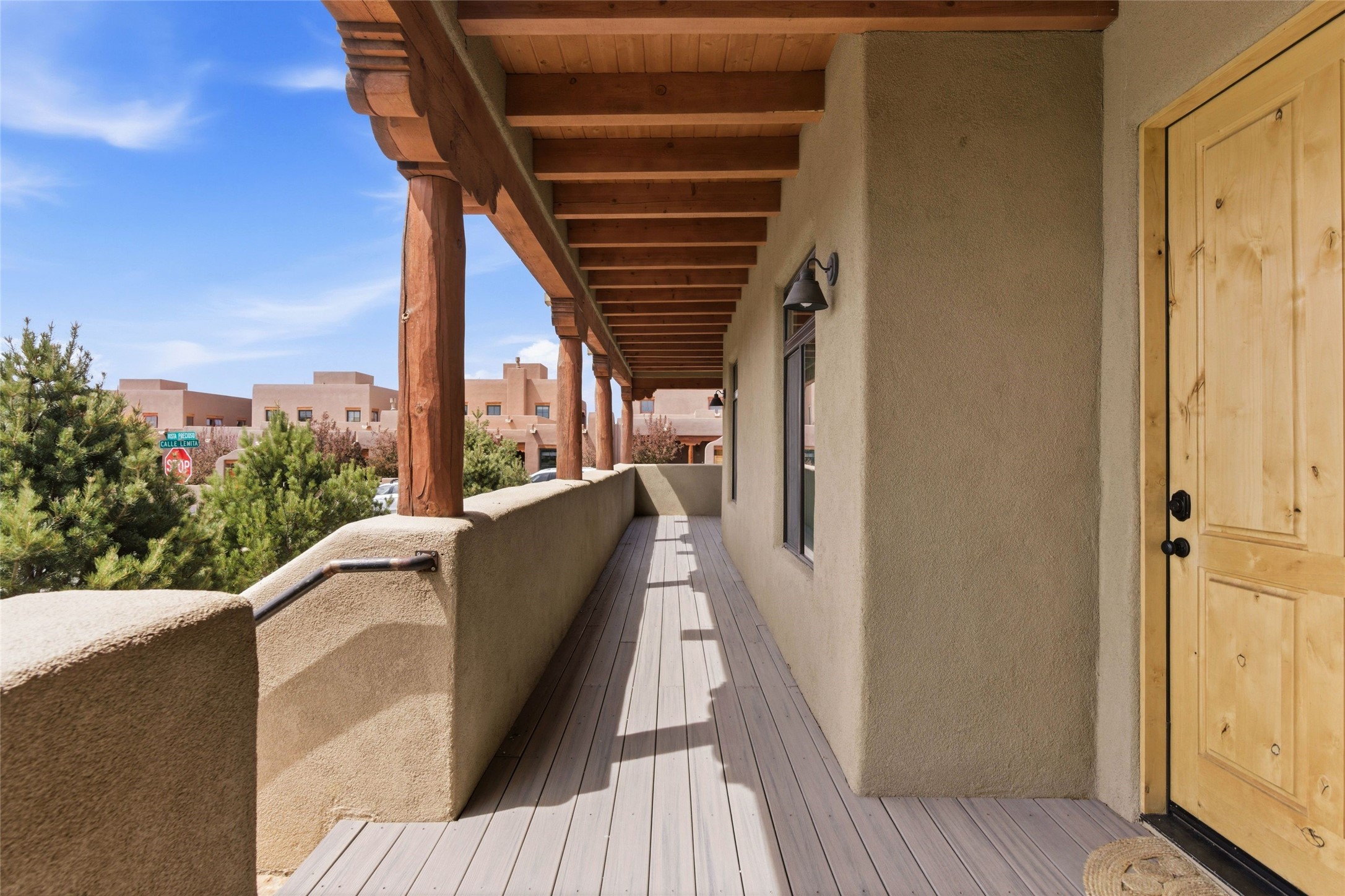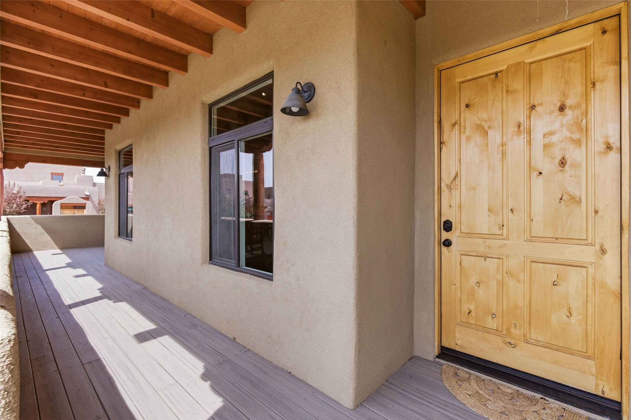 Sophistication meets Santa Fe charm at 32 Calle Lemita, an elegant residence in the coveted Aldea de Santa Fe community. This 3-bed, 3-bath home offers refined living on a 0.16-acre lot with stunning natural light and partial sunset views. The open, airy floor plan highlights soaring ceilings, rich finishes, and seamless flow between living, dining, and kitchen--perfect for stylish entertaining. The expansive living room offers a stacked stone fireplace, high ceilings and traditional Vigas. Plaster walls throughout the main living area. The chef's kitchen boasts premium cabinetry with soft close drawers, generous counter space with quartz countertops, designer tile backsplash and high-end stainless steel appliances. Massive pantry/storage room off the kitchen. The luxurious primary suite offers a spa-inspired bath, one of the most custom walk-in closets you will ever view, plus separate shower and jacuzzi tub. Two additional oversized bedrooms provide versatility for guests or a home office. Laundry room with sink and built-in cabinetry. Whole house radiant cooling/heating system. Adjacent to the heated/cooled 4 car garage is a flex room, perfect for a home gym or studio space. Outdoor living shines with a private enclosed courtyard and elevated patio designed to capture Santa Fe's dramatic sunsets. Lots of wonderful upgrades, such as LED recessed lights, floor to ceiling tile in multiple bathrooms, carved stone sinks and much more. Located approximately 20 minutes from the historic Santa Fe plaza, Aldea de Santa Fe offers exclusive amenities including walking trails, pickleball/tennis/basketball, community gathering spaces, and easy access to fine dining, galleries, and world-class cultural events. This property is ideal as a sophisticated full-time residence or lock-and-leave retreat for discerning buyers seeking style, privacy, and connection to Santa Fe's vibrant lifestyle.