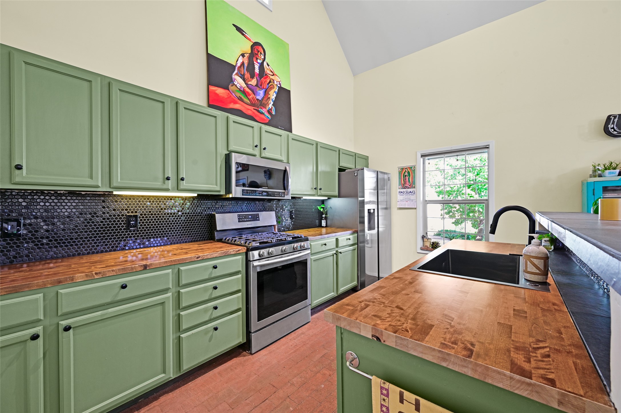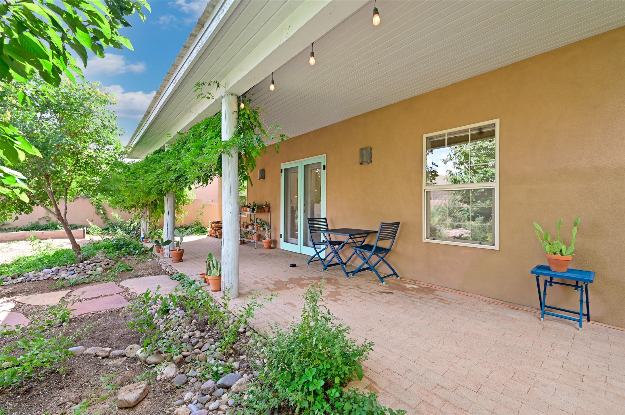 Welcome to your Northern New Mexico style home! This inviting 3 bedroom, 2 bath residence combines convenience and comfort. Enjoy an open floor plan in the living and kitchen areas, featuring a high pitched ceiling, fireplace and lots of natural light. Step out to the backyard with a charming portal and mature trees - perfect for outdoor dining and entertaining. The home includes radiant heat, a modern kitchen and a direct entry 2 car garage. At the end of the street, you'll find the Acequia Bike Trail leading into the Railyard and a lush, green city park. Your new home awaits. (Short Term Rentals are not allowed)