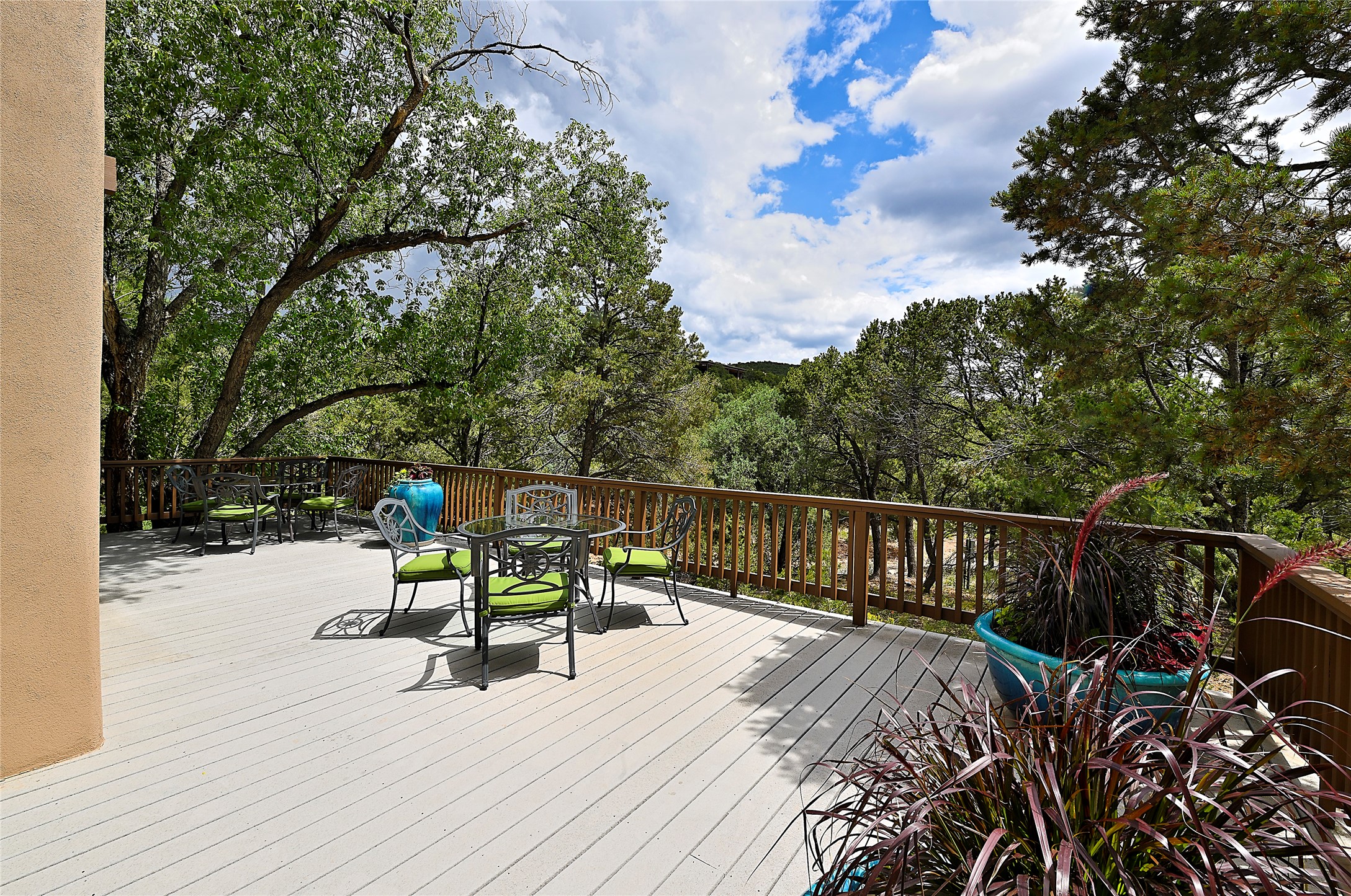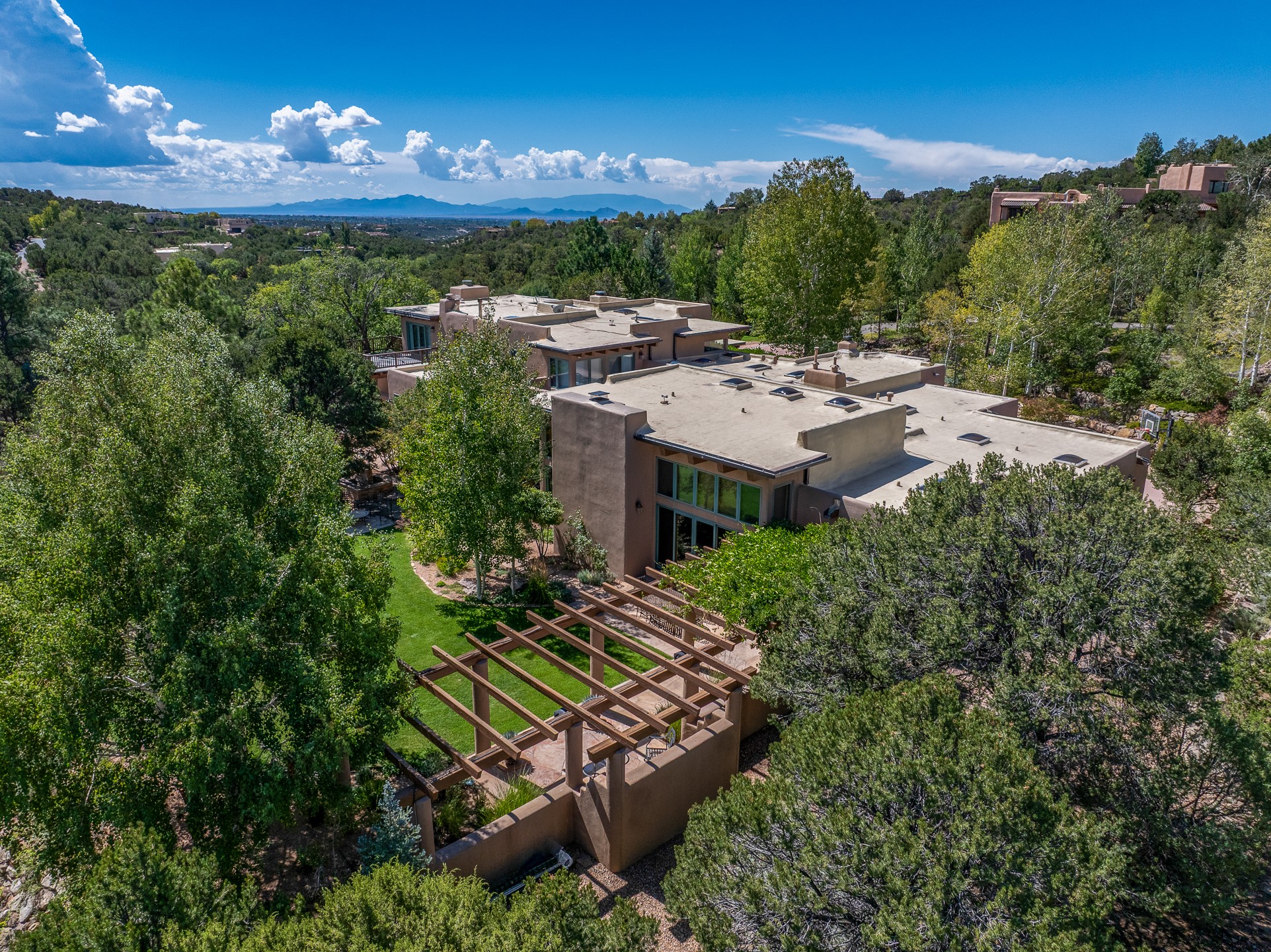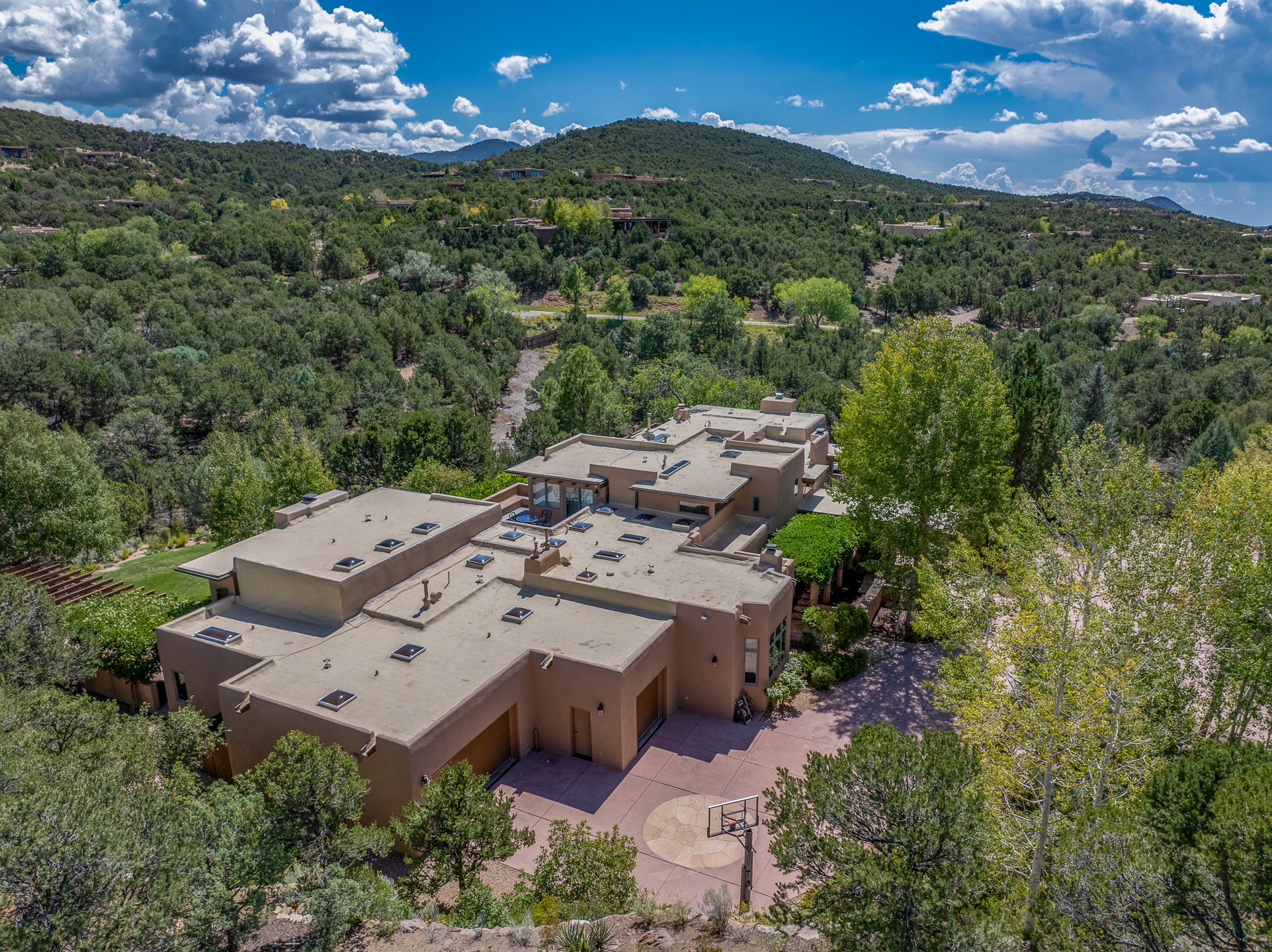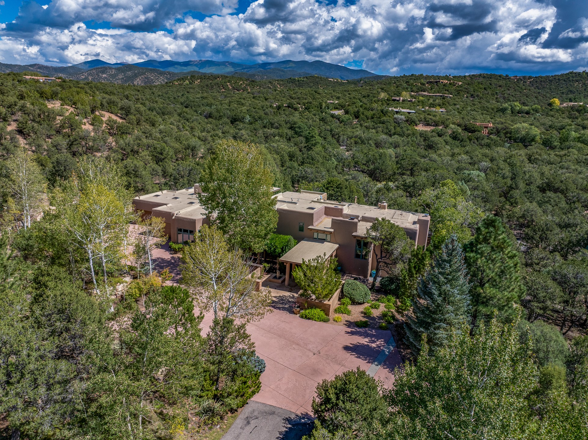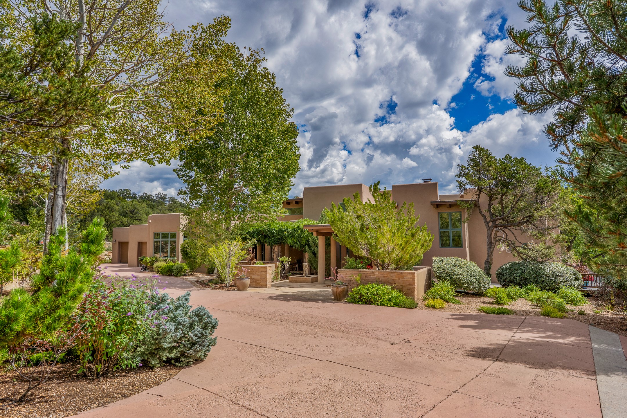 Perched on more than 3 lush acres in one of Santa Fe's most coveted enclaves, this exceptional estate offers a rare blend of privacy, space, and natural beauty, all less than 10 minutes from the Plaza and just a short walk from the city's extensive mountain trail system. Thoughtfully designed across two connected wings, the residence features five bedrooms and a graceful mix of expansive gathering spaces and intimate retreats, making it ideal for multigenerational living, entertaining, or a creative haven. The main level is designed for effortless single-level living and includes formal and informal living areas, two well-equipped kitchens, three bedrooms, a game room, and an attached three-car garage, with one bedroom serving as a spacious suite with its own private entrance. A sauna and steam room enhance the main-level guest bath. Multiple portals, decks, and lawn areas create seamless indoor-outdoor living, surrounded by towering aspens, ponderosa pines, and pions, manicured gardens, tranquil water features, and mountain views. Upstairs, two generous en-suite bedrooms open to private view decks, offering peaceful spaces for rest and retreat. Connected to city utilities and equipped with central heating and air conditioning, the home has been meticulously maintained for comfort, durability, and ease. Schedule your tour today of this stunning and versatile property.