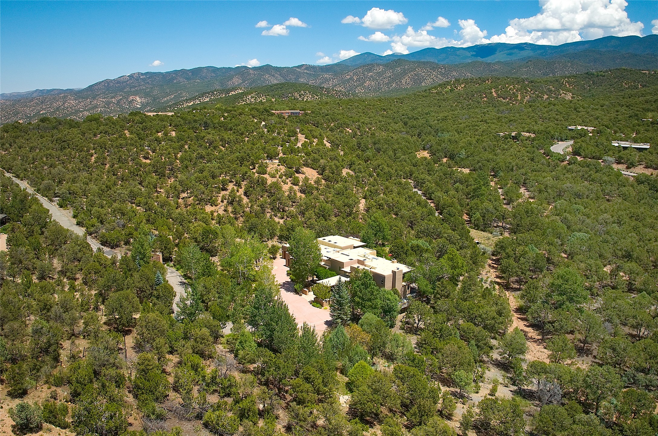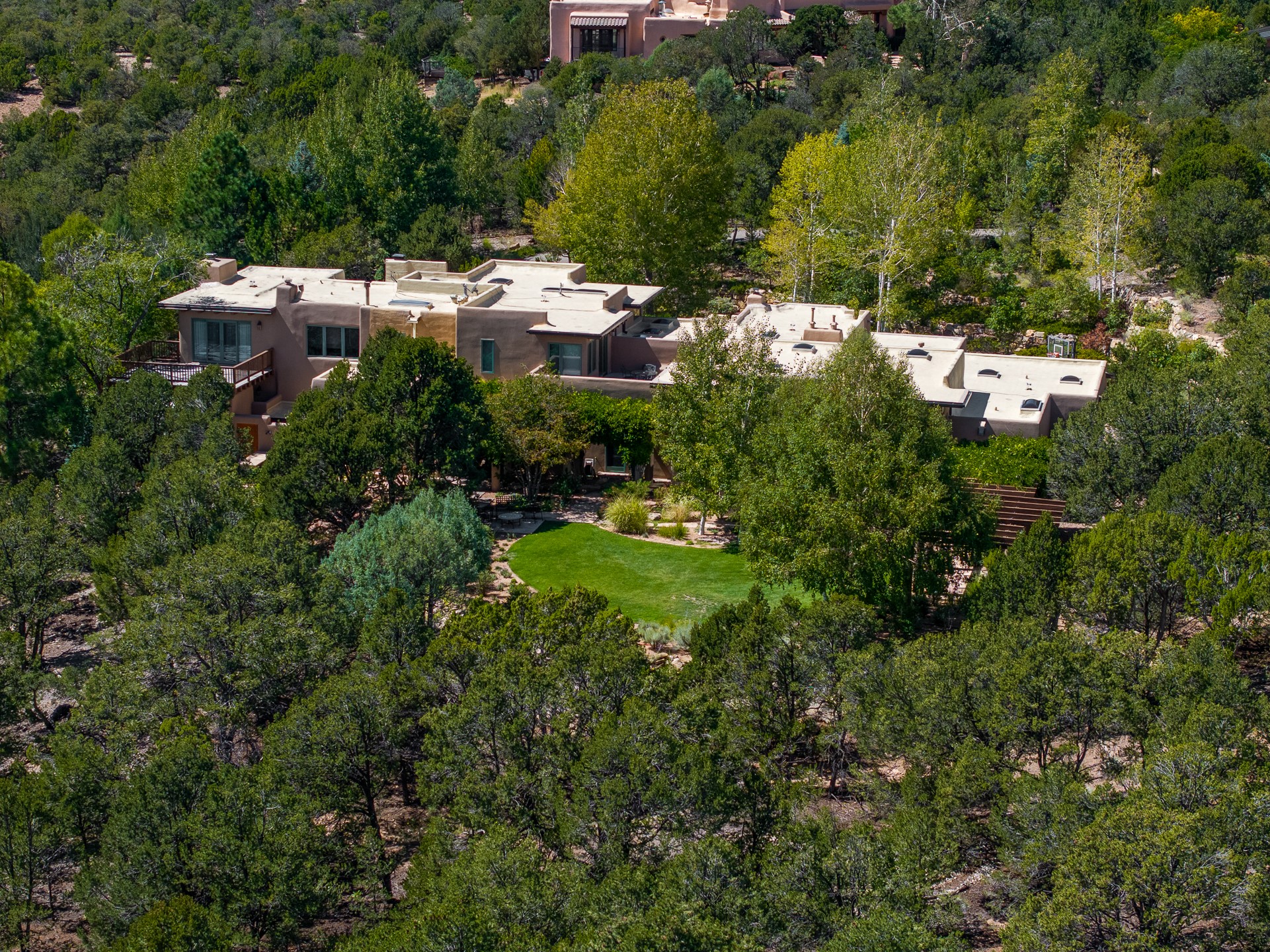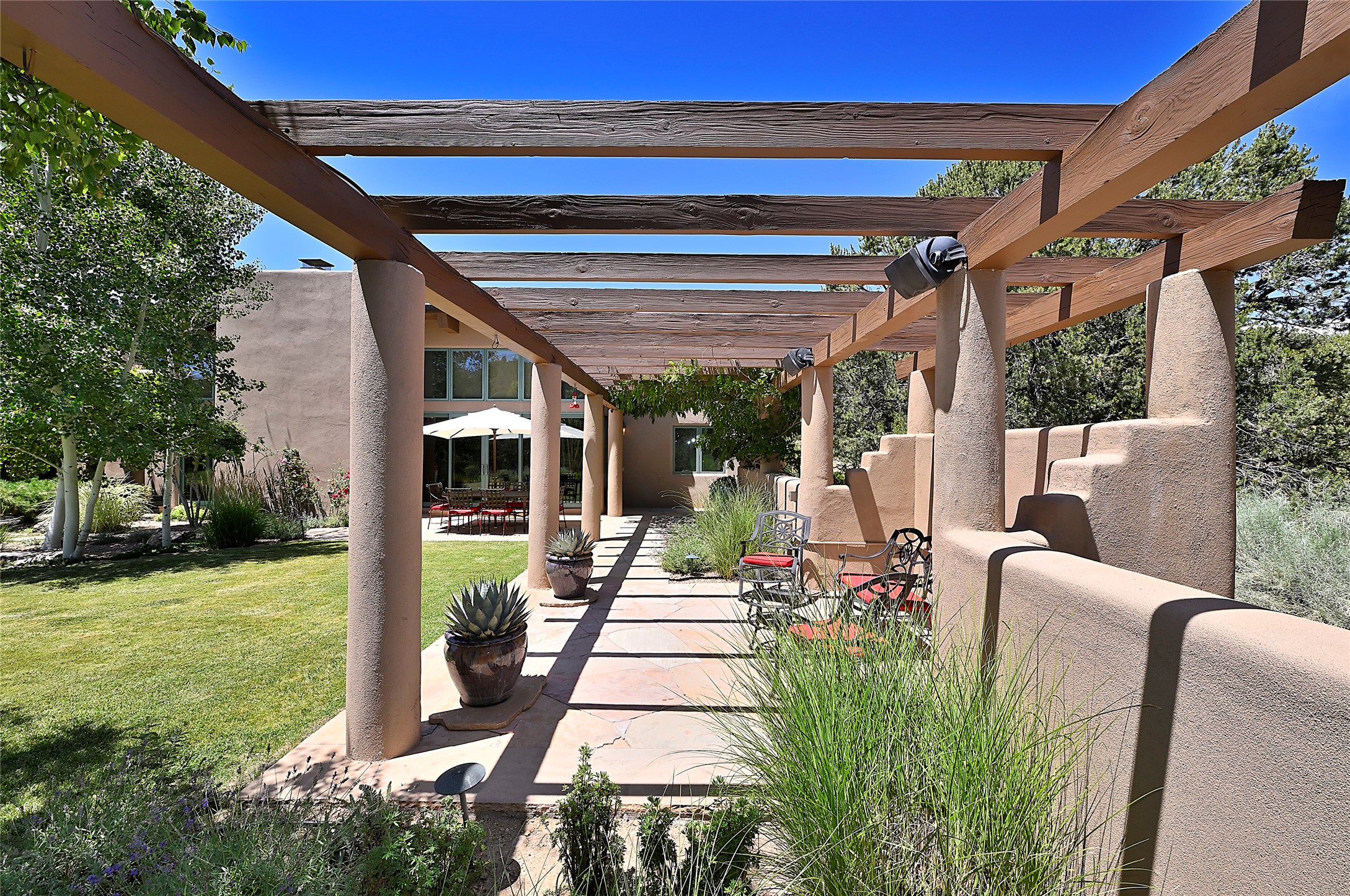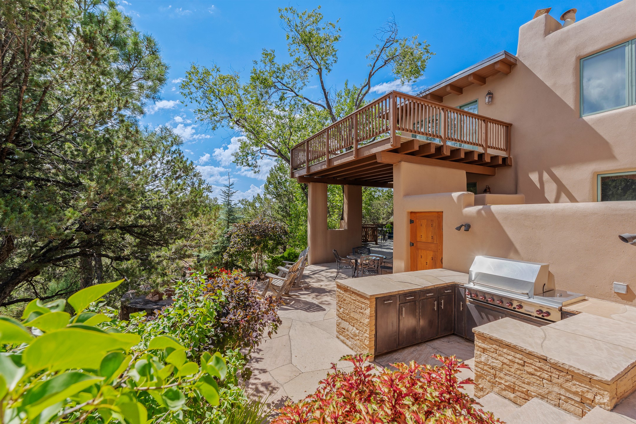 Perched on more than 3 lush acres in one of Santa Fe's most coveted enclaves, this exceptional estate offers a rare blend of privacy, space, and natural beauty, all less than 10 minutes from the Plaza and just a short walk from the city's extensive mountain trail system. Thoughtfully designed across two connected wings, the residence features five bedrooms and a graceful mix of expansive gathering spaces and intimate retreats, making it ideal for multigenerational living, entertaining, or a creative haven. The main level is designed for effortless single-level living and includes formal and informal living areas, two well-equipped kitchens, three bedrooms, a game room, and an attached three-car garage, with one bedroom serving as a spacious suite with its own private entrance. A sauna and steam room enhance the main-level guest bath. Multiple portals, decks, and lawn areas create seamless indoor-outdoor living, surrounded by towering aspens, ponderosa pines, and pions, manicured gardens, tranquil water features, and mountain views. Upstairs, two generous en-suite bedrooms open to private view decks, offering peaceful spaces for rest and retreat. Connected to city utilities and equipped with central heating and air conditioning, the home has been meticulously maintained for comfort, durability, and ease. Schedule your tour today of this stunning and versatile property.