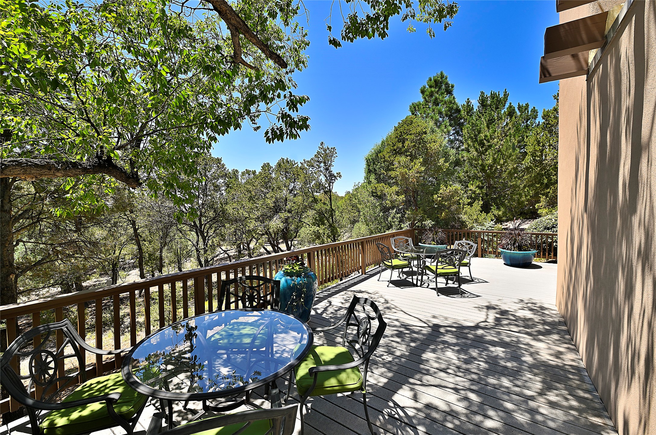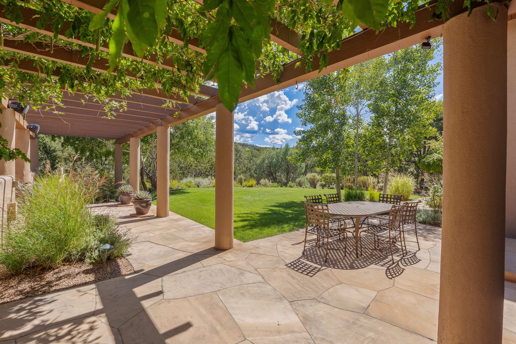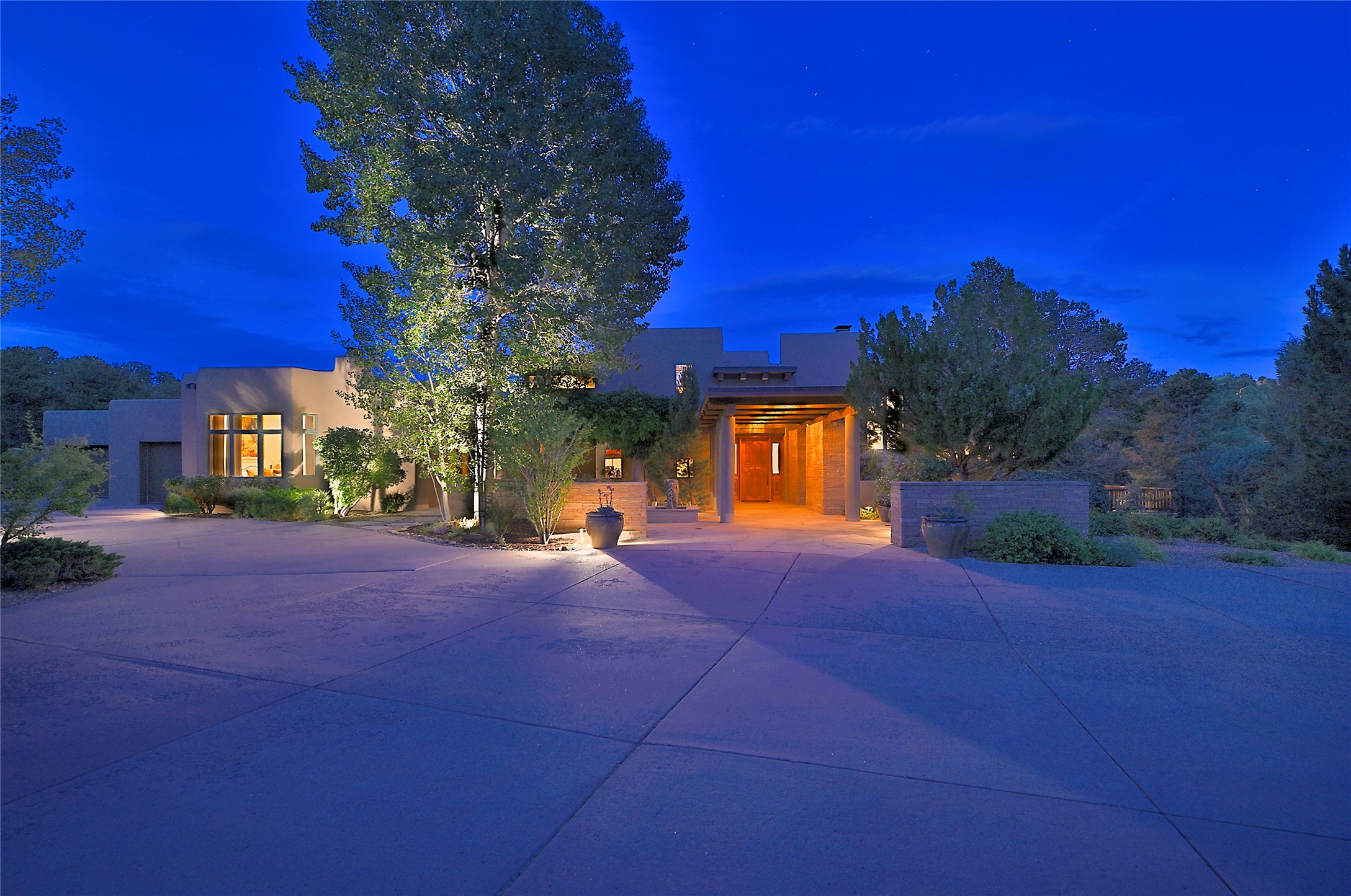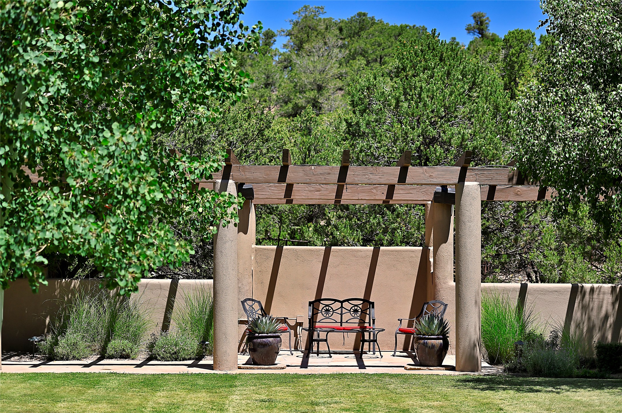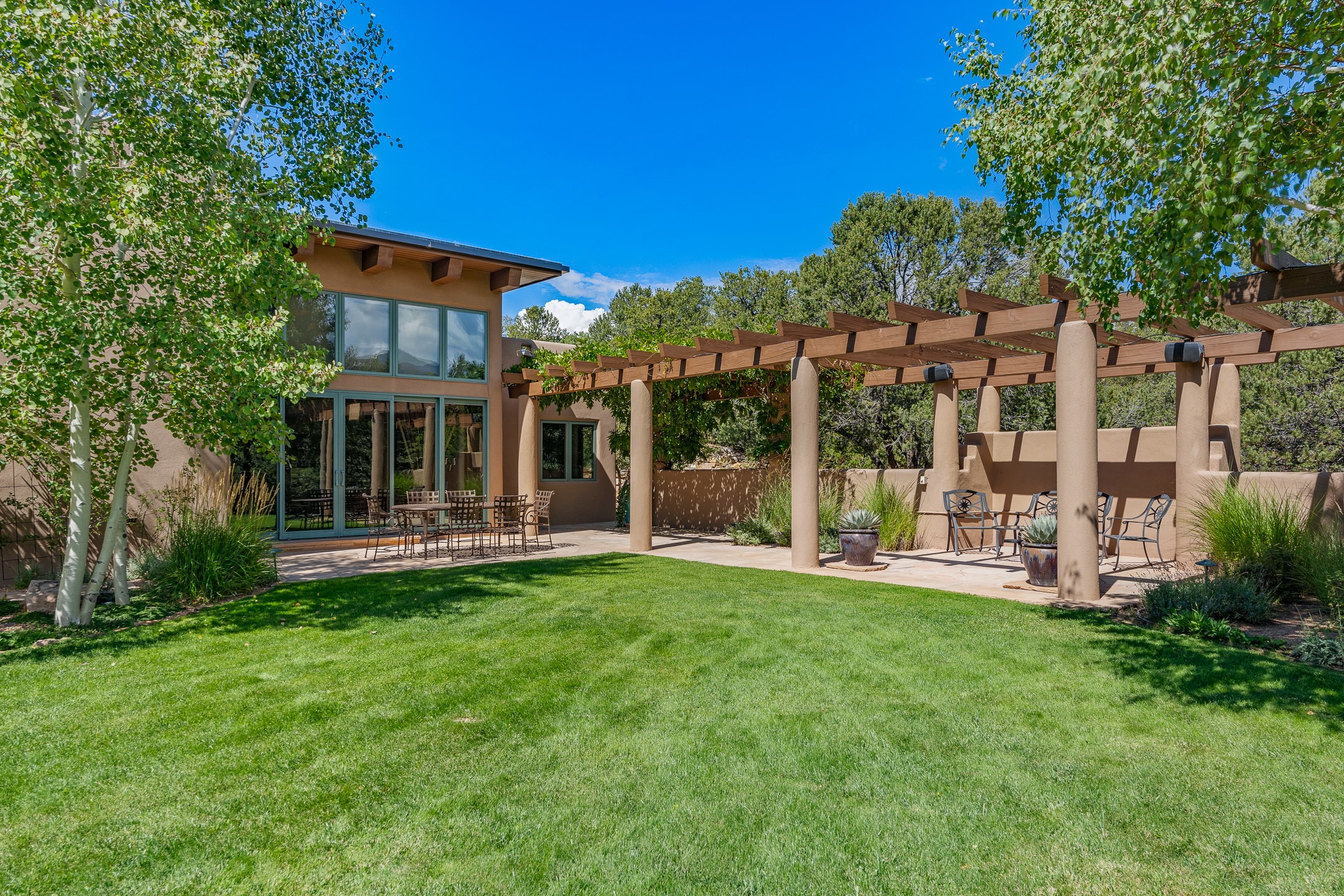 Perched on more than 3 lush acres in one of Santa Fe's most coveted enclaves, this exceptional estate offers a rare blend of privacy, space, and natural beauty, all less than 10 minutes from the Plaza and just a short walk from the city's extensive mountain trail system. Thoughtfully designed across two connected wings, the residence features five bedrooms and a graceful mix of expansive gathering spaces and intimate retreats, making it ideal for multigenerational living, entertaining, or a creative haven. The main level is designed for effortless single-level living and includes formal and informal living areas, two well-equipped kitchens, three bedrooms, a game room, and an attached three-car garage, with one bedroom serving as a spacious suite with its own private entrance. A sauna and steam room enhance the main-level guest bath. Multiple portals, decks, and lawn areas create seamless indoor-outdoor living, surrounded by towering aspens, ponderosa pines, and pions, manicured gardens, tranquil water features, and mountain views. Upstairs, two generous en-suite bedrooms open to private view decks, offering peaceful spaces for rest and retreat. Connected to city utilities and equipped with central heating and air conditioning, the home has been meticulously maintained for comfort, durability, and ease. Schedule your tour today of this stunning and versatile property.