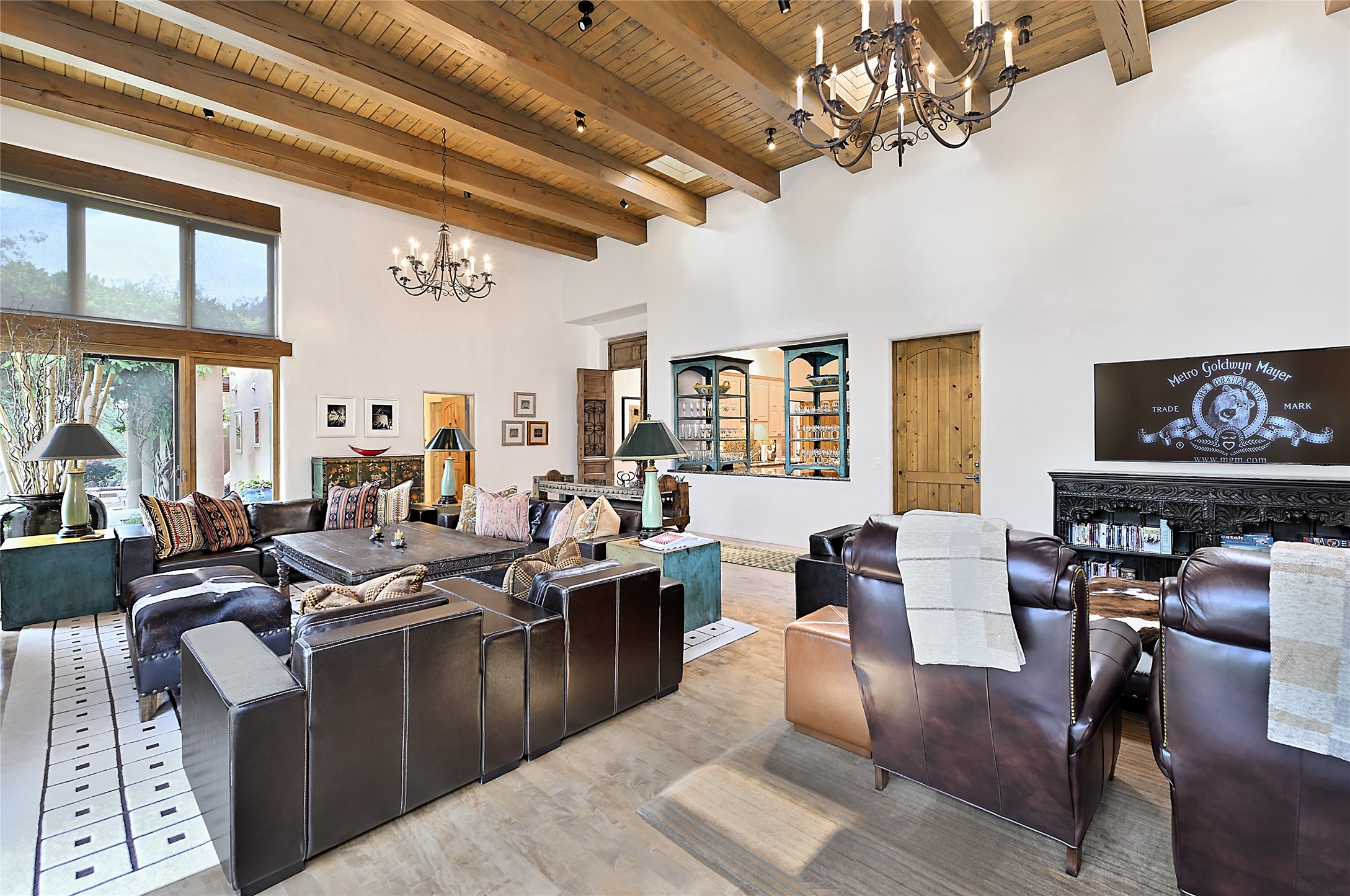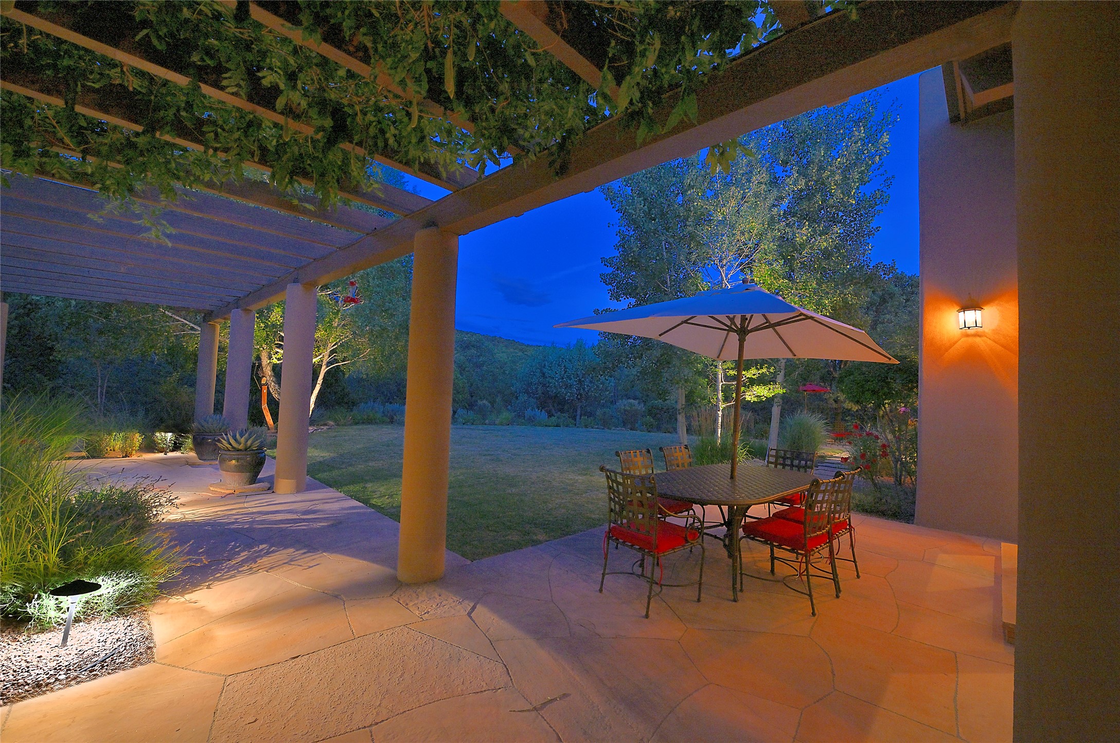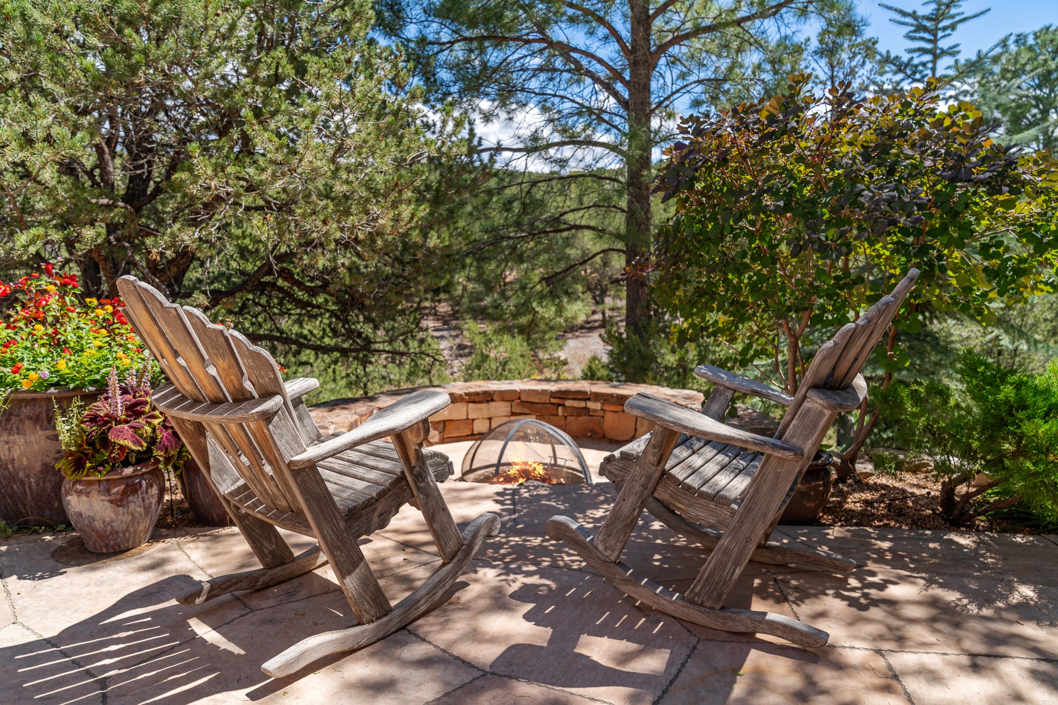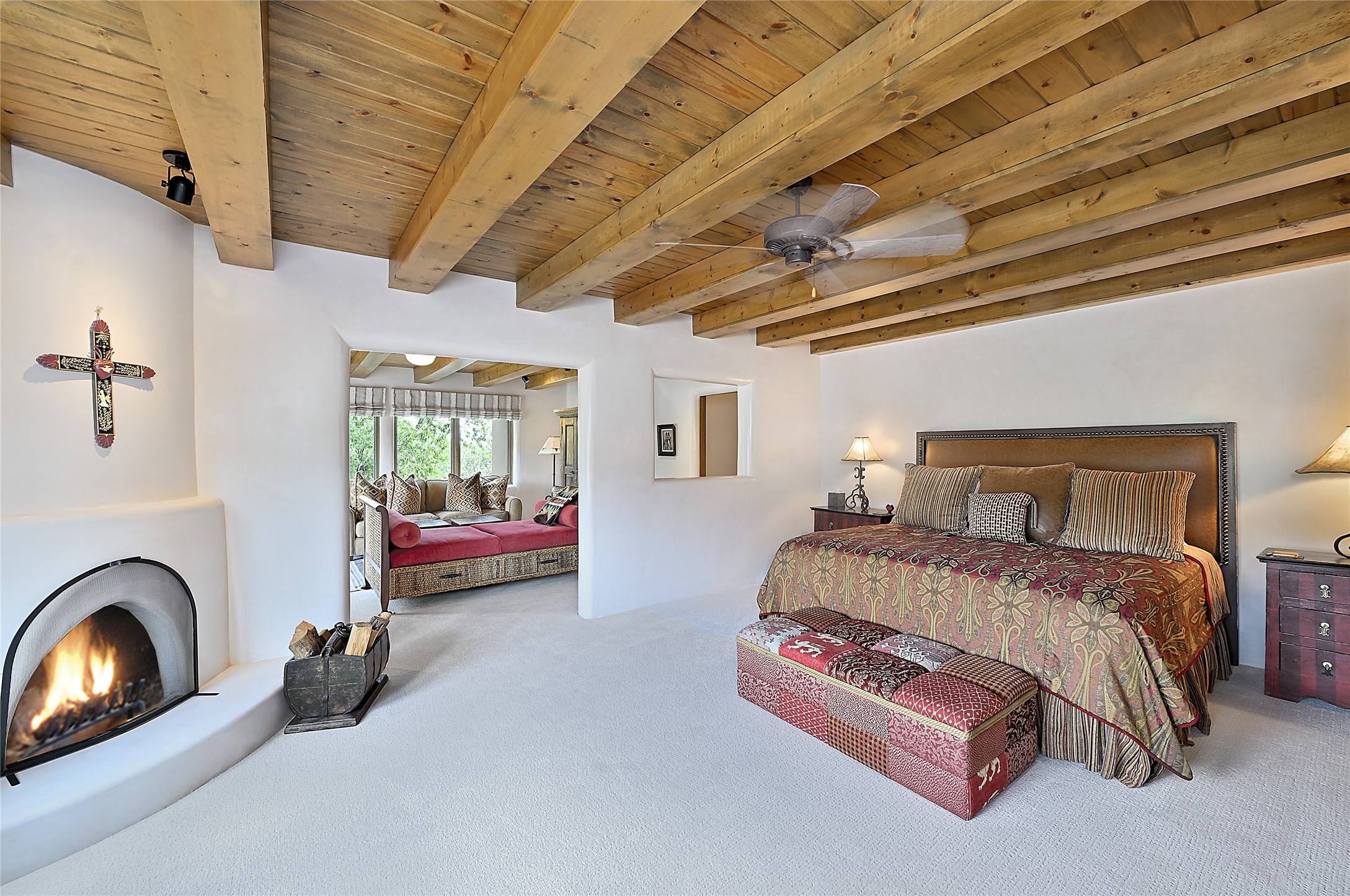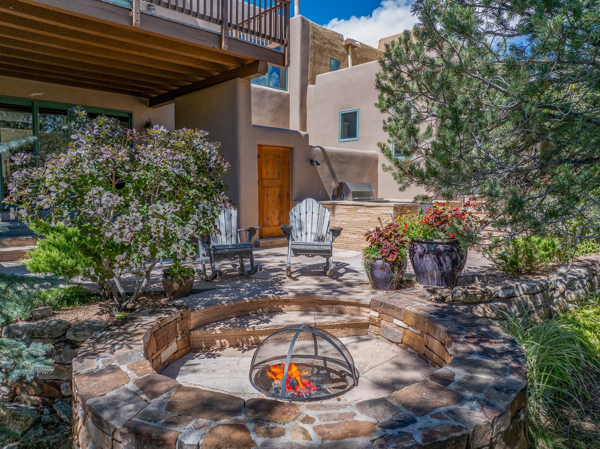 Perched on more than 3 lush acres in one of Santa Fe's most coveted enclaves, this exceptional estate offers a rare blend of privacy, space, and natural beauty, all less than 10 minutes from the Plaza and just a short walk from the city's extensive mountain trail system. Thoughtfully designed across two connected wings, the residence features five bedrooms and a graceful mix of expansive gathering spaces and intimate retreats, making it ideal for multigenerational living, entertaining, or a creative haven. The main level is designed for effortless single-level living and includes formal and informal living areas, two well-equipped kitchens, three bedrooms, a game room, and an attached three-car garage, with one bedroom serving as a spacious suite with its own private entrance. A sauna and steam room enhance the main-level guest bath. Multiple portals, decks, and lawn areas create seamless indoor-outdoor living, surrounded by towering aspens, ponderosa pines, and pions, manicured gardens, tranquil water features, and mountain views. Upstairs, two generous en-suite bedrooms open to private view decks, offering peaceful spaces for rest and retreat. Connected to city utilities and equipped with central heating and air conditioning, the home has been meticulously maintained for comfort, durability, and ease. Schedule your tour today of this stunning and versatile property.