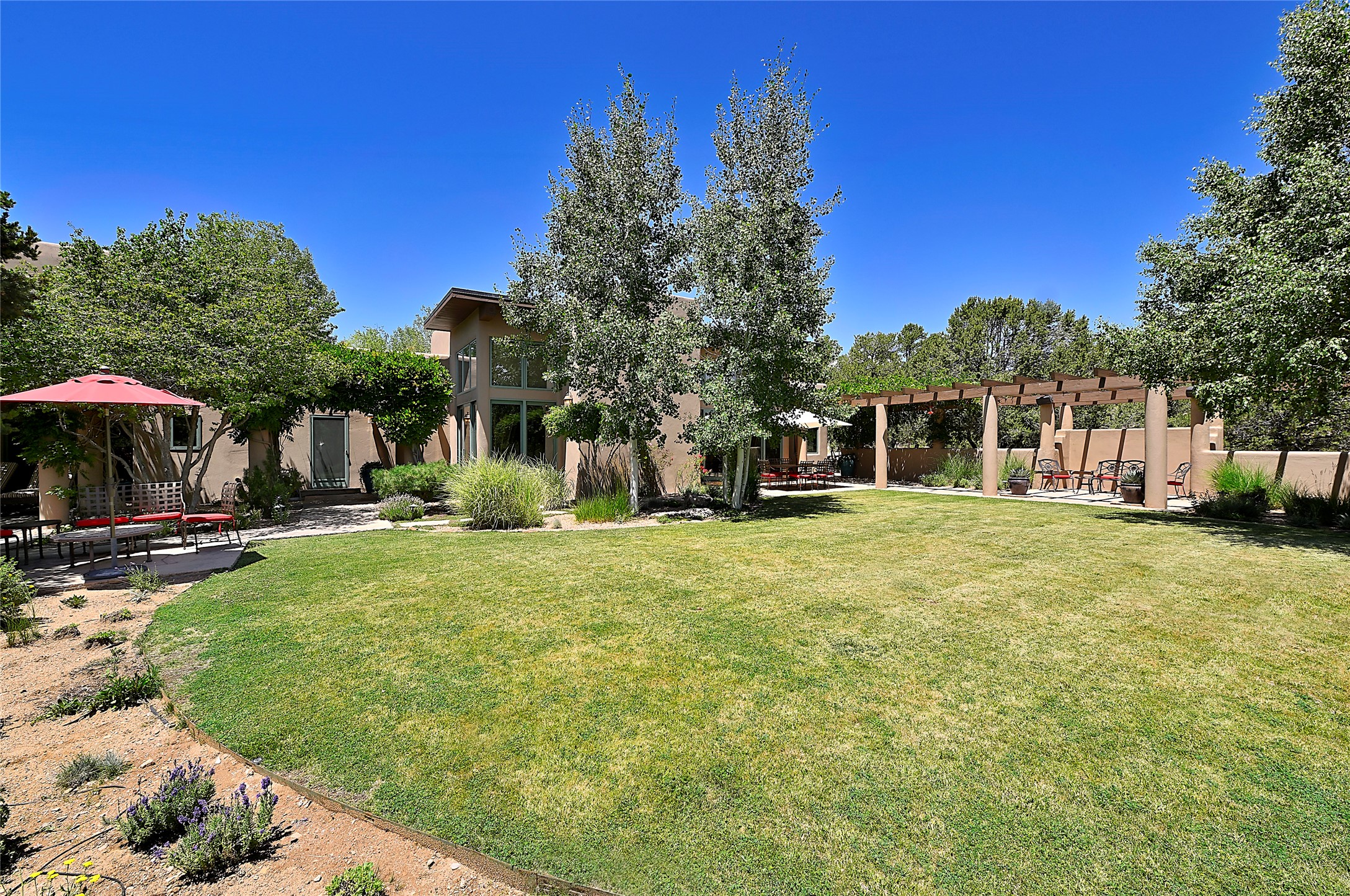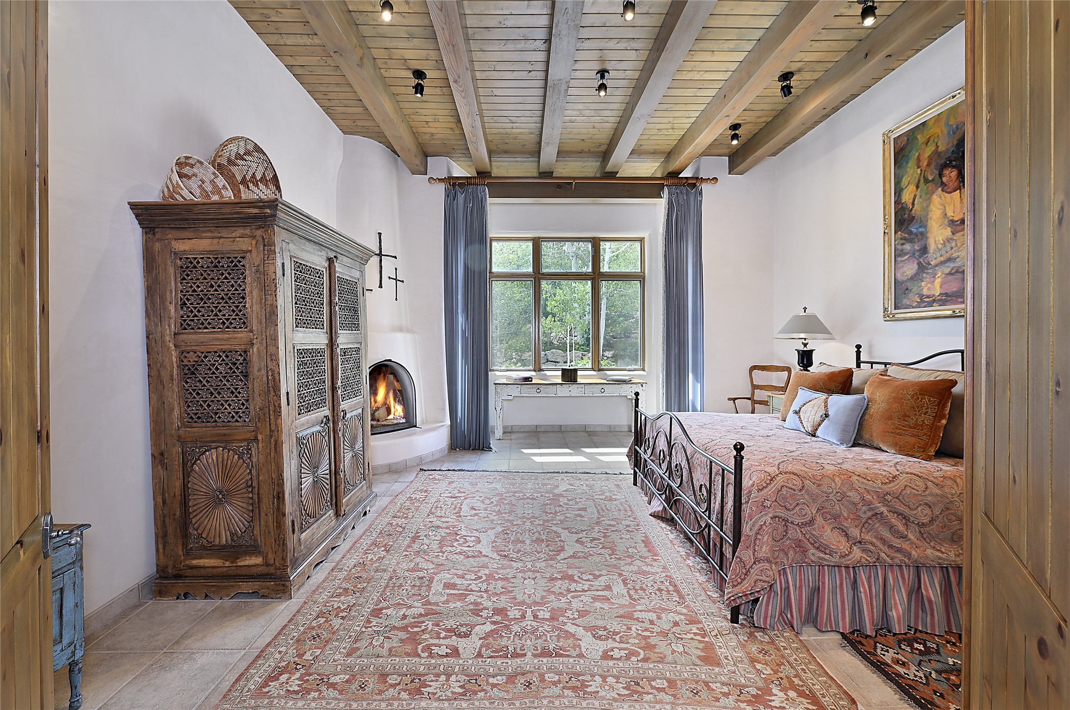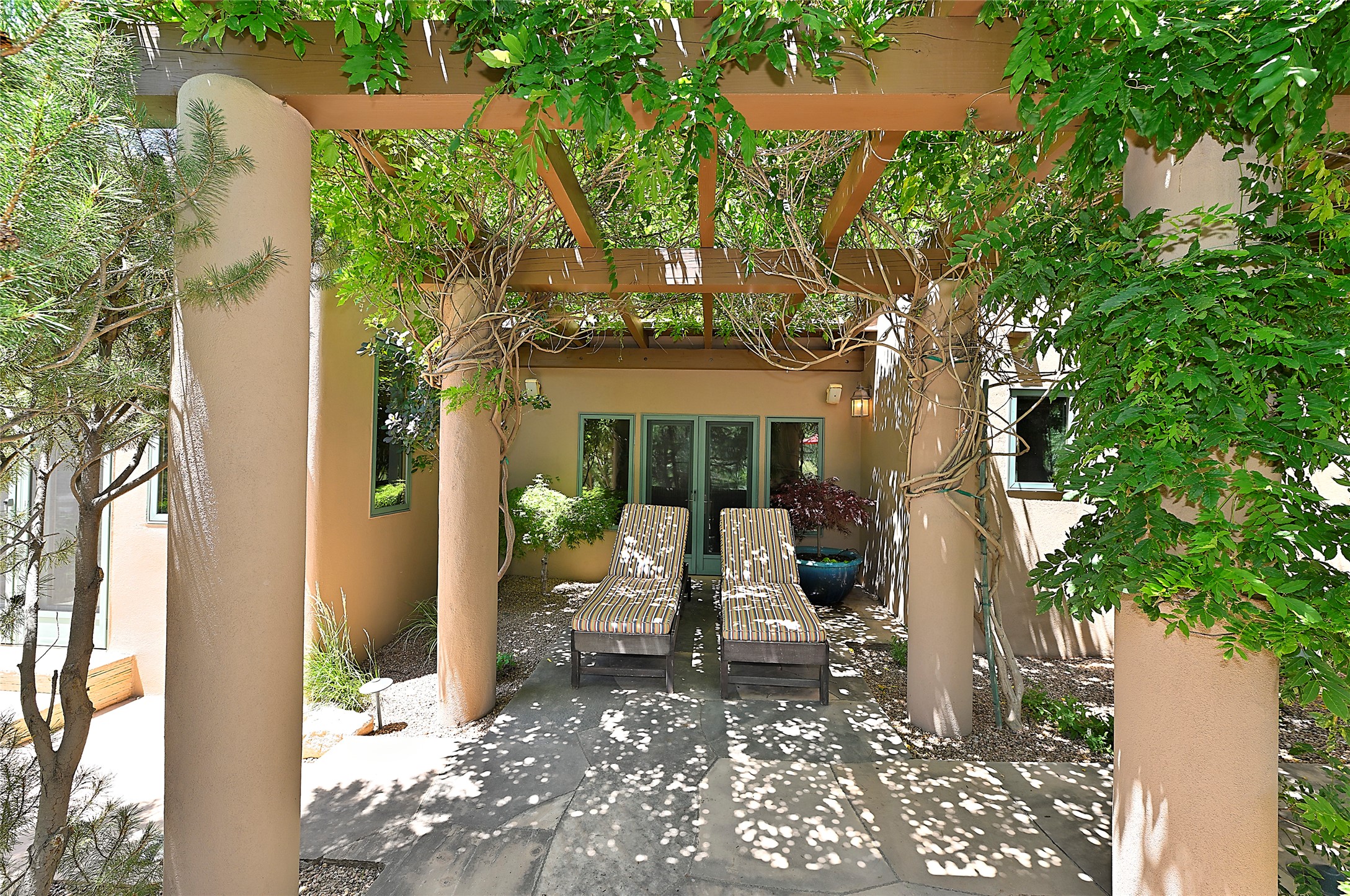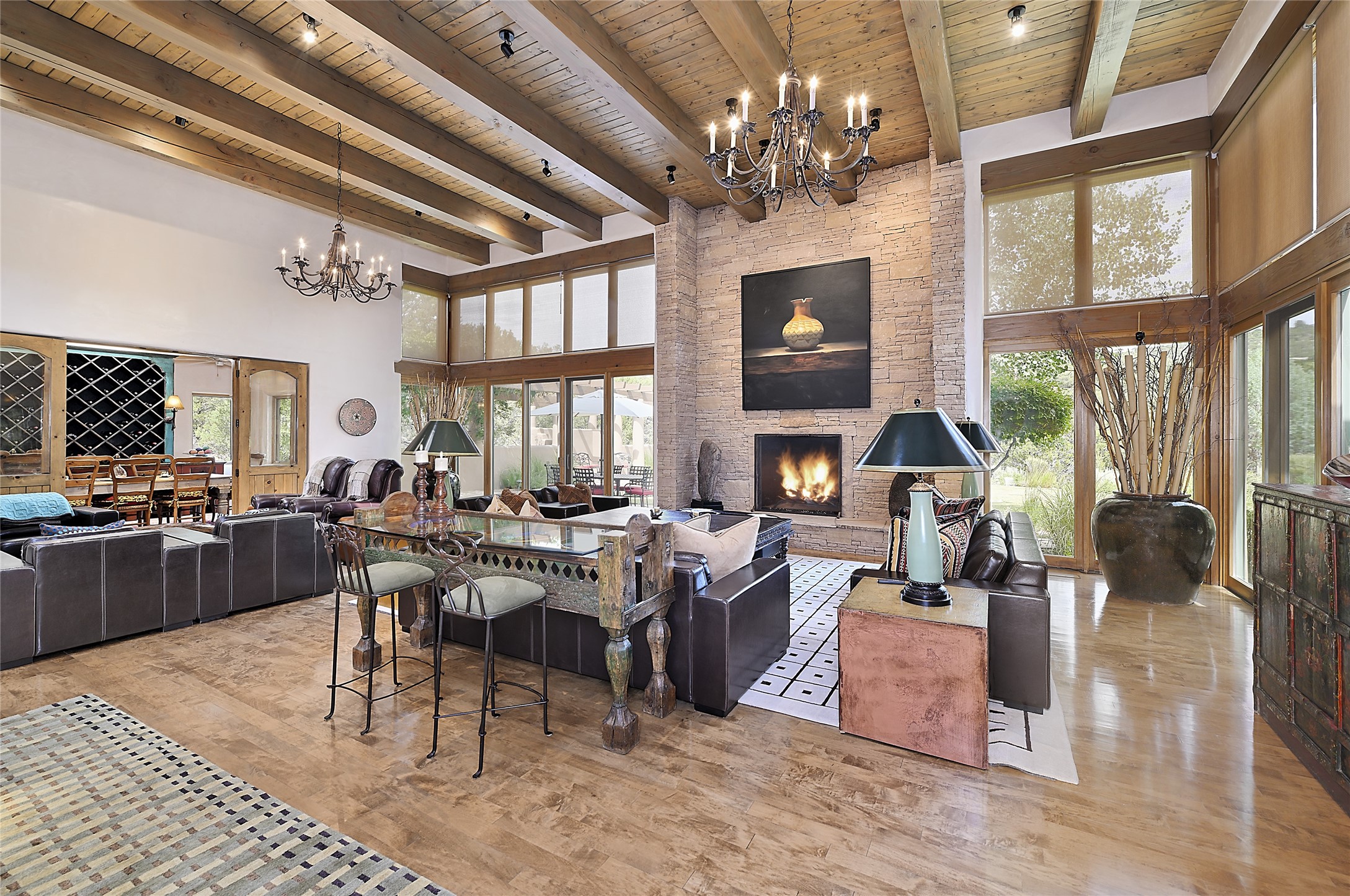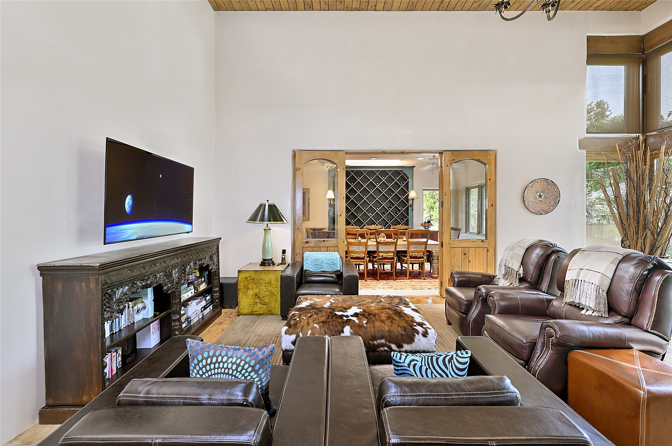 Perched on more than 3 lush acres in one of Santa Fe's most coveted enclaves, this exceptional estate offers a rare blend of privacy, space, and natural beauty, all less than 10 minutes from the Plaza and just a short walk from the city's extensive mountain trail system. Thoughtfully designed across two connected wings, the residence features five bedrooms and a graceful mix of expansive gathering spaces and intimate retreats, making it ideal for multigenerational living, entertaining, or a creative haven. The main level is designed for effortless single-level living and includes formal and informal living areas, two well-equipped kitchens, three bedrooms, a game room, and an attached three-car garage, with one bedroom serving as a spacious suite with its own private entrance. A sauna and steam room enhance the main-level guest bath. Multiple portals, decks, and lawn areas create seamless indoor-outdoor living, surrounded by towering aspens, ponderosa pines, and pions, manicured gardens, tranquil water features, and mountain views. Upstairs, two generous en-suite bedrooms open to private view decks, offering peaceful spaces for rest and retreat. Connected to city utilities and equipped with central heating and air conditioning, the home has been meticulously maintained for comfort, durability, and ease. Schedule your tour today of this stunning and versatile property.