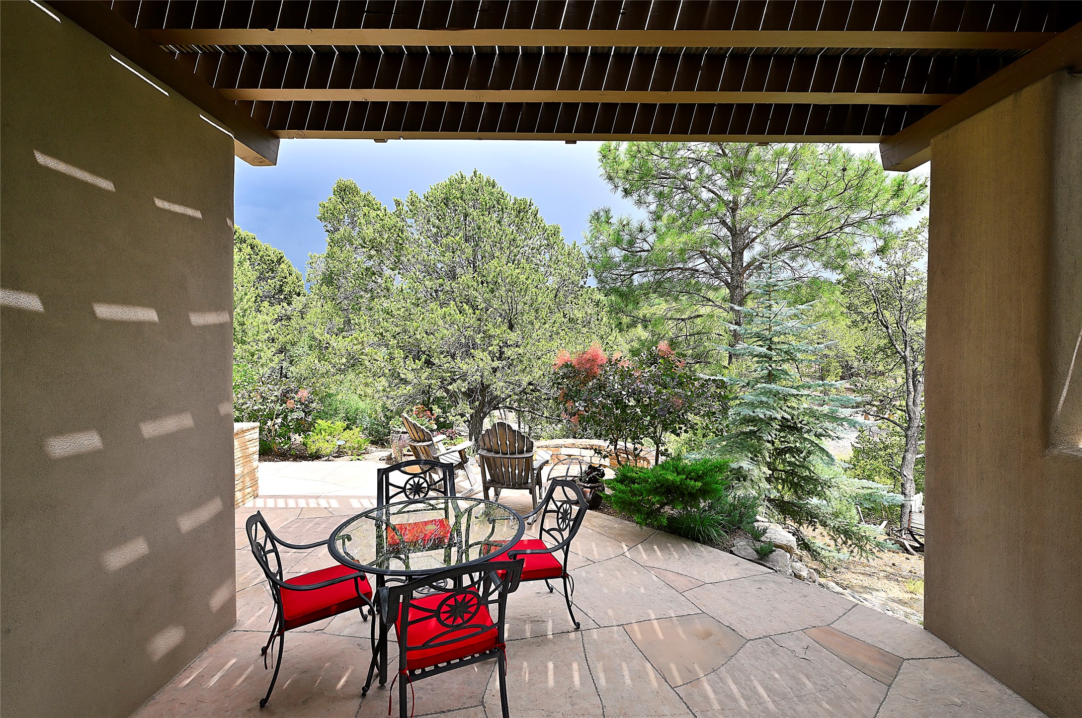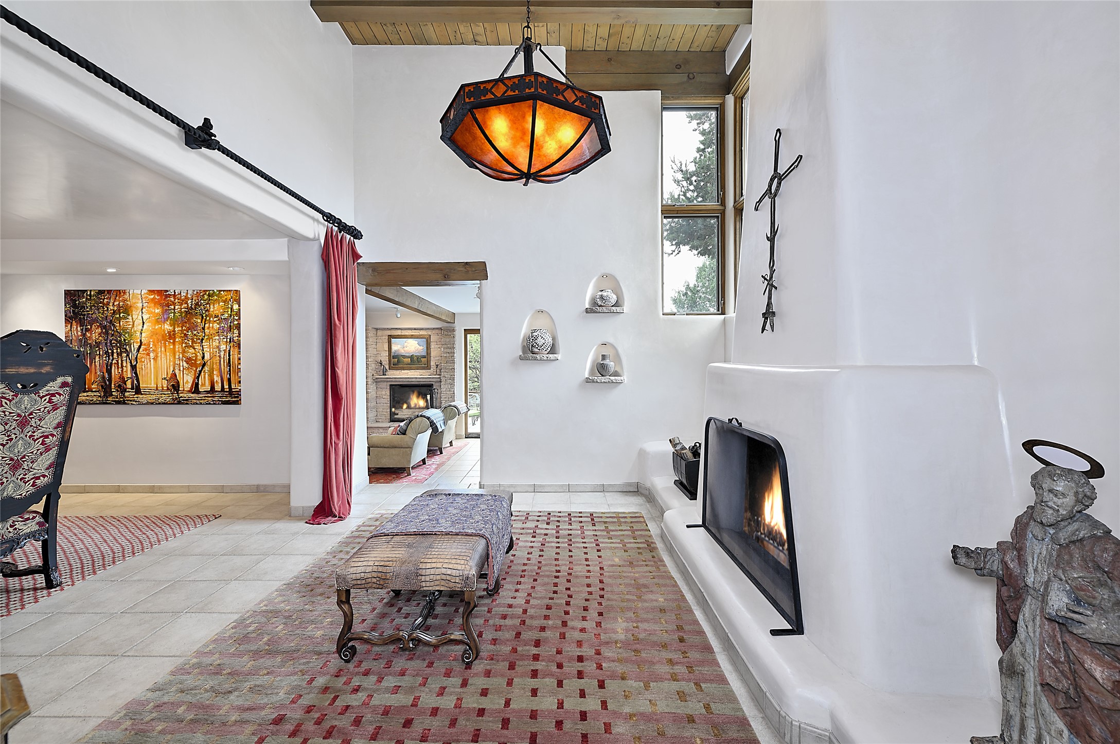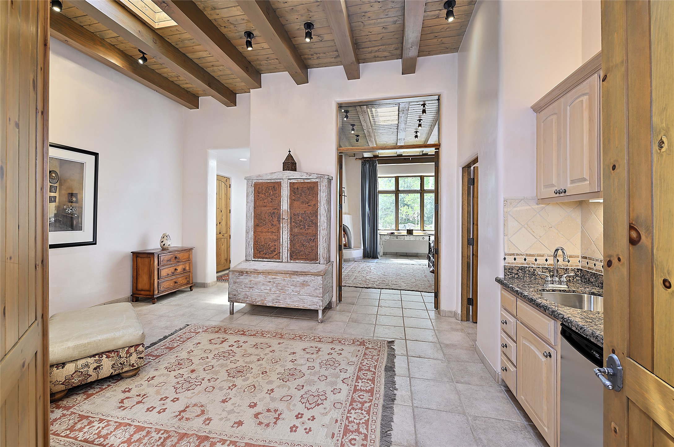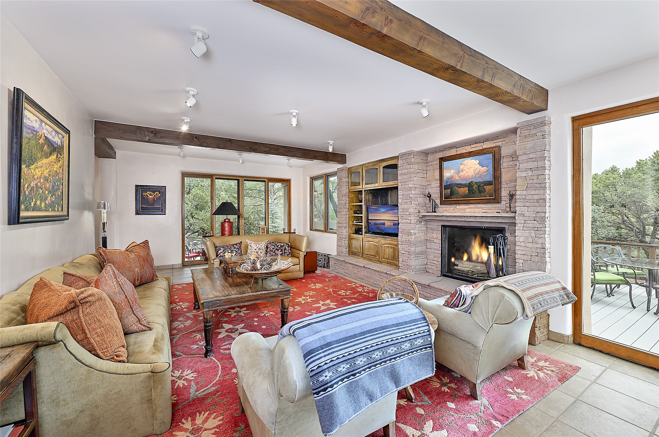 Perched on more than 3 lush acres in one of Santa Fe's most coveted enclaves, this exceptional estate offers a rare blend of privacy, space, and natural beauty, all less than 10 minutes from the Plaza and just a short walk from the city's extensive mountain trail system. Thoughtfully designed across two connected wings, the residence features five bedrooms and a graceful mix of expansive gathering spaces and intimate retreats, making it ideal for multigenerational living, entertaining, or a creative haven. The main level is designed for effortless single-level living and includes formal and informal living areas, two well-equipped kitchens, three bedrooms, a game room, and an attached three-car garage, with one bedroom serving as a spacious suite with its own private entrance. A sauna and steam room enhance the main-level guest bath. Multiple portals, decks, and lawn areas create seamless indoor-outdoor living, surrounded by towering aspens, ponderosa pines, and pions, manicured gardens, tranquil water features, and mountain views. Upstairs, two generous en-suite bedrooms open to private view decks, offering peaceful spaces for rest and retreat. Connected to city utilities and equipped with central heating and air conditioning, the home has been meticulously maintained for comfort, durability, and ease. Schedule your tour today of this stunning and versatile property.