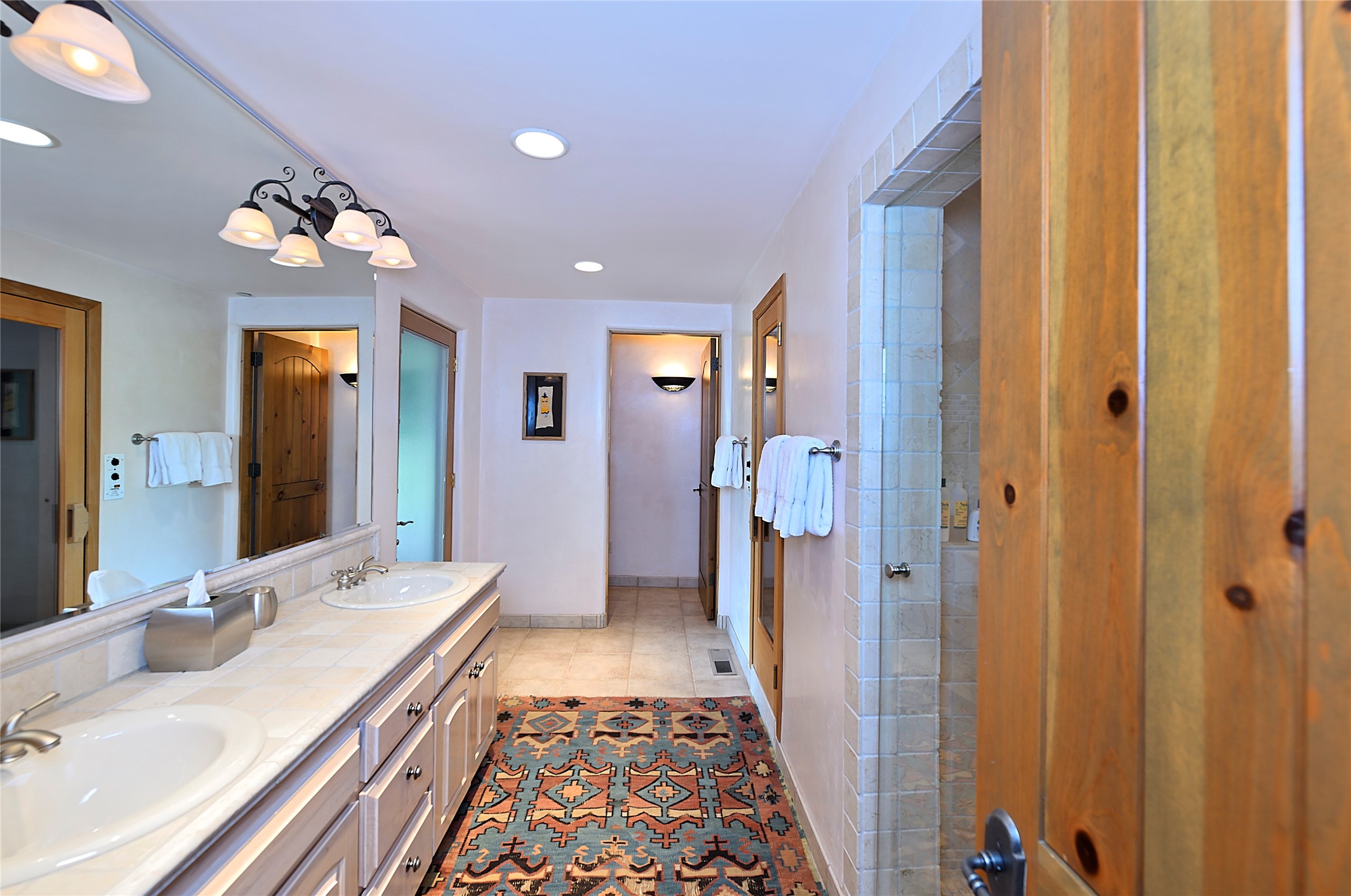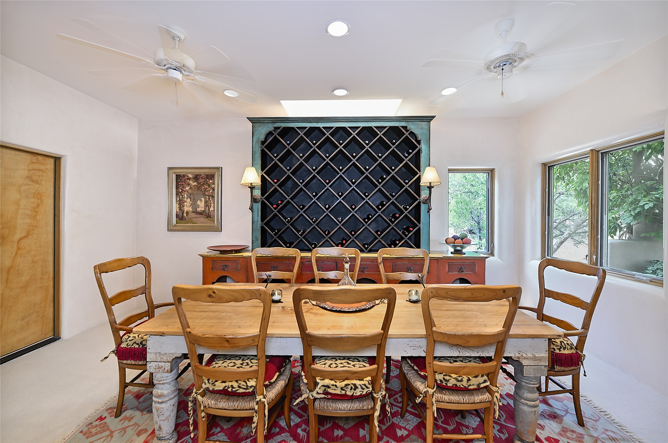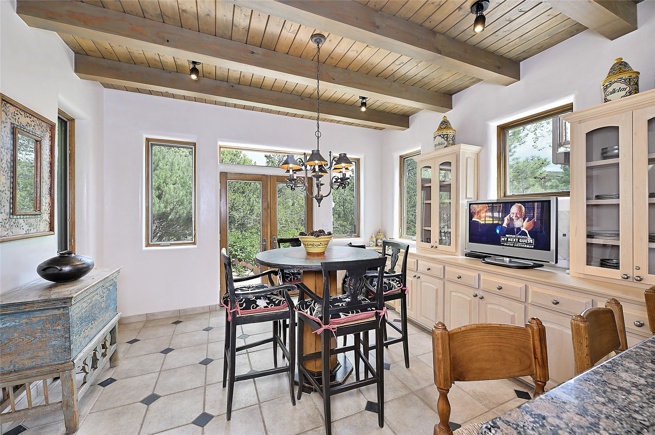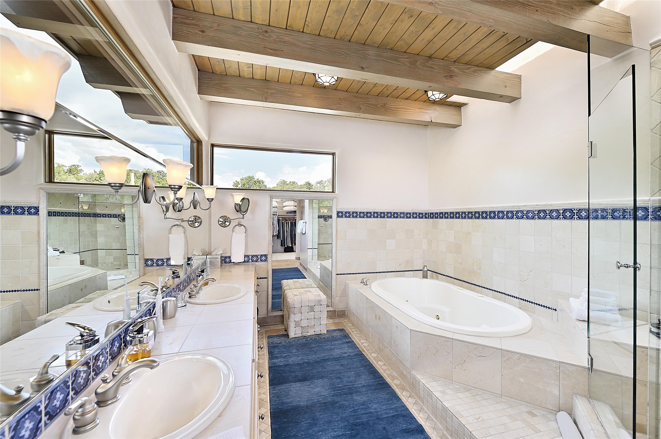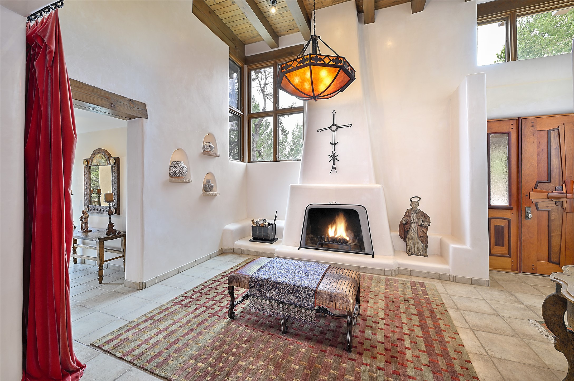 Perched on more than 3 lush acres in one of Santa Fe's most coveted enclaves, this exceptional estate offers a rare blend of privacy, space, and natural beauty, all less than 10 minutes from the Plaza and just a short walk from the city's extensive mountain trail system. Thoughtfully designed across two connected wings, the residence features five bedrooms and a graceful mix of expansive gathering spaces and intimate retreats, making it ideal for multigenerational living, entertaining, or a creative haven. The main level is designed for effortless single-level living and includes formal and informal living areas, two well-equipped kitchens, three bedrooms, a game room, and an attached three-car garage, with one bedroom serving as a spacious suite with its own private entrance. A sauna and steam room enhance the main-level guest bath. Multiple portals, decks, and lawn areas create seamless indoor-outdoor living, surrounded by towering aspens, ponderosa pines, and pions, manicured gardens, tranquil water features, and mountain views. Upstairs, two generous en-suite bedrooms open to private view decks, offering peaceful spaces for rest and retreat. Connected to city utilities and equipped with central heating and air conditioning, the home has been meticulously maintained for comfort, durability, and ease. Schedule your tour today of this stunning and versatile property.